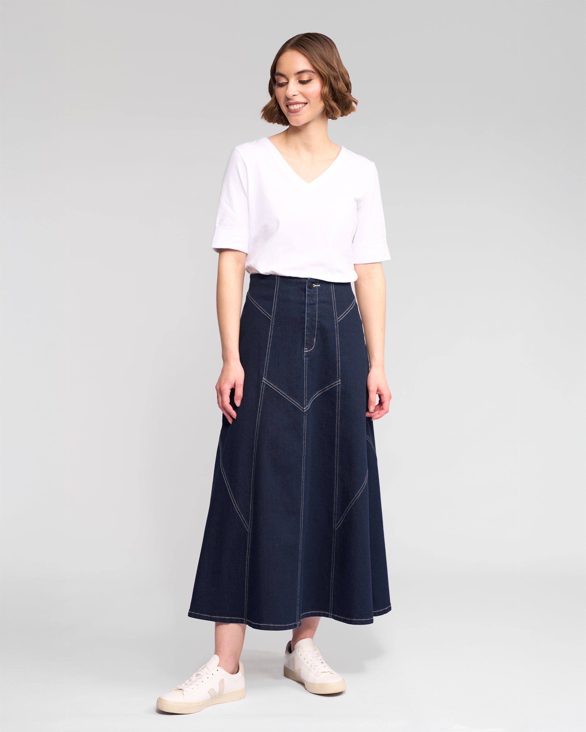 A flared denim skirt in our Ink Denim colourway — a deep, dark blue finished with crisp white contrast stitching. Designed with multiple structured panel seams throughout, this midi‑length style creates a softly flared silhouette with a clean, architectural feel. Finished with a zip fly and a black metal button featuring a subtle ‘V’ logo, it offers a modern take on everyday denim.