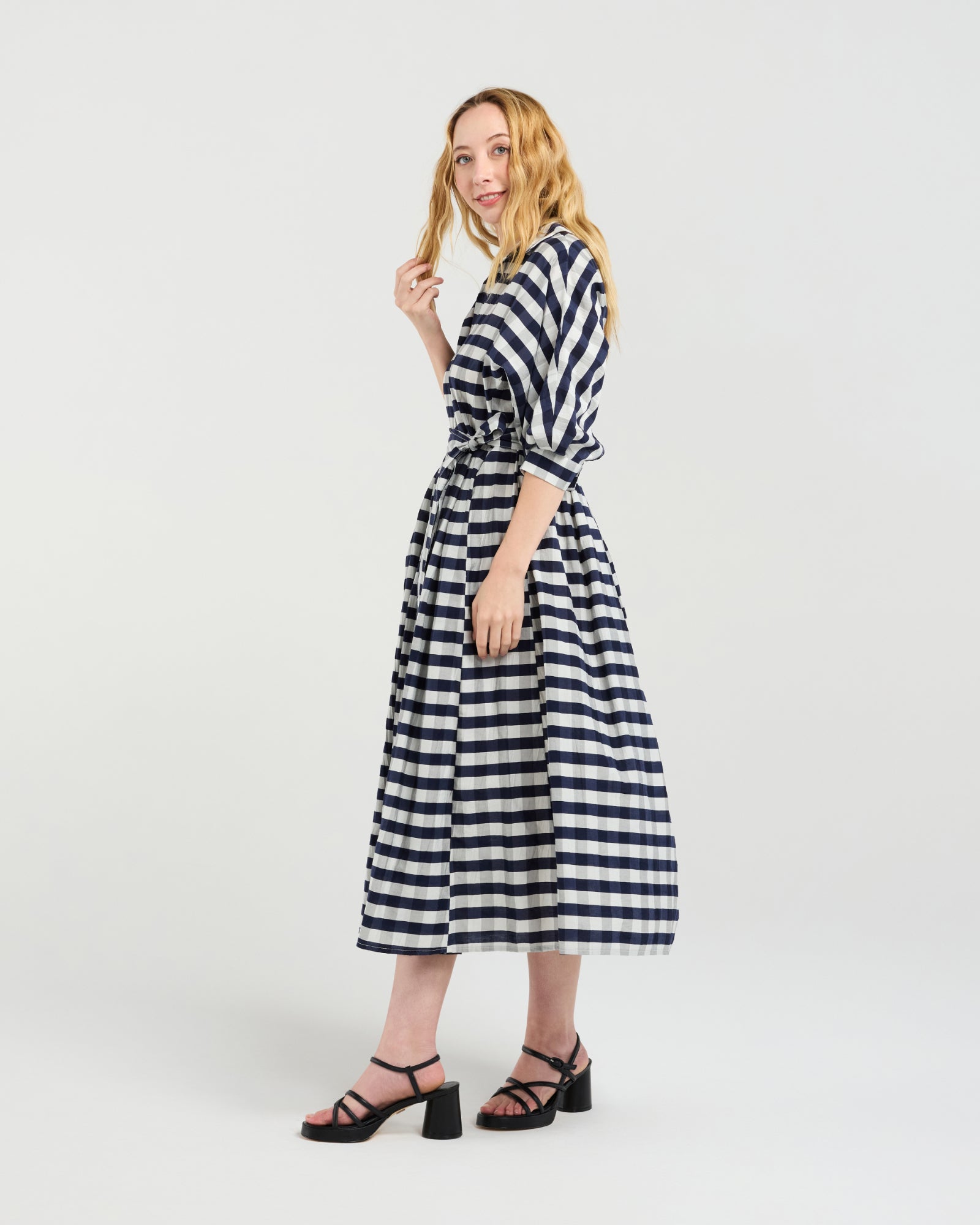 This shirt-style dress features a subtle grey and ink check pattern that brings refined structure to a soft silhouette. The 3/4-length sleeves and button-down front keep the look polished, while adjustable waist ties allow for a flattering, customisable fit. 100% Cotton.