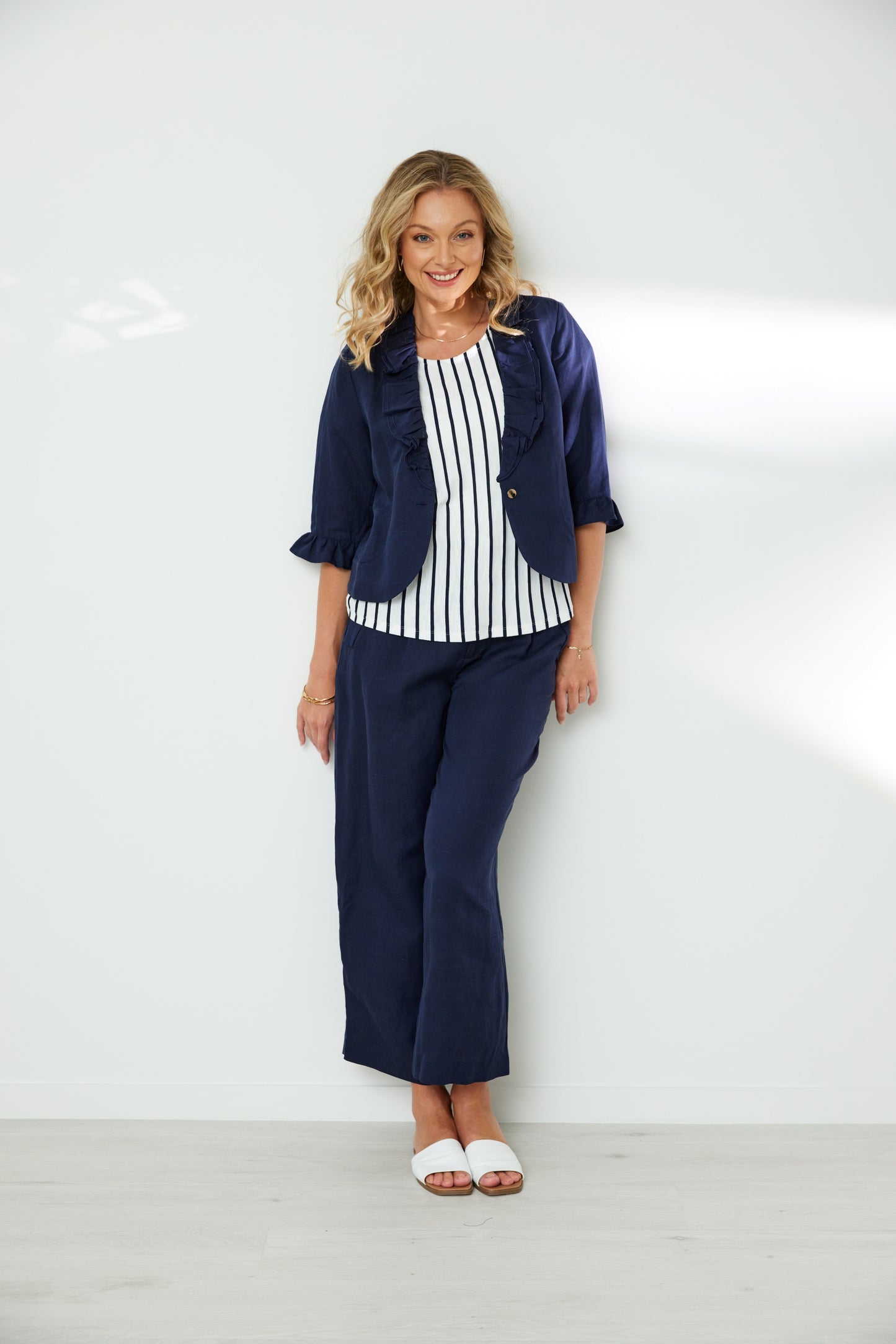 Unlined, cropped Tencel/Linen blend jacket featuring a single button closure. Designed with mid-length sleeves with frill cuffs and a double frill detail along the front opening.