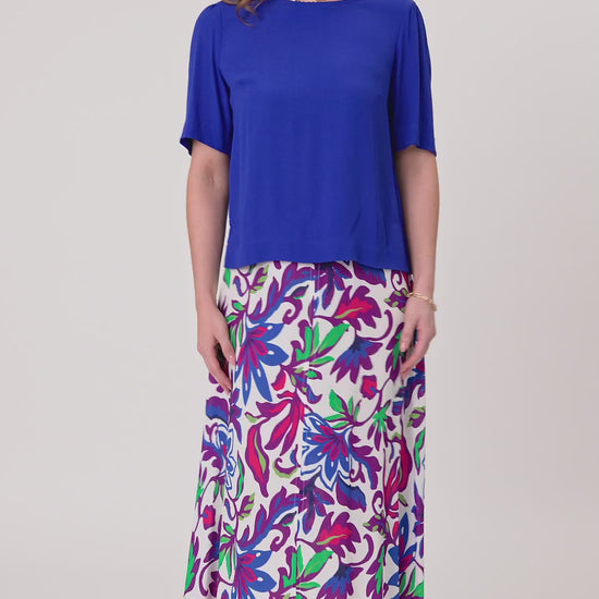 This effortlessly chic dress is available in cobalt, offering a light, crepe-like feel for an airy drape. Featuring a round neckline with subtle sleeve cinching at the shoulder, it delivers a refined yet relaxed silhouette. Crafted from a soft viscose-rayon blend, it provides all-day comfort with an elegant flow.