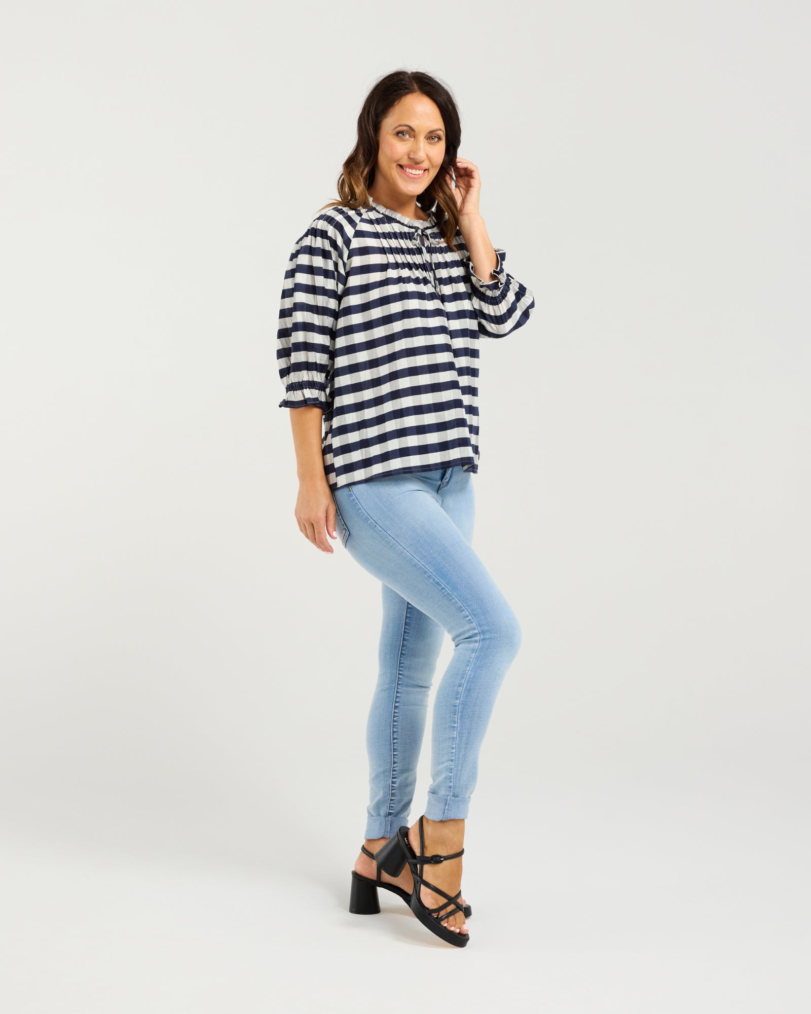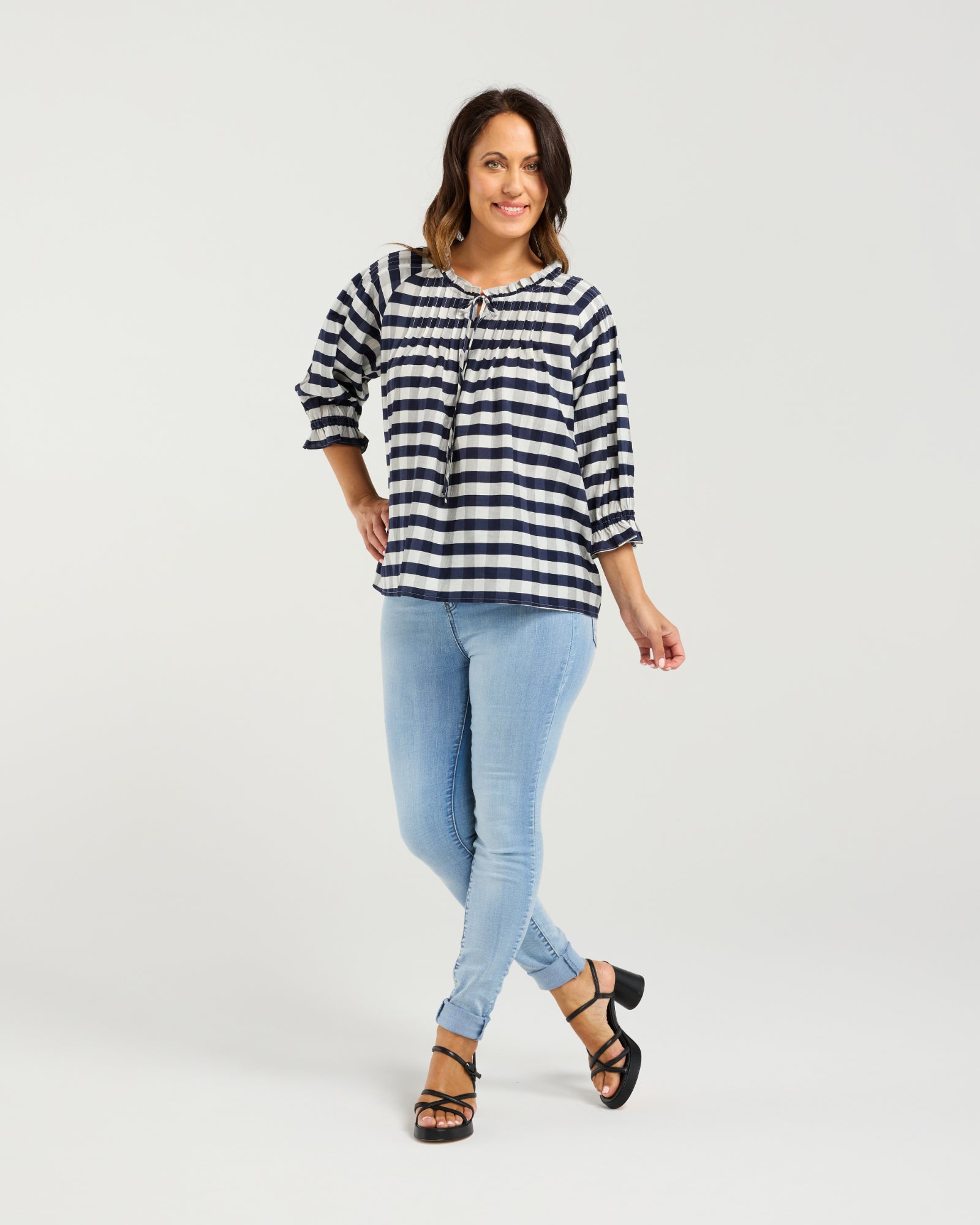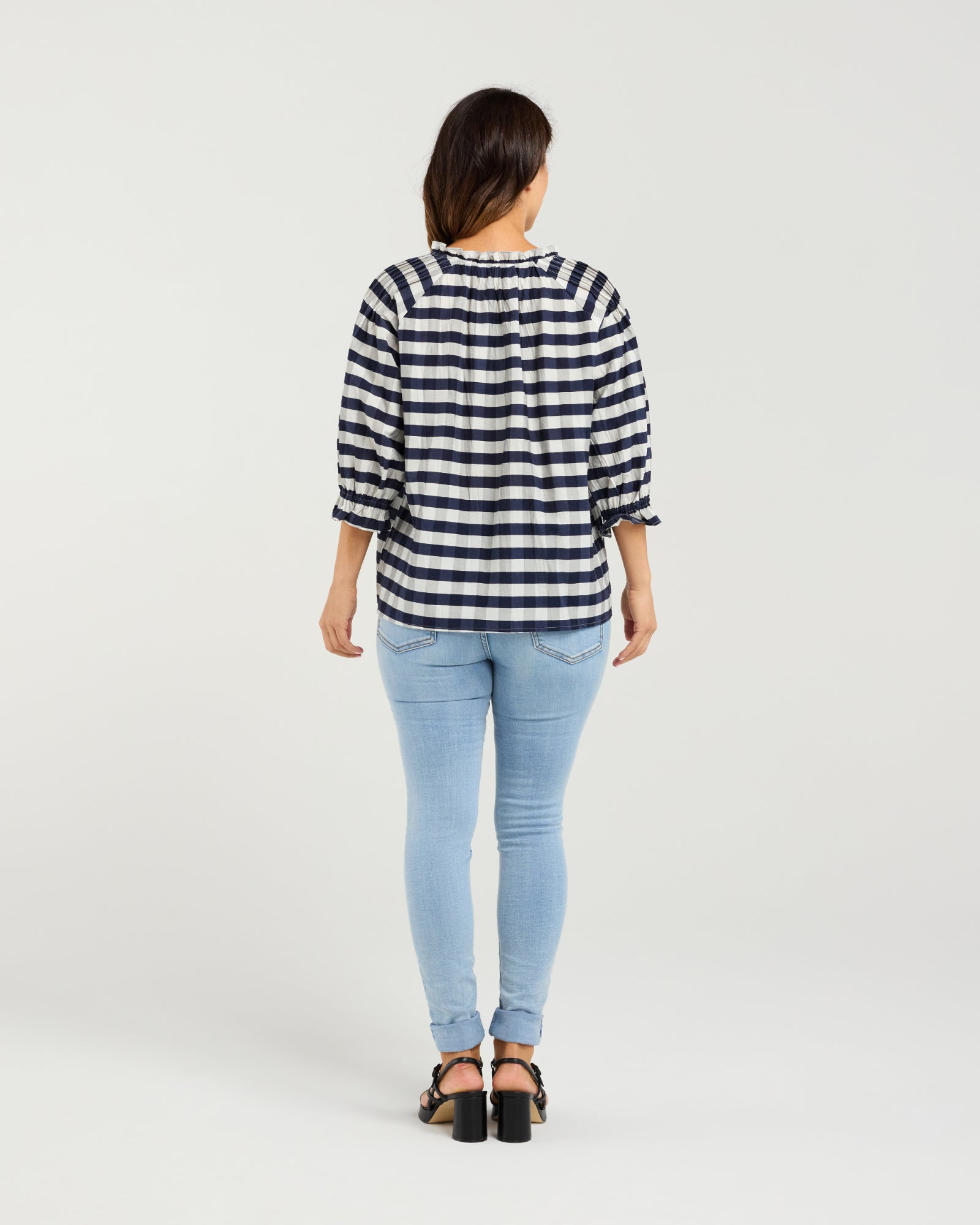 Celebrate summer in a Claire Blouse adorned with three-quarter sleeves, pleating, a frill around the neckline and necktie. Overall an elegant fit. 100% Cotton.