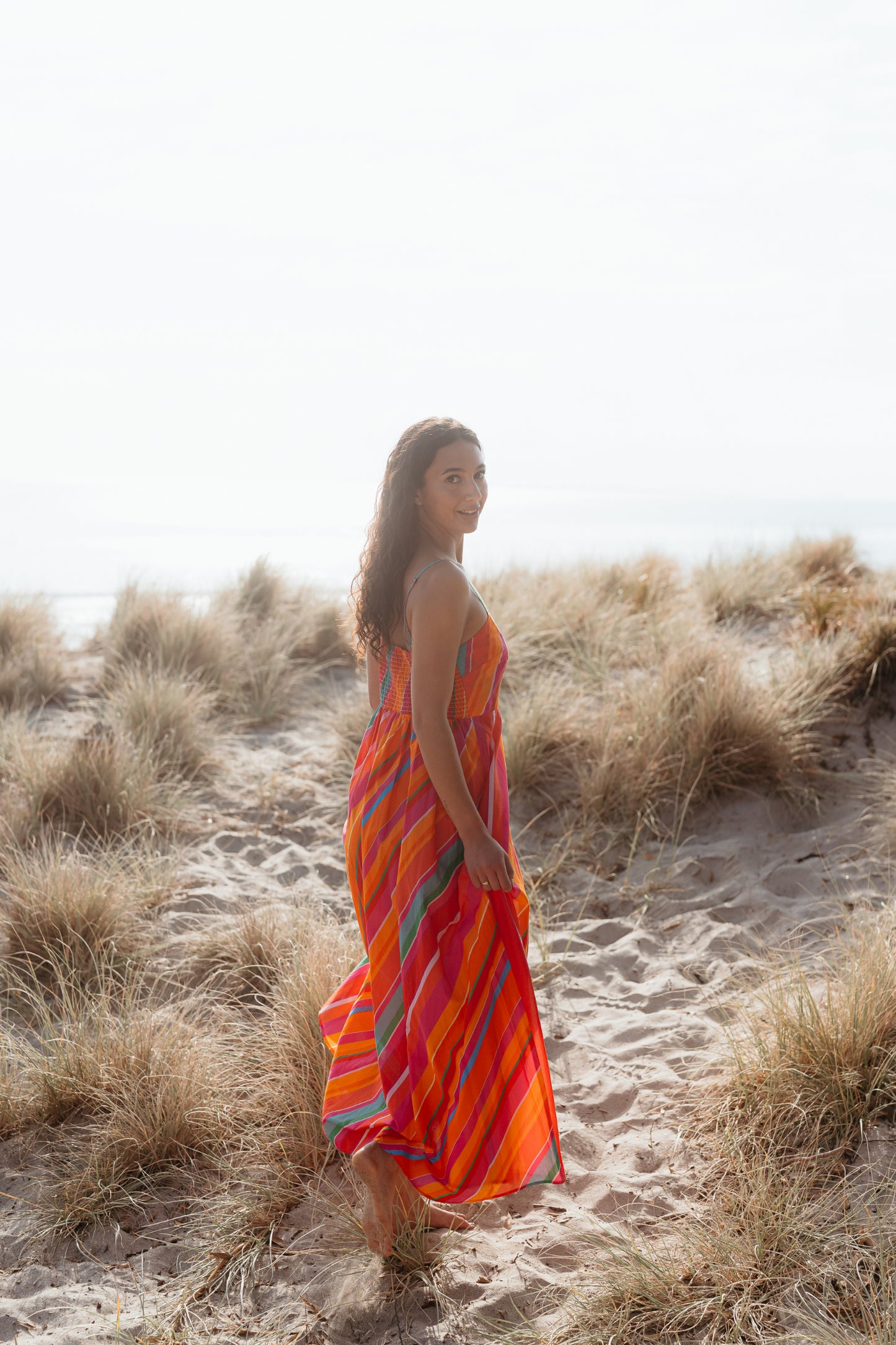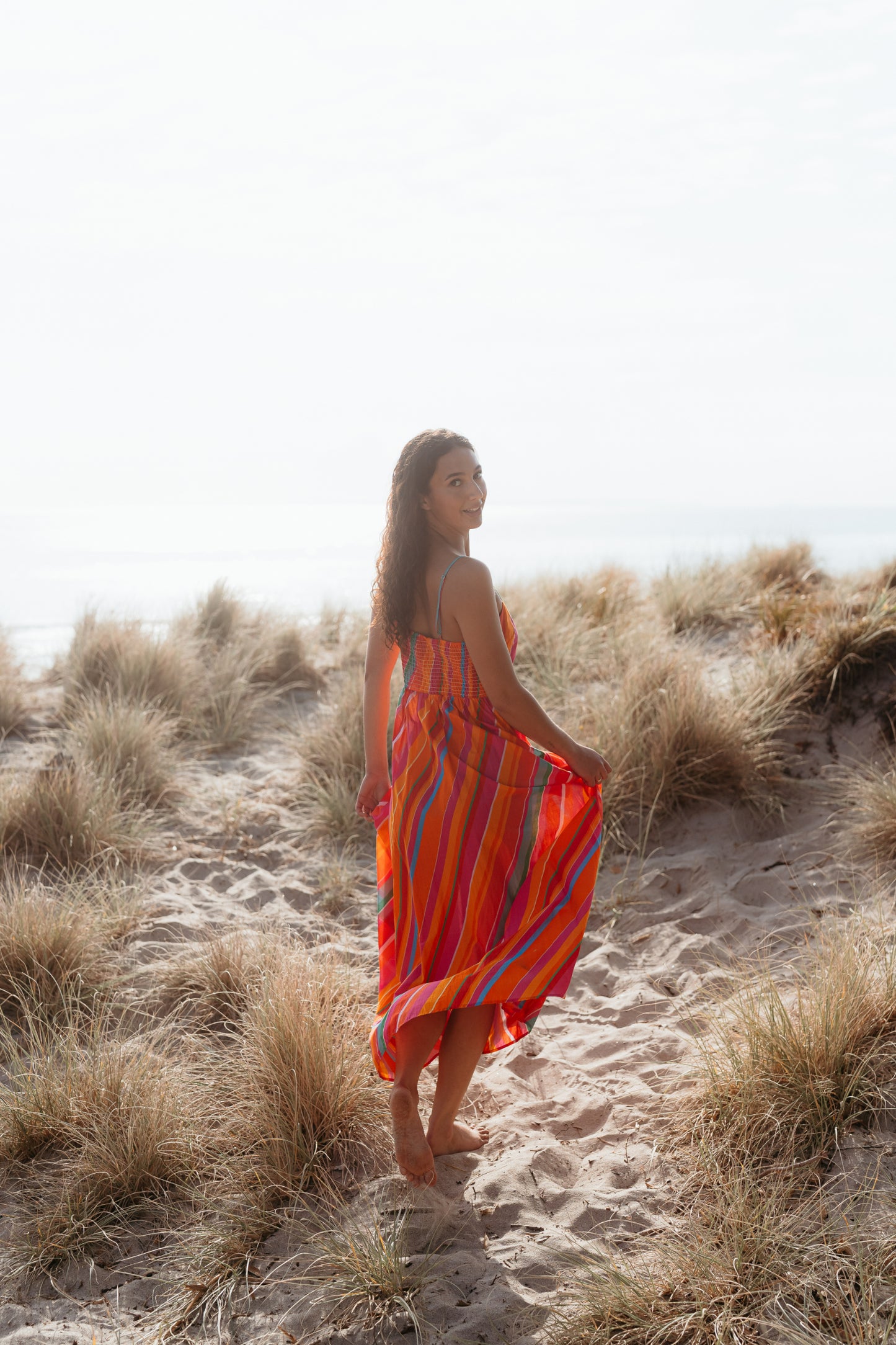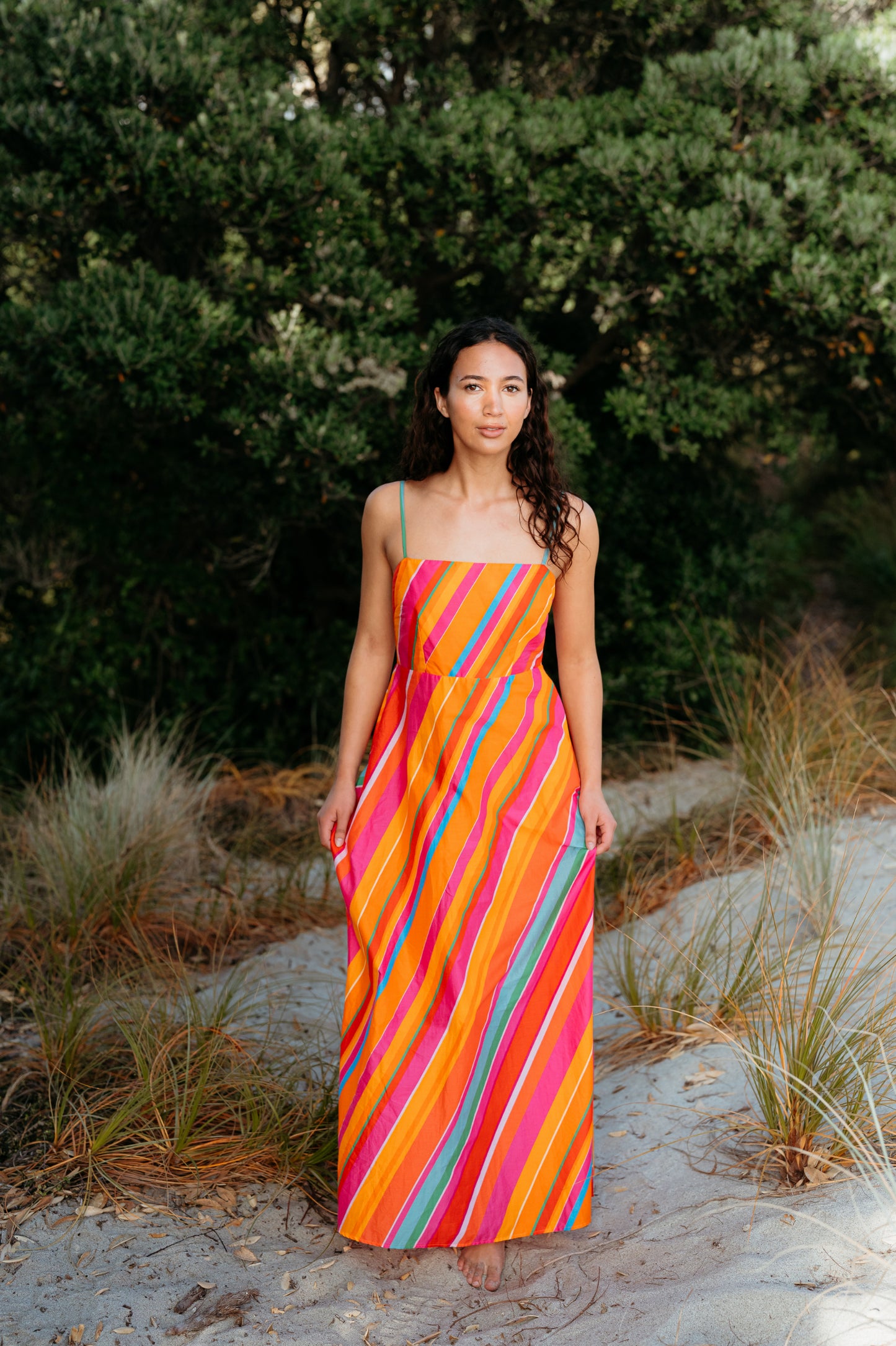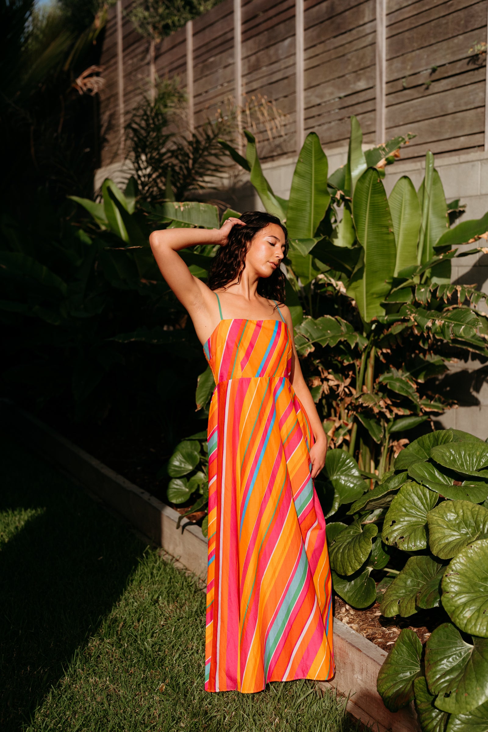 A bold beauty for sunny days, this strappy summer dress features a fitted bust with elastic at the back for a comfortable, flexible fit. The flared skirt adds movement to the simple, elegant silhouette, all brought to life in vibrant, colorful fabric. 100% Cotton.