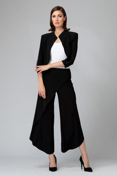 Joseph Ribkoff Navy wide-leg capri pant with high waist. Fitted at hips with slinky drape over thigh and knee. Asymmetrical pointed hem for mid-calf flare.