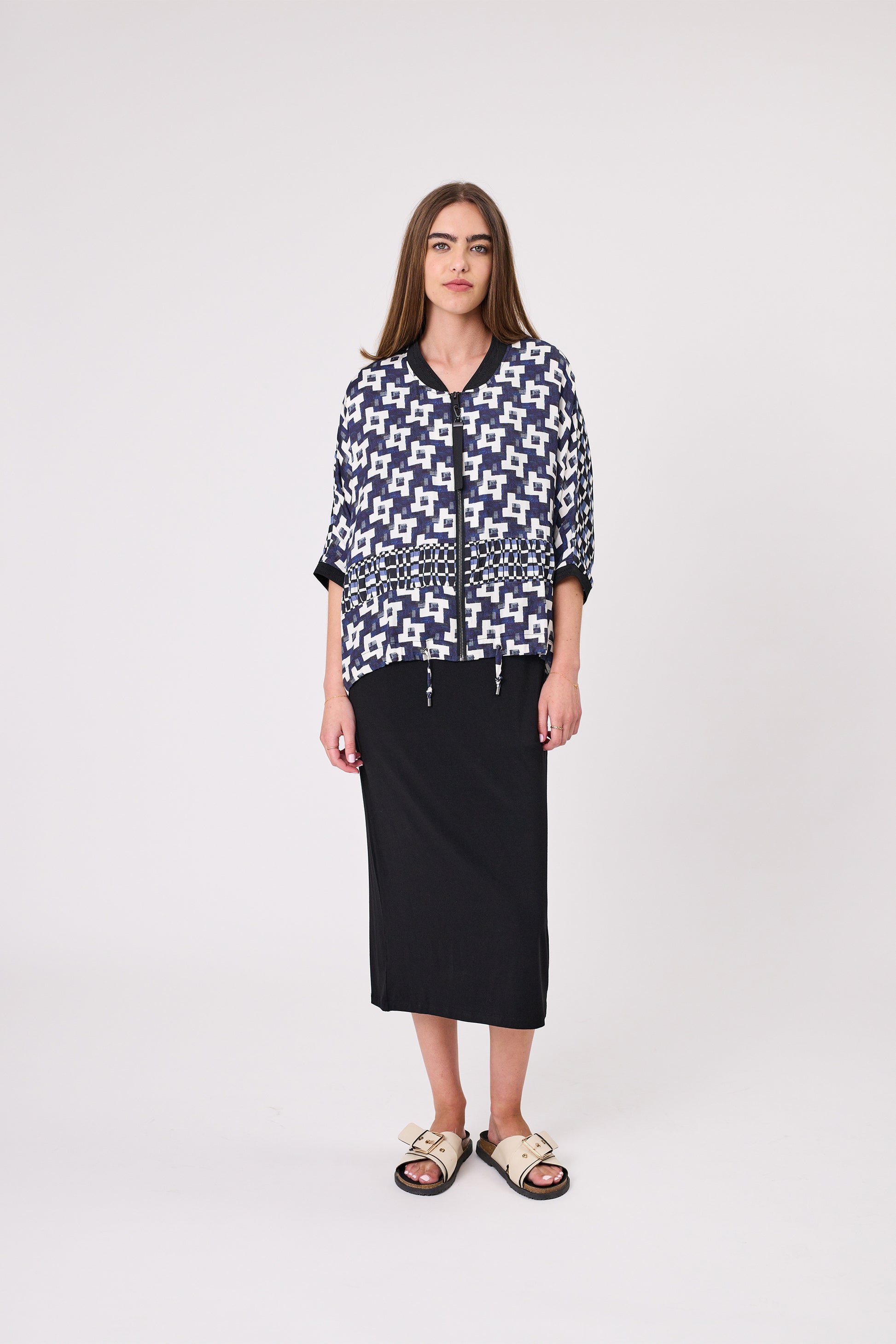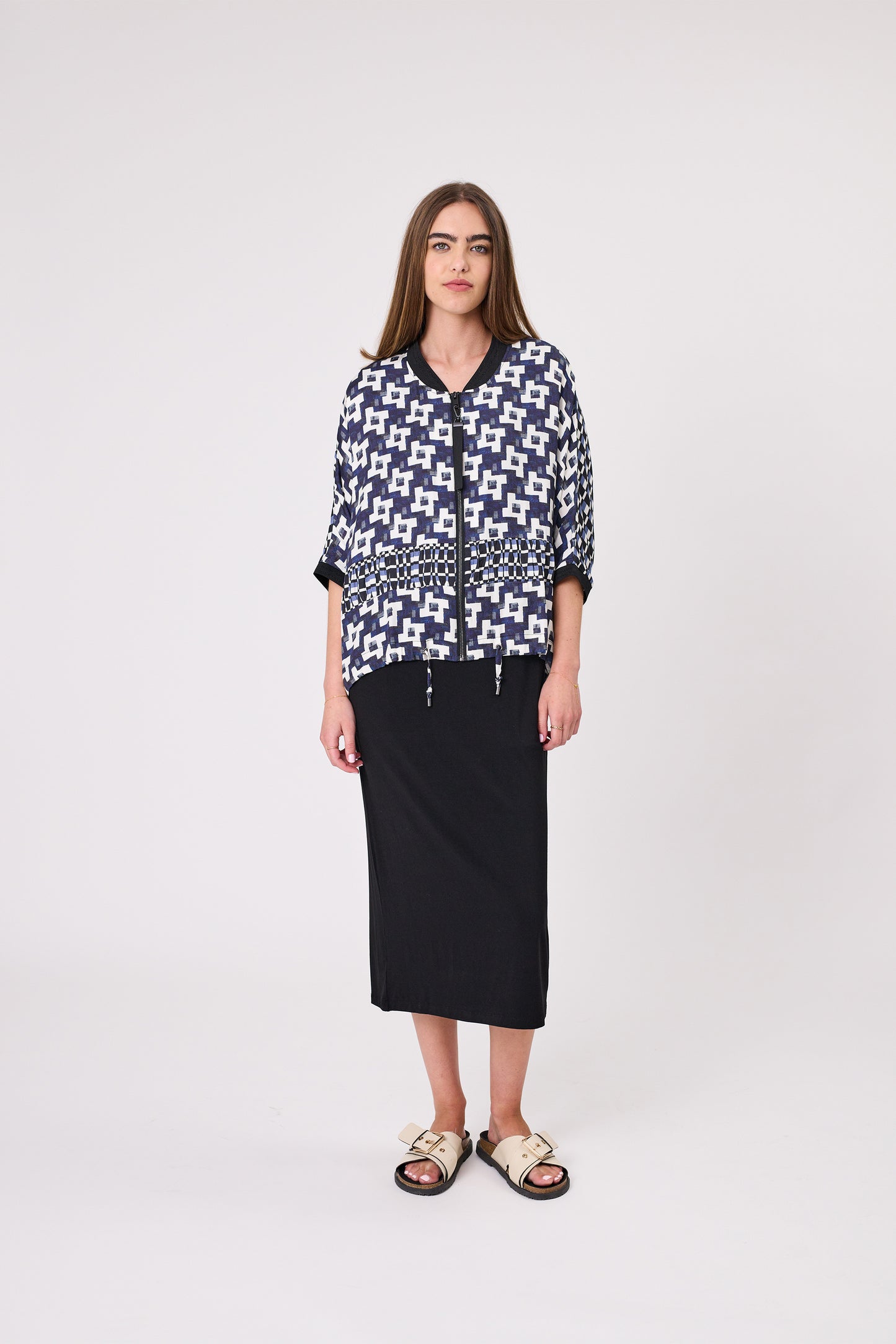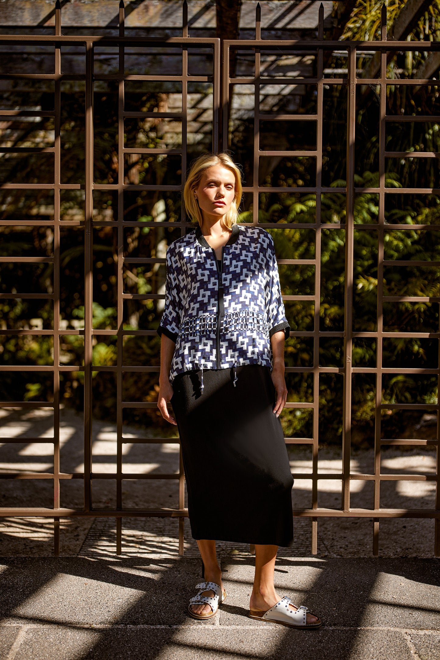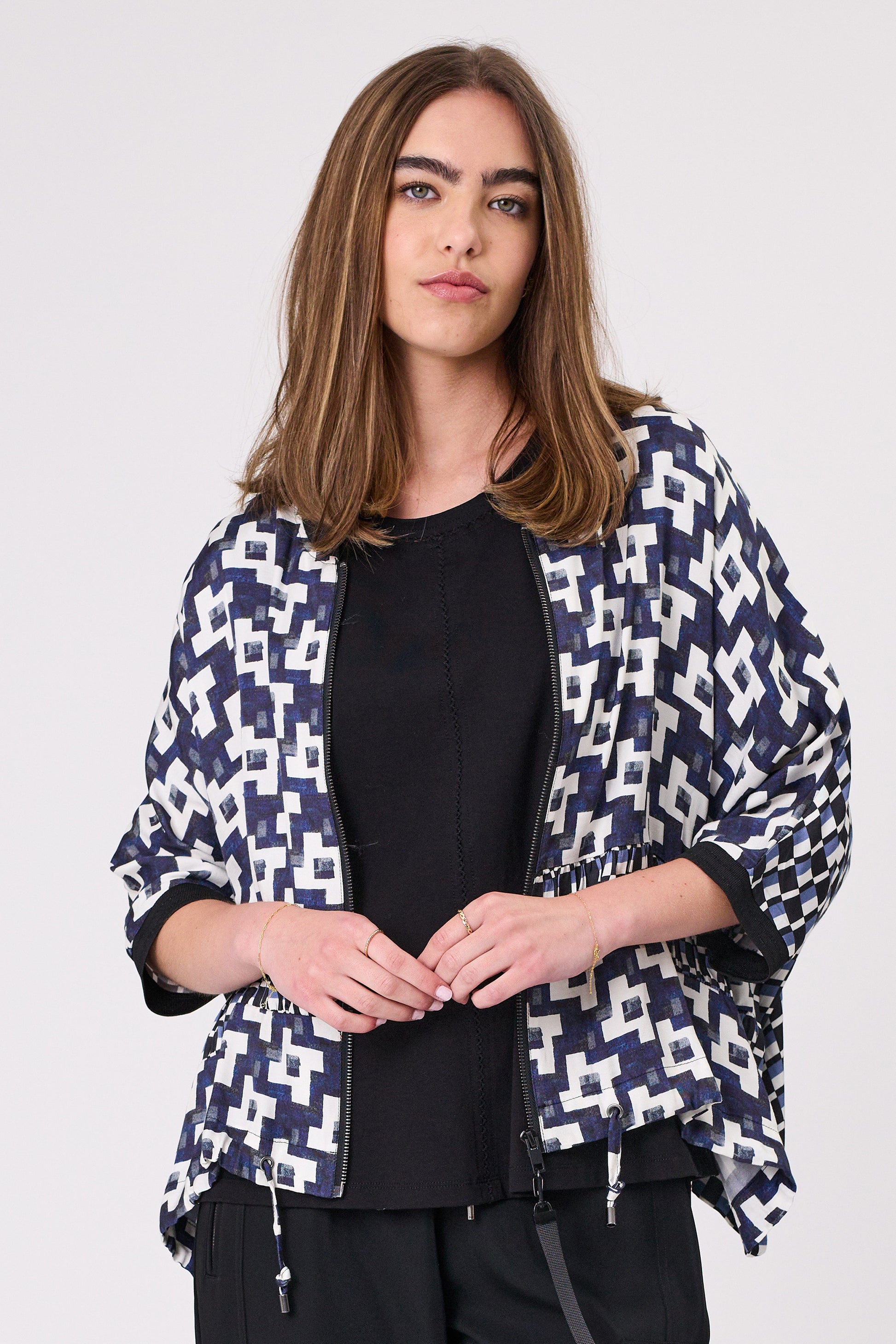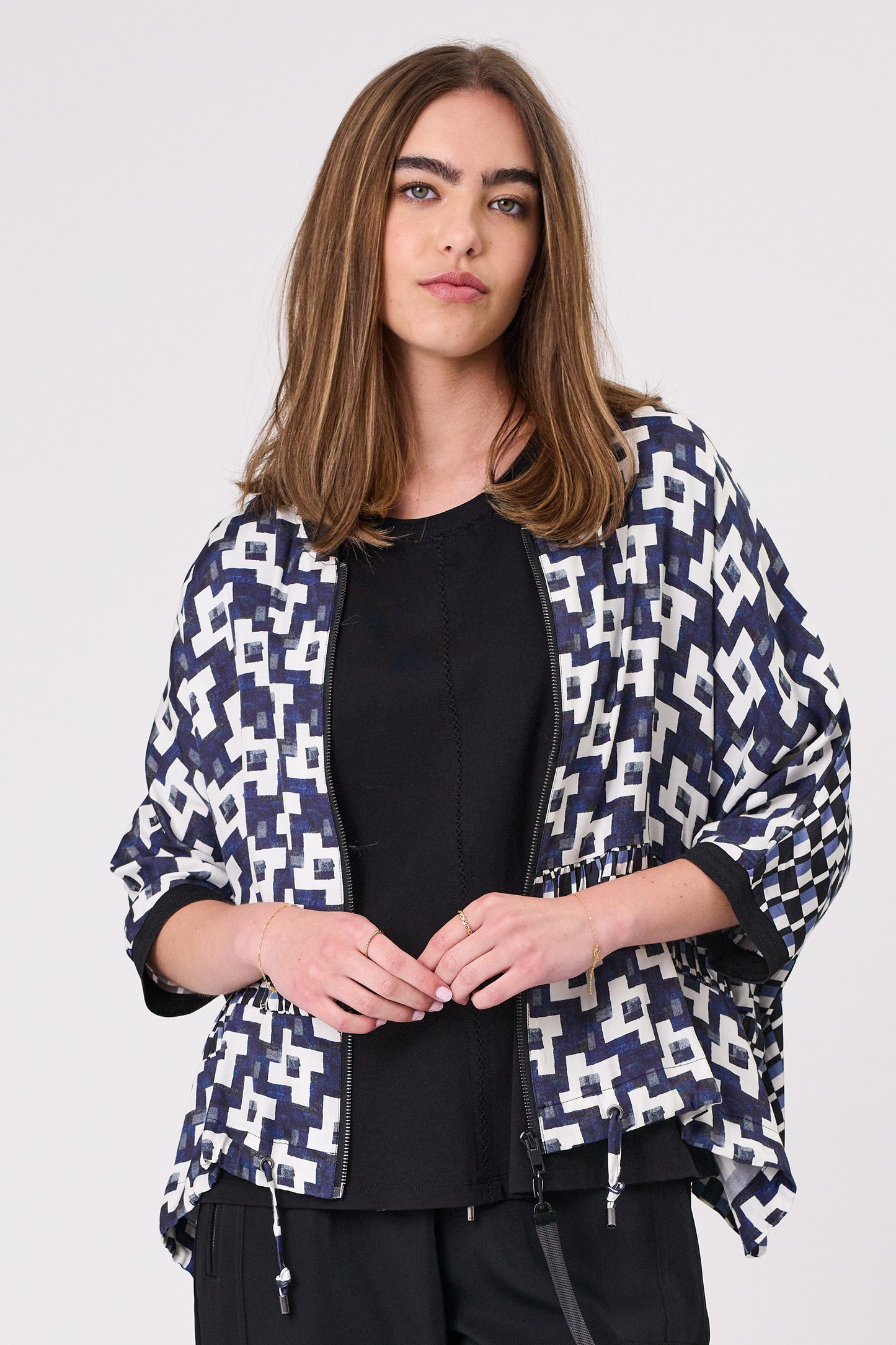 Drop shoulder Cortez print jacket made of soft viscose fabric. Features ribbed neck and sleeve cuffs, single-ended zipper front opening, gathering at the waist, and hem finished with adjustable ties.
