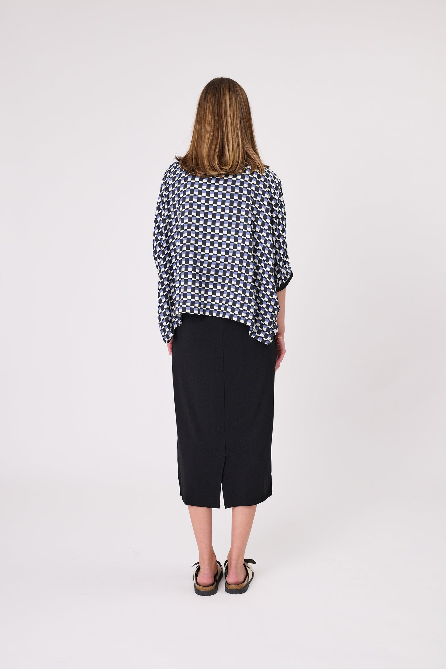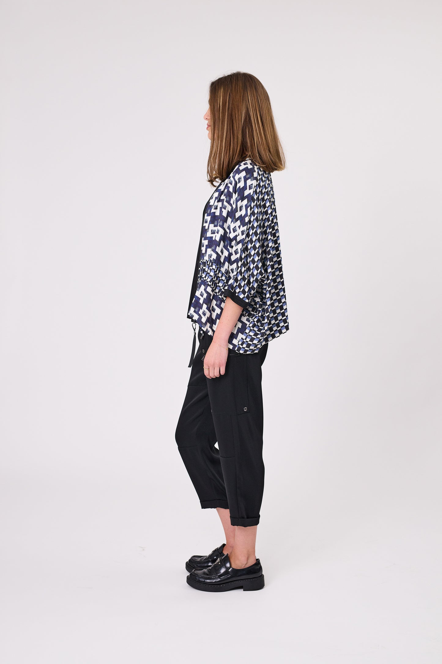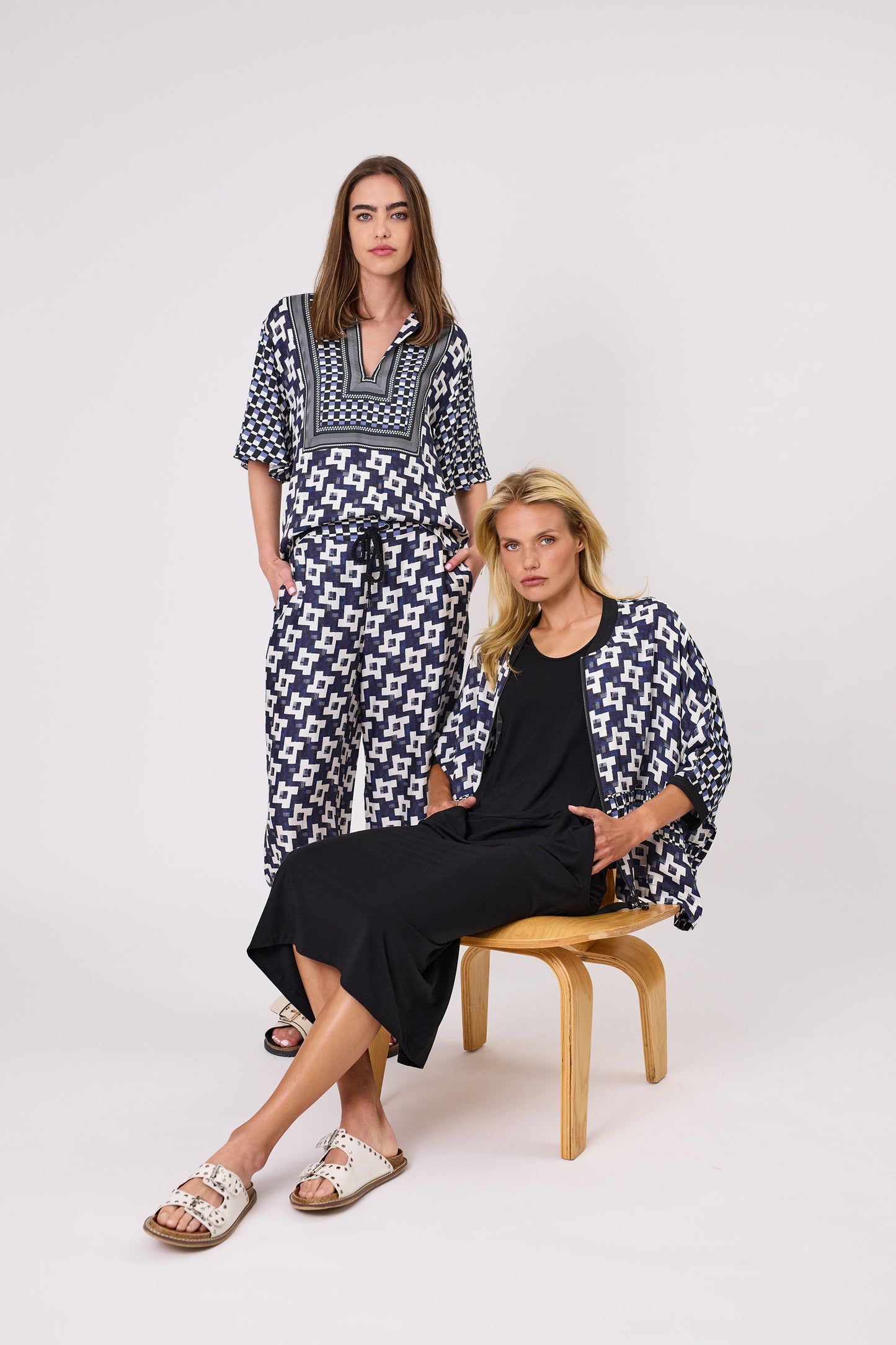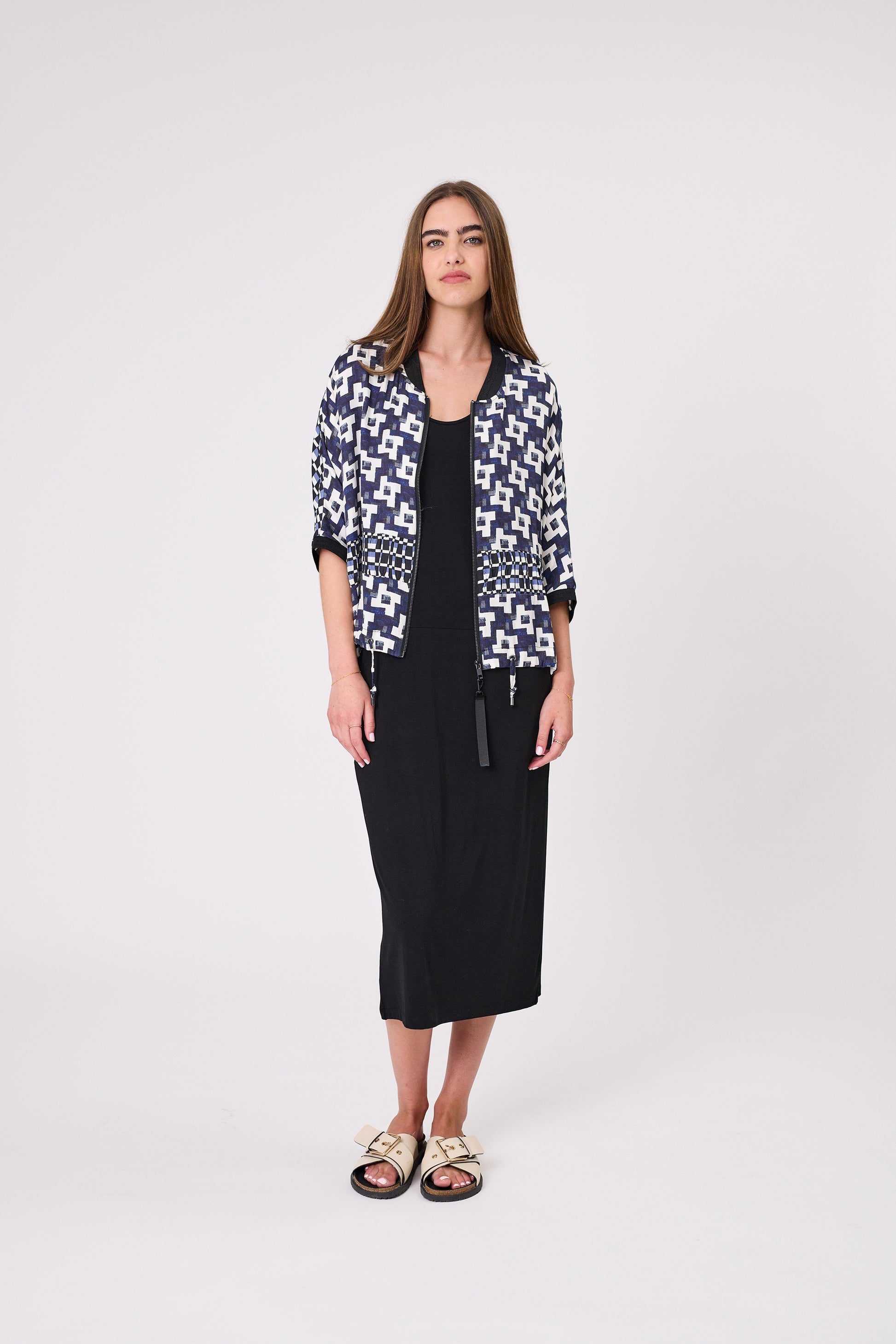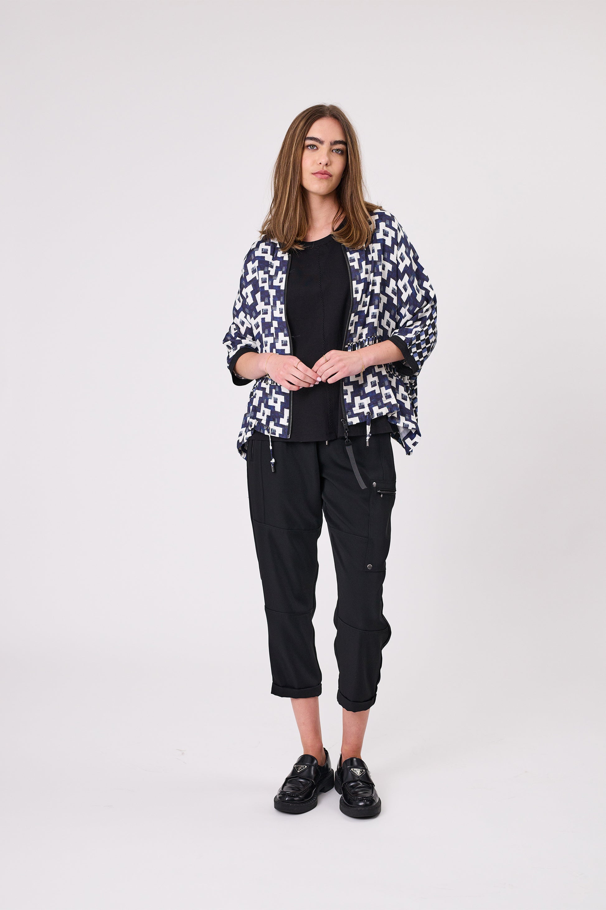 Drop shoulder Cortez print jacket made of soft viscose fabric. Features ribbed neck and sleeve cuffs, single-ended zipper front opening, gathering at the waist, and hem finished with adjustable ties.