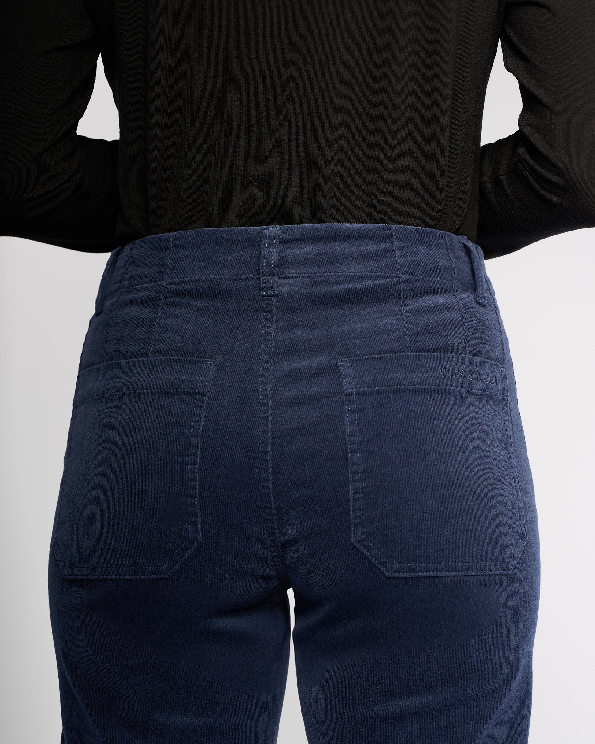 A wide‑leg, ankle‑grazer pant crafted from soft stretch corduroy in our Slate colourway — a versatile dark grey designed for effortless everyday wear. Offering a comfortable and flattering fit, this style features statement patch pocket detailing for a modern, utility‑inspired finish. A faced waistband with a metal ‘V’ logo jean button, belt loops, and a zip fly completes the look with signature detailing.