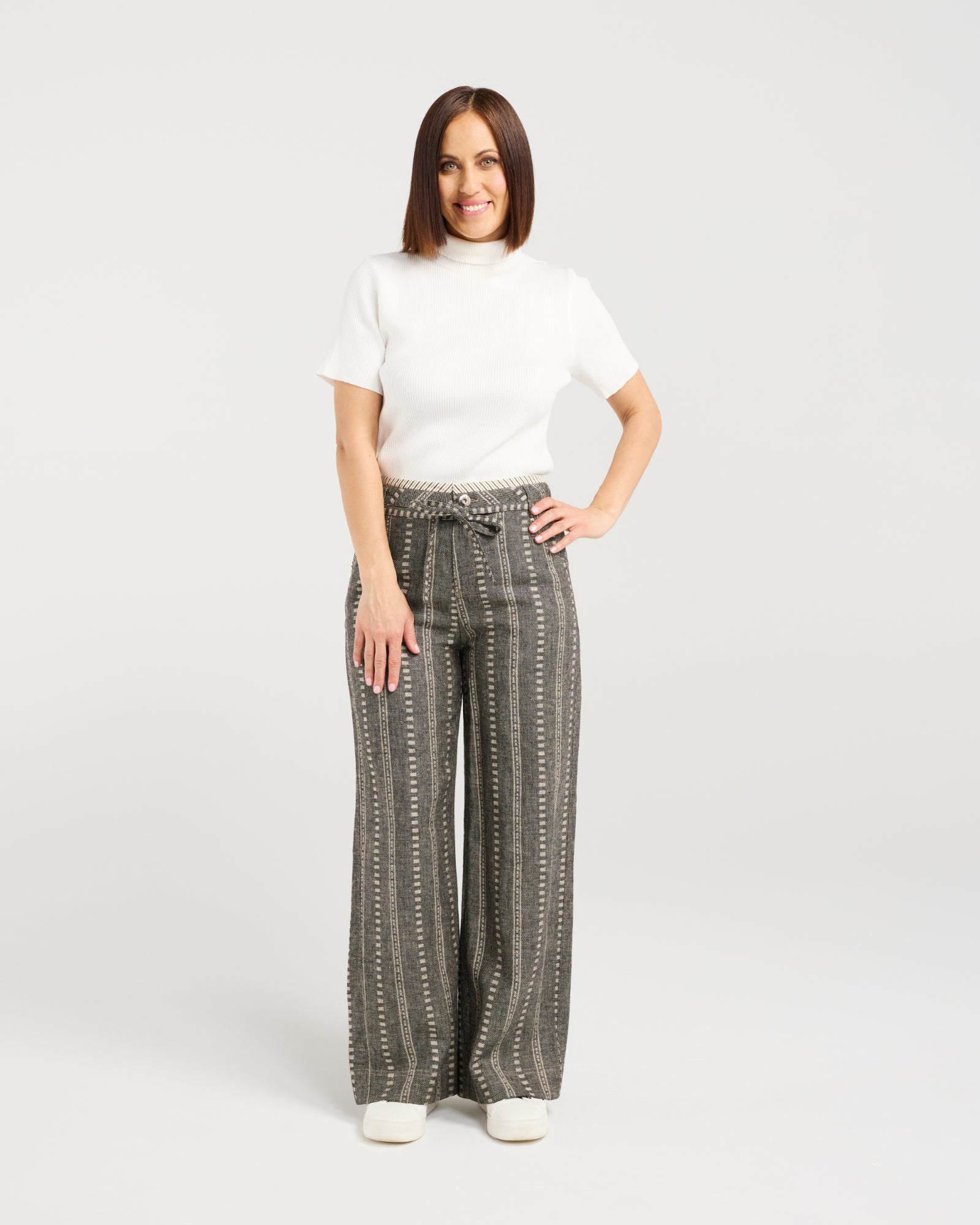 Cotton pants designed with a modern vertical stripe pattern, creating a clean and elevated silhouette. Finished with a button closure and adjustable drawstring waist, this style balances tailored appeal with relaxed comfort, making it an effortless choice for winter dressing and everyday wear.