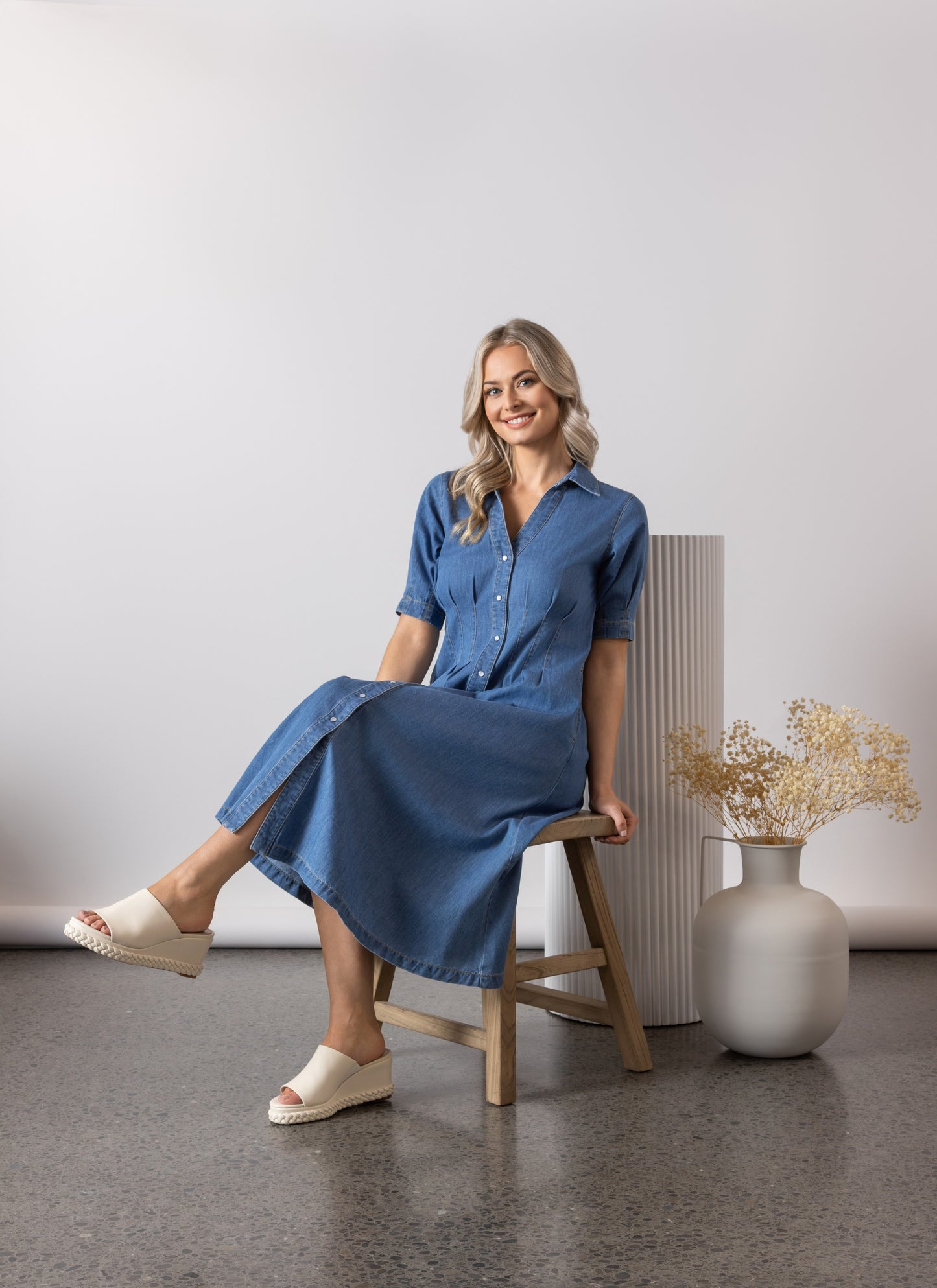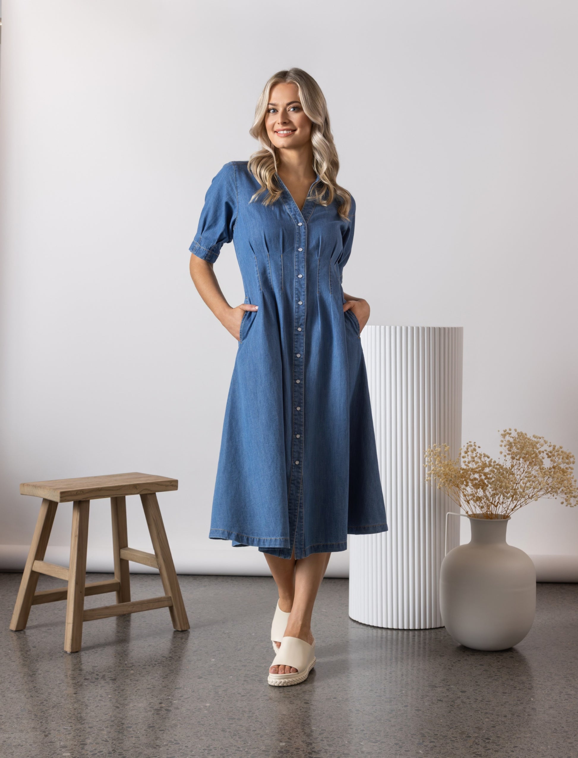 Elevated yet relaxed, the Mid Wash Dress by Vassalli is crafted from lightweight 100% cotton with a soft denim-look finish. This midi-length button-through style features a V-neckline and shirt collar, offering modern structure with breezy comfort.