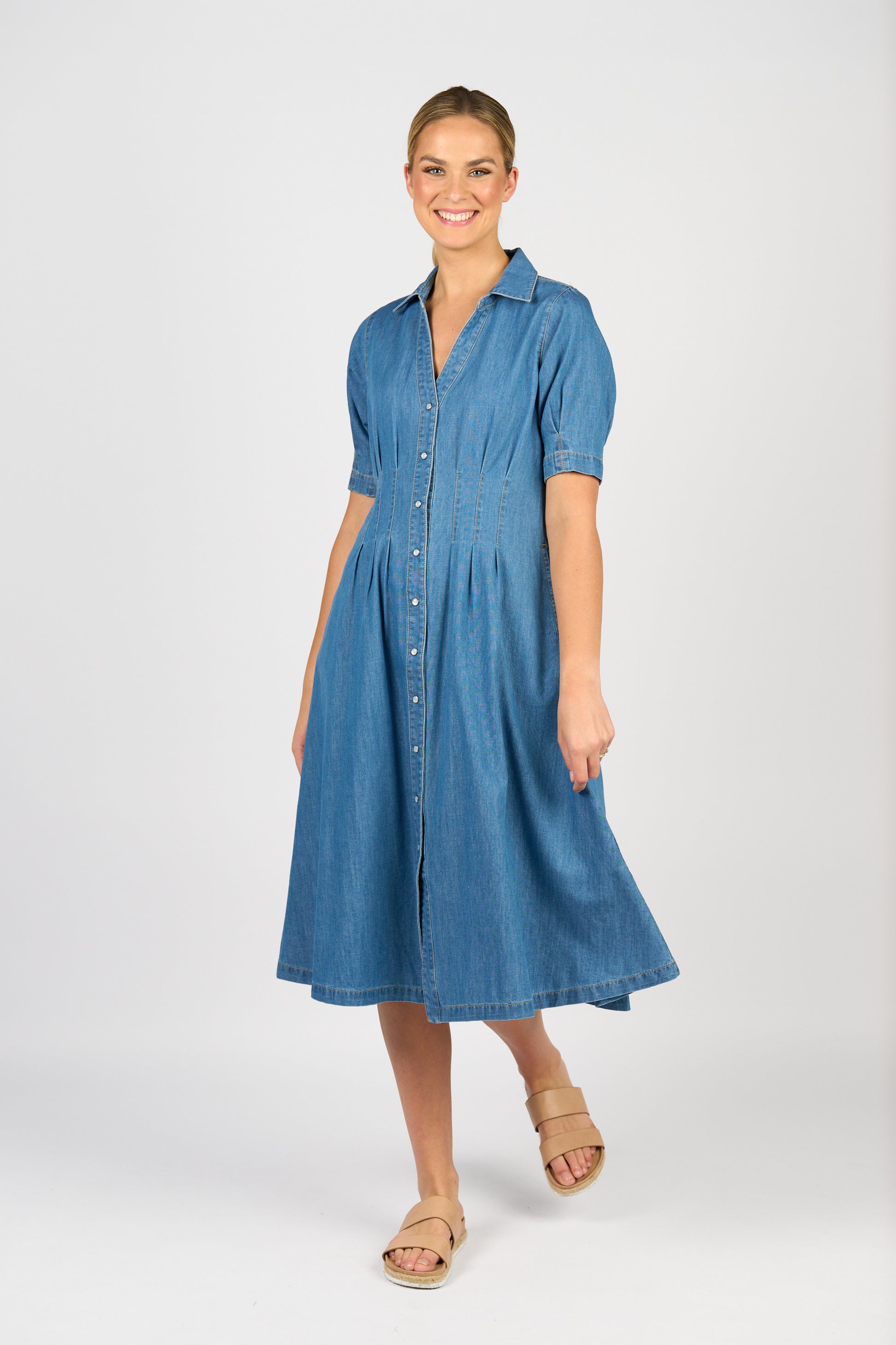 Vassalli Shaped Waist Button-Up Dress with Pockets – Mid Wash