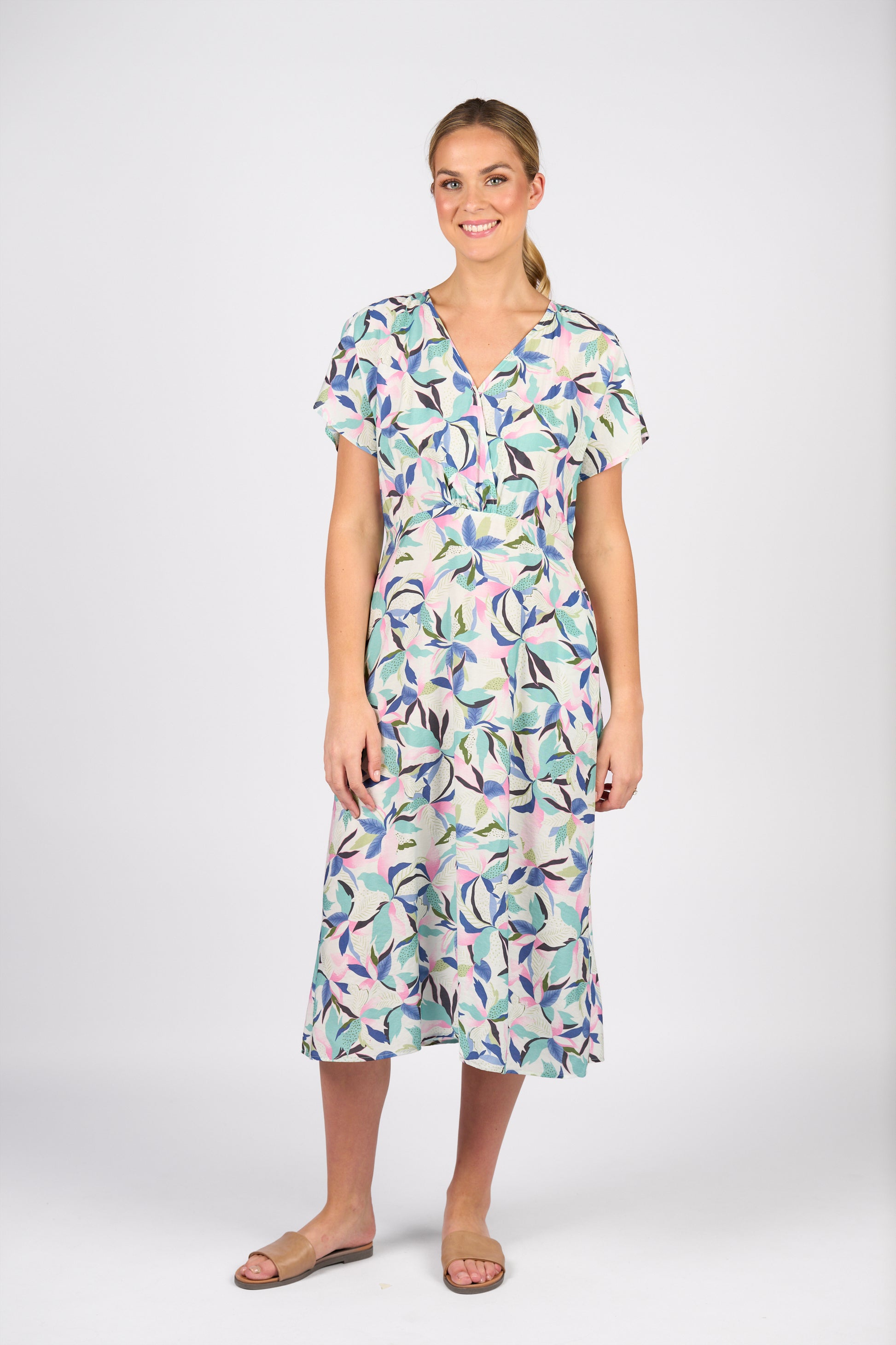 Soft and flowing in a bold print, the Soliel Dress by Vassalli features a relaxed drop-shoulder silhouette with a wrap-style bodice. Made from lightweight rayon-nylon, it’s designed for ease and elegance with a flattering gathered elastic seam at the back.
