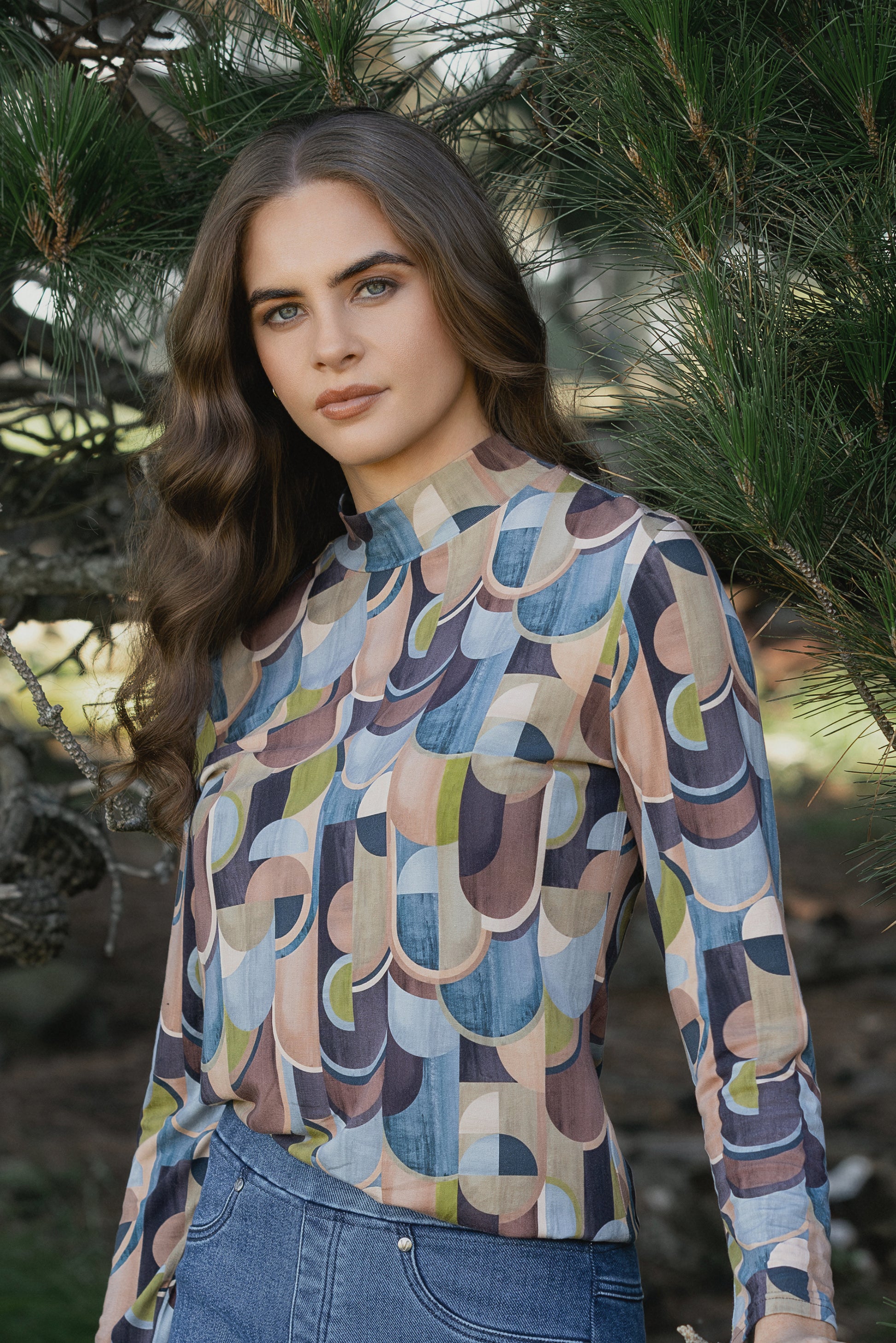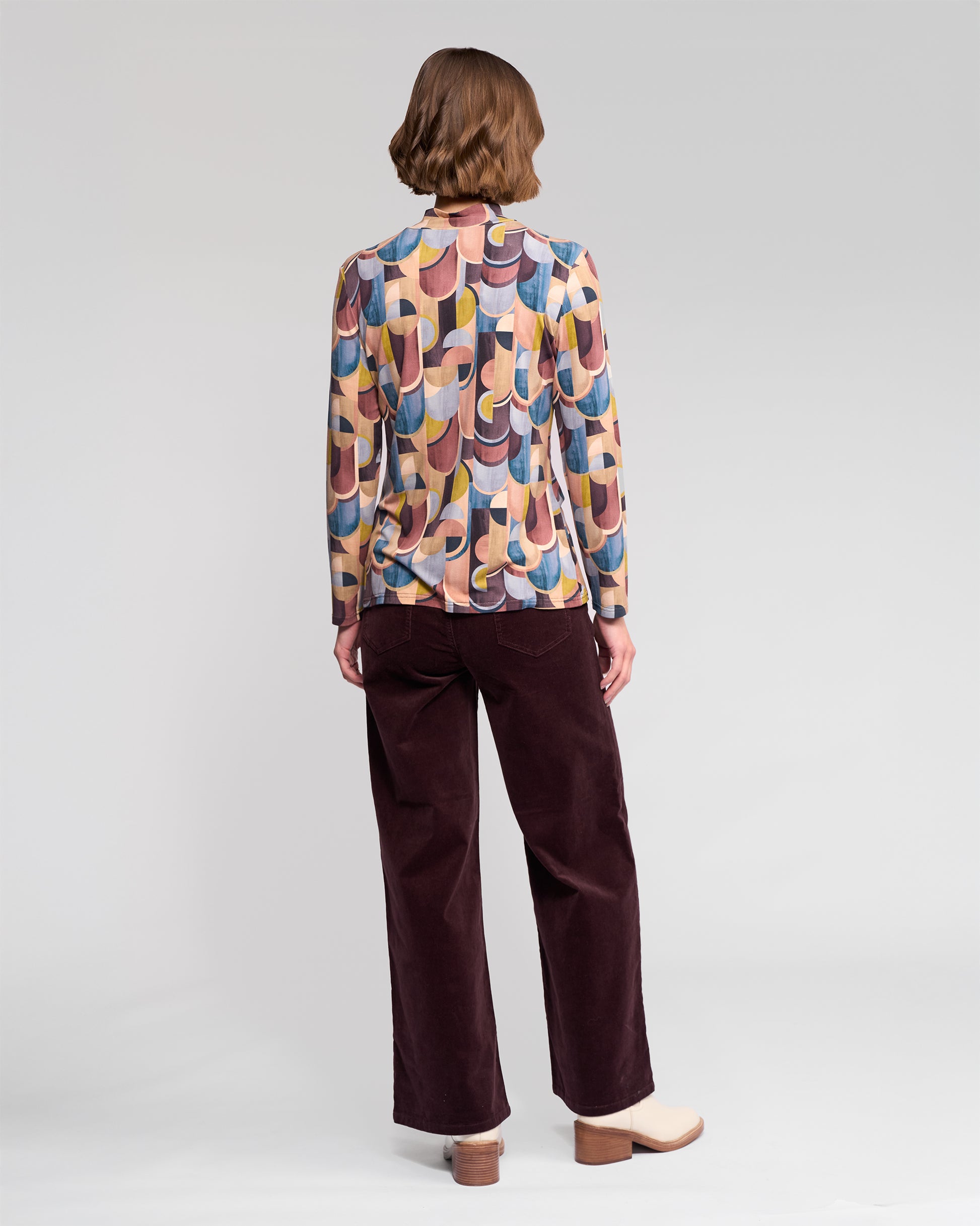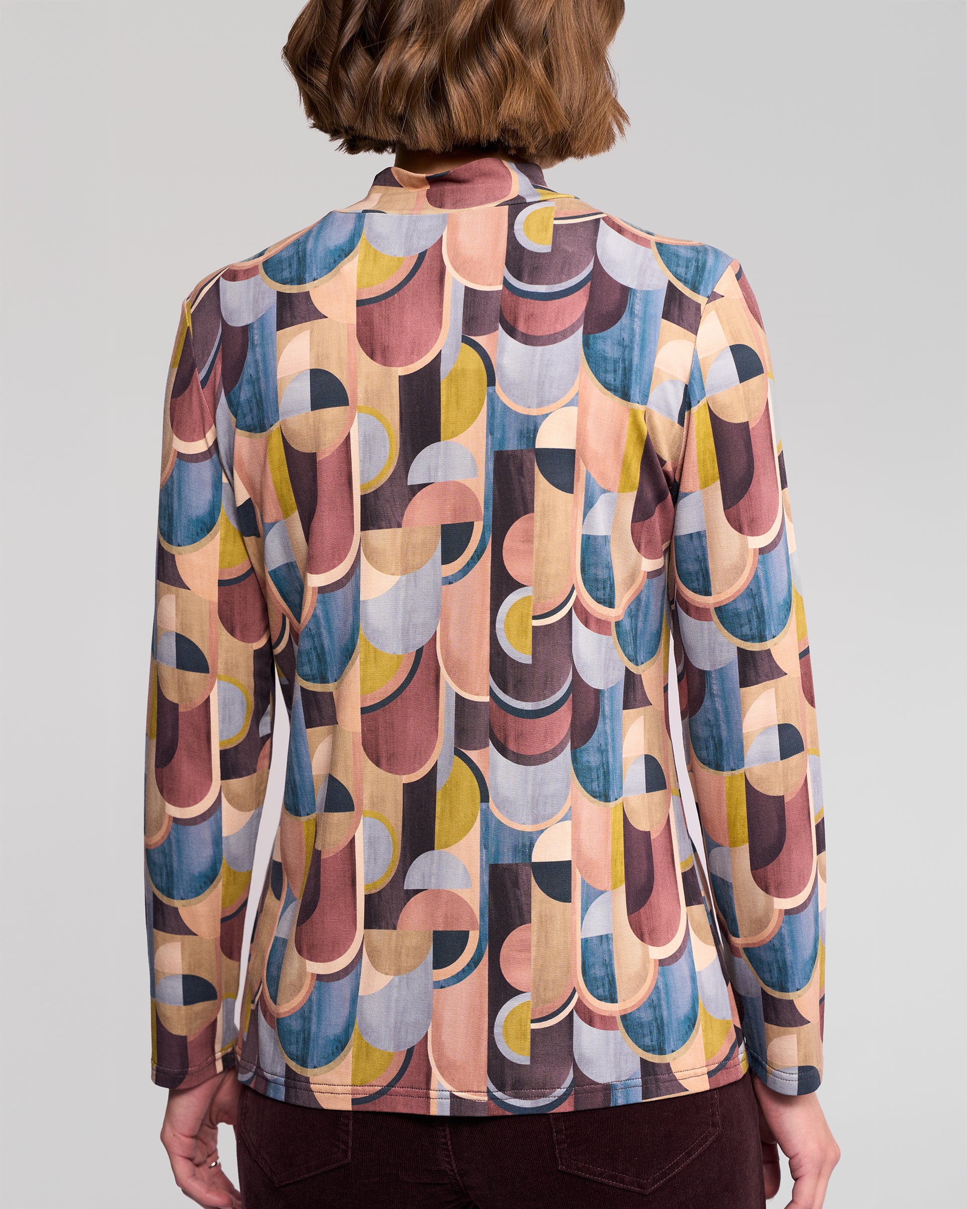 A long‑sleeve high‑neck top in our Revolve print — a retro‑inspired pattern featuring rich tones of merlot, blue, and oaty yellow. Crafted from a soft, stretchy rayon jersey, this close‑fit style is a versatile wardrobe piece that brings subtle pattern and comfortable layering into everyday dressing.