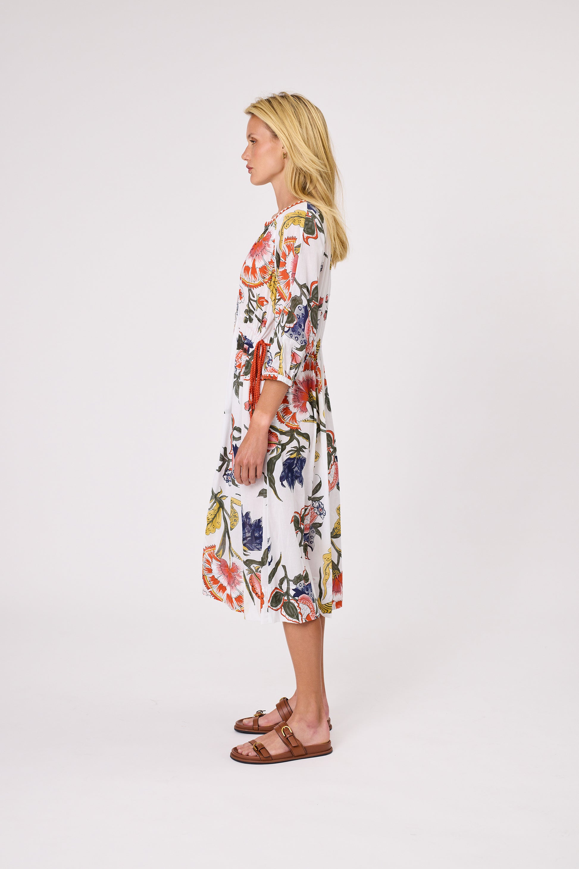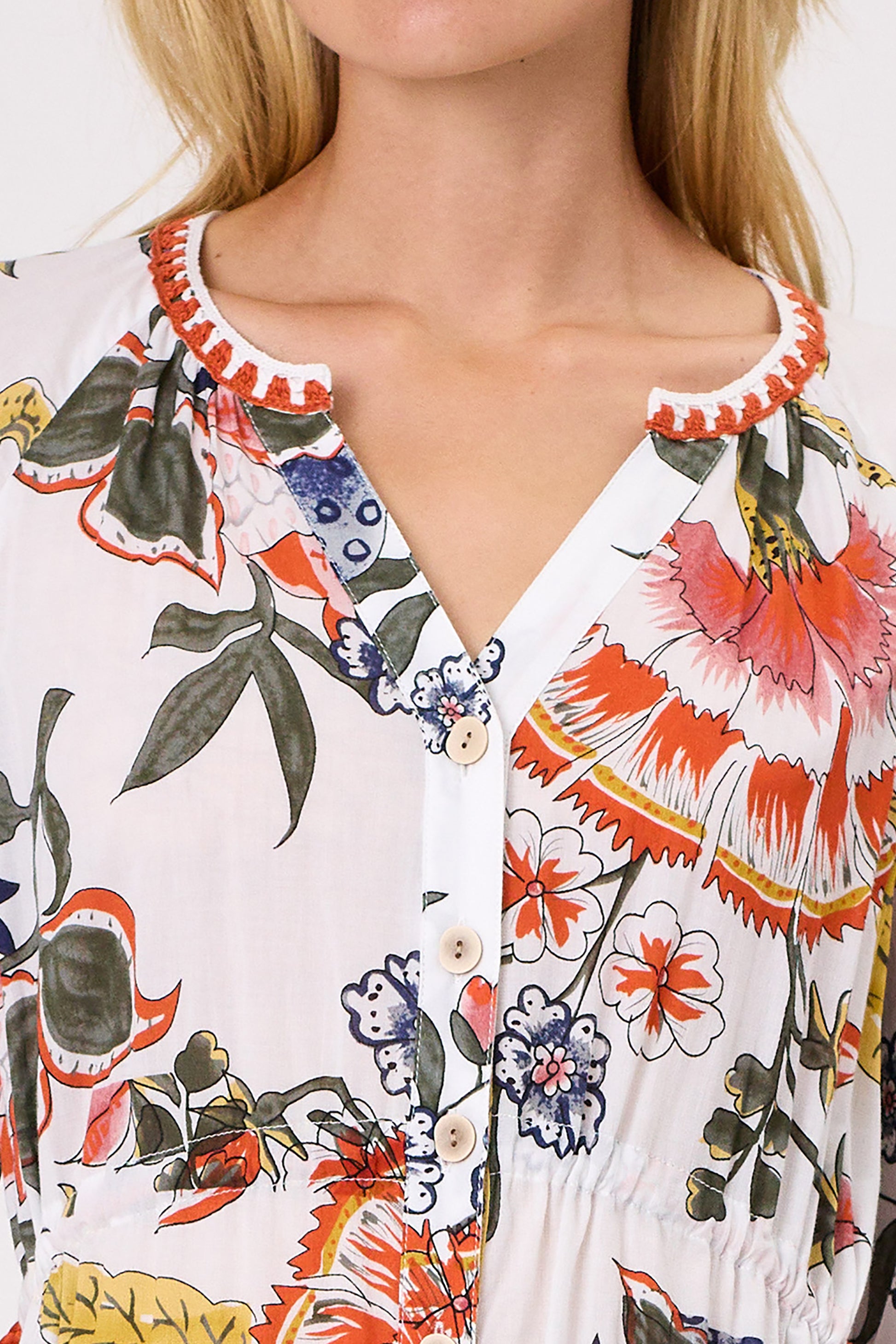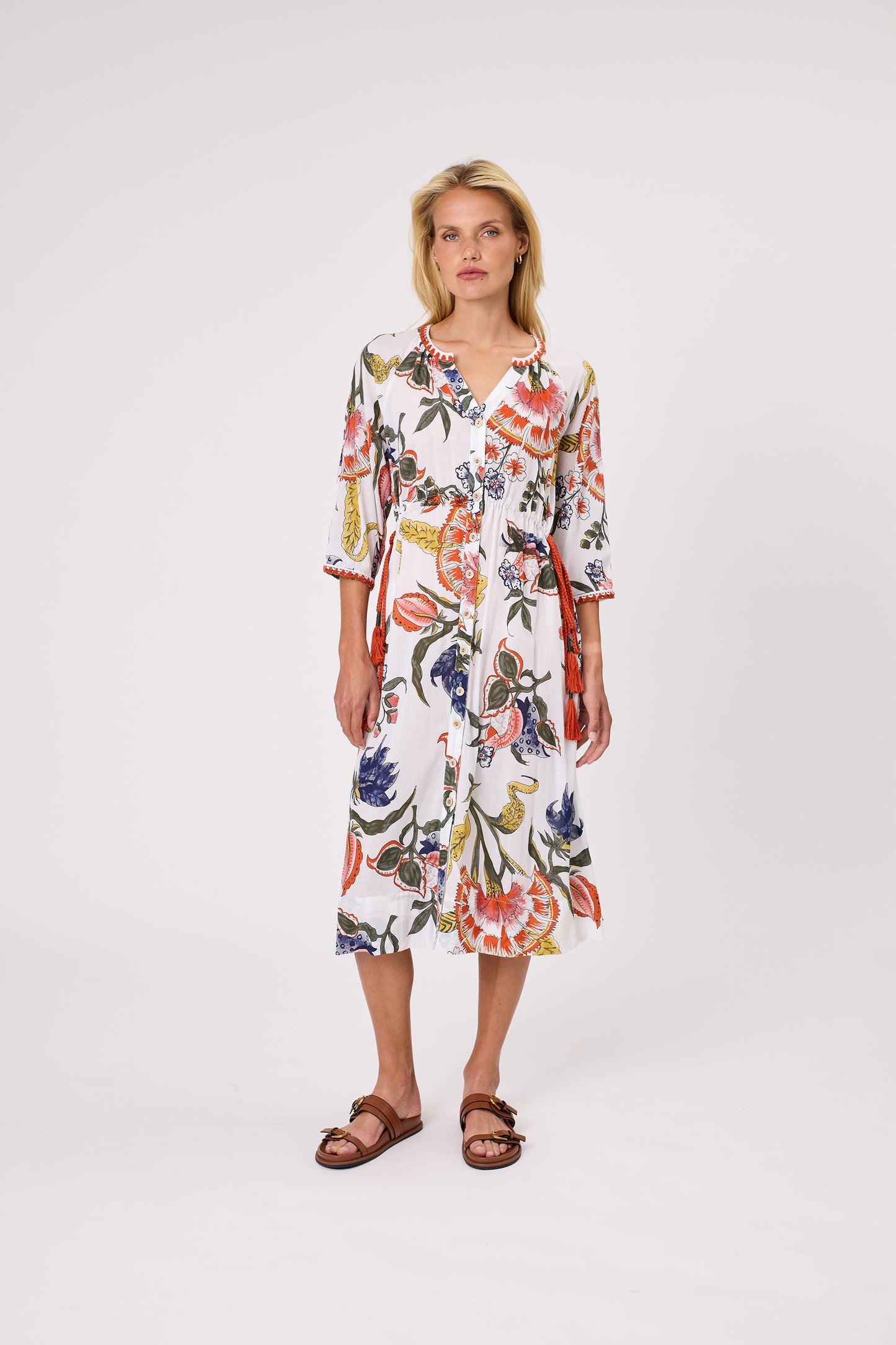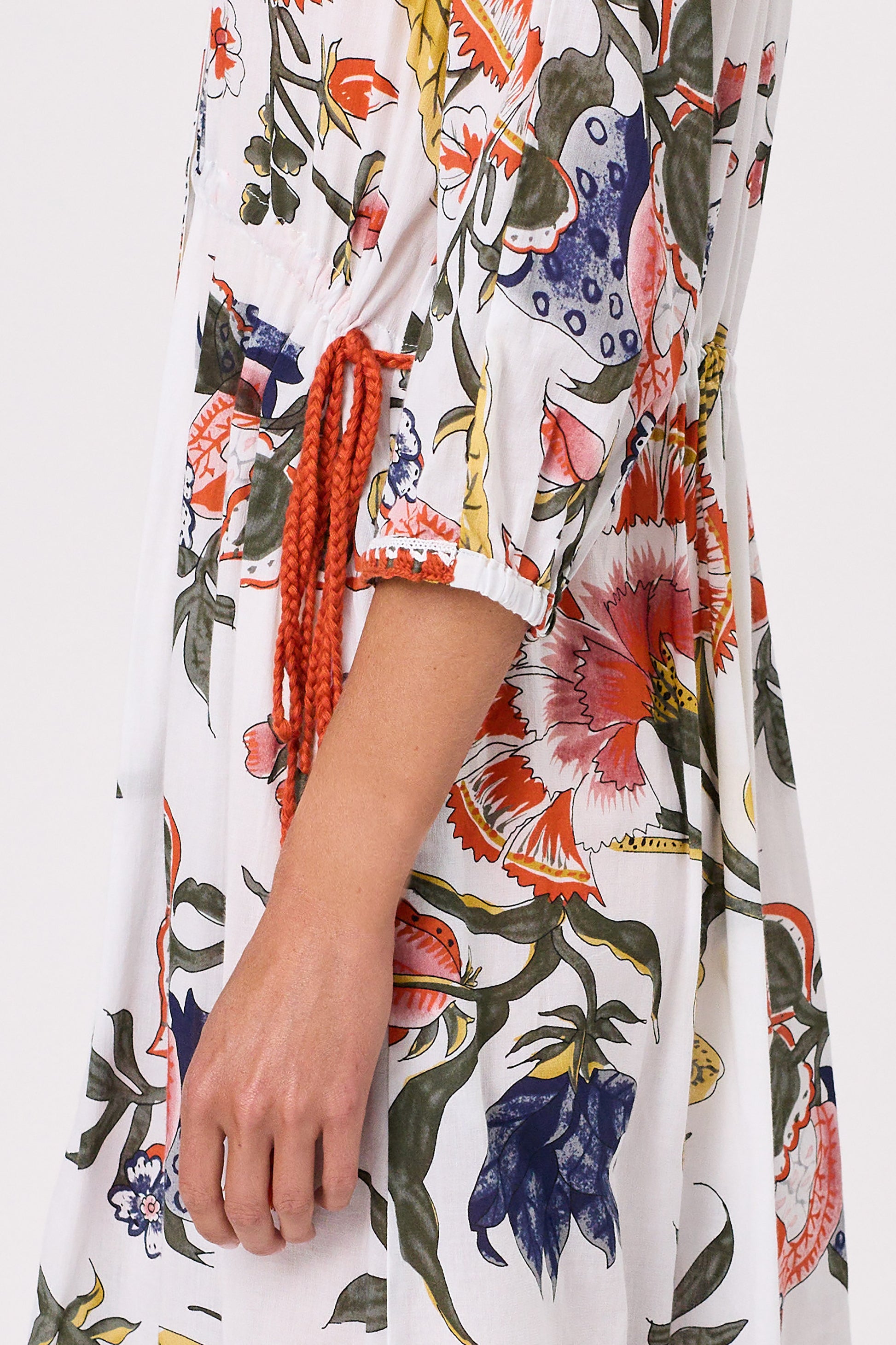 This Frankie print dress is made of soft cotton fabric. Features a round neckline with full button placket opening, raglan armhole with mid-length sleeves, lovely crochet trim at neckline and sleeve cuffs, side pockets, and adjustable ties at the waist.