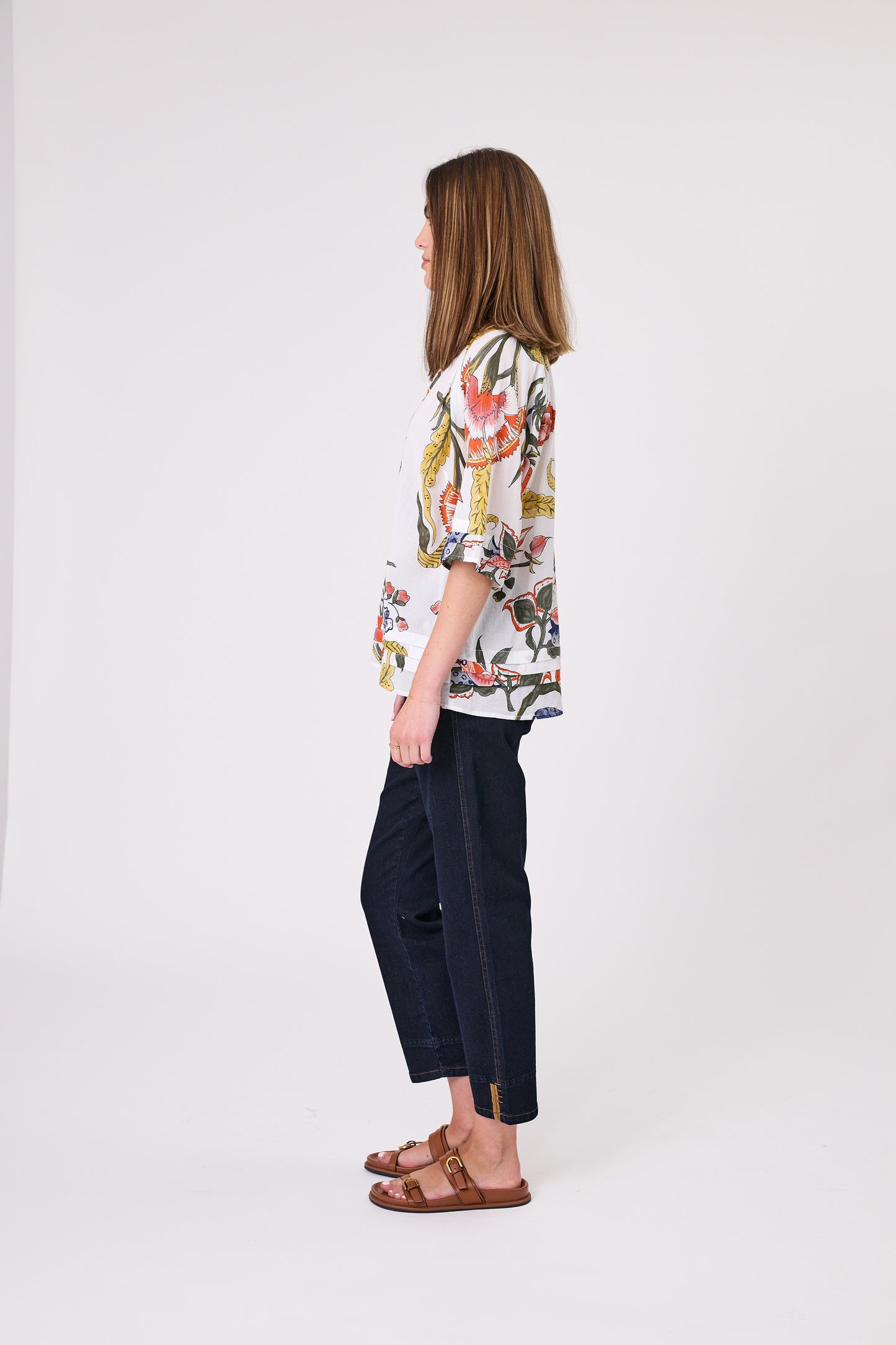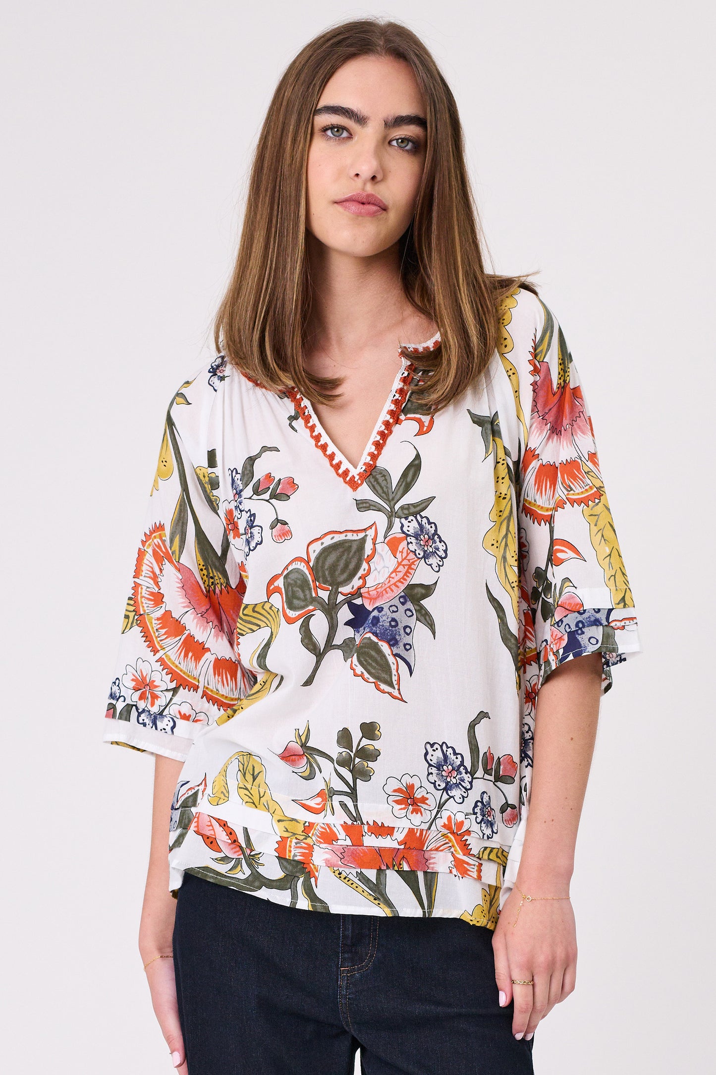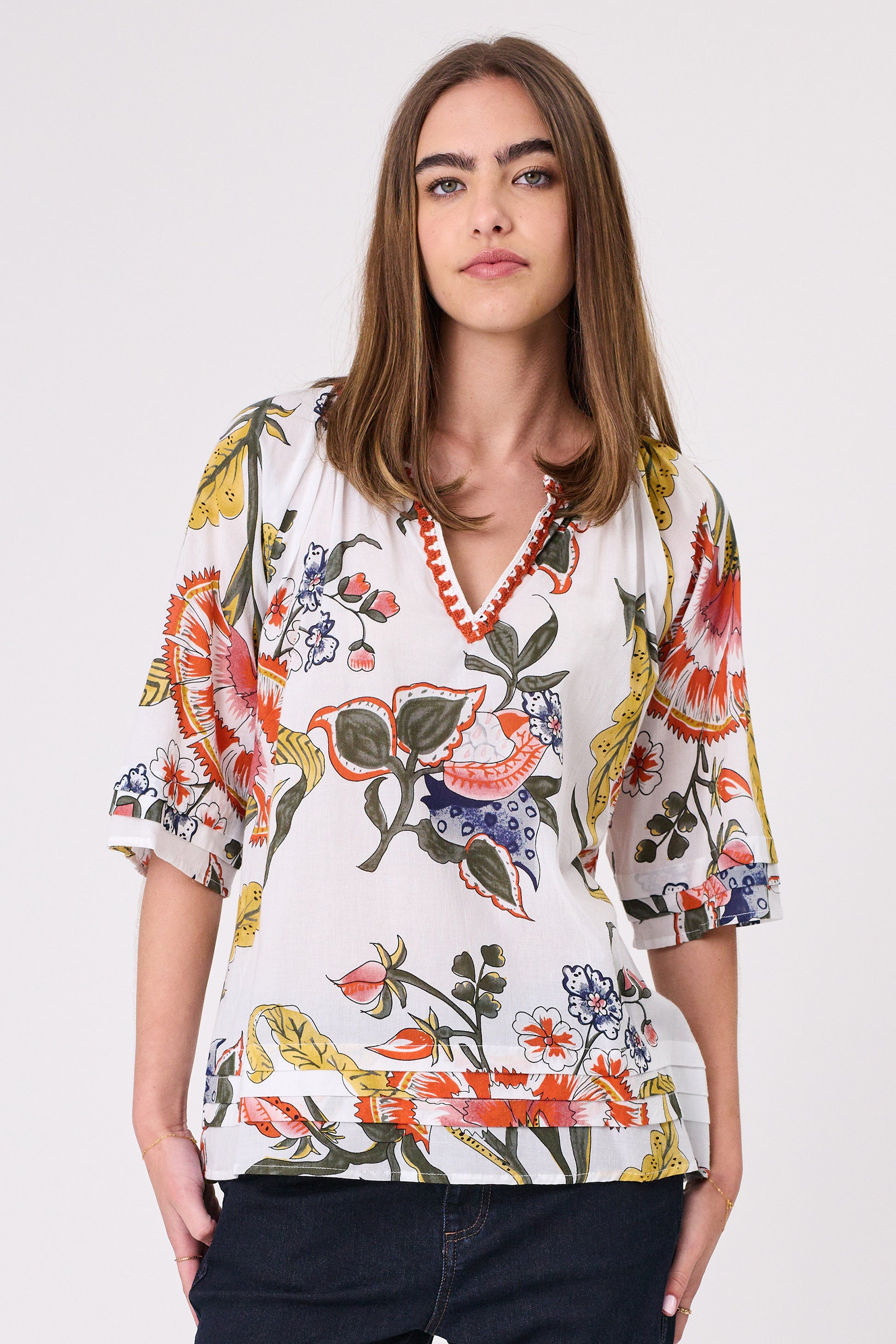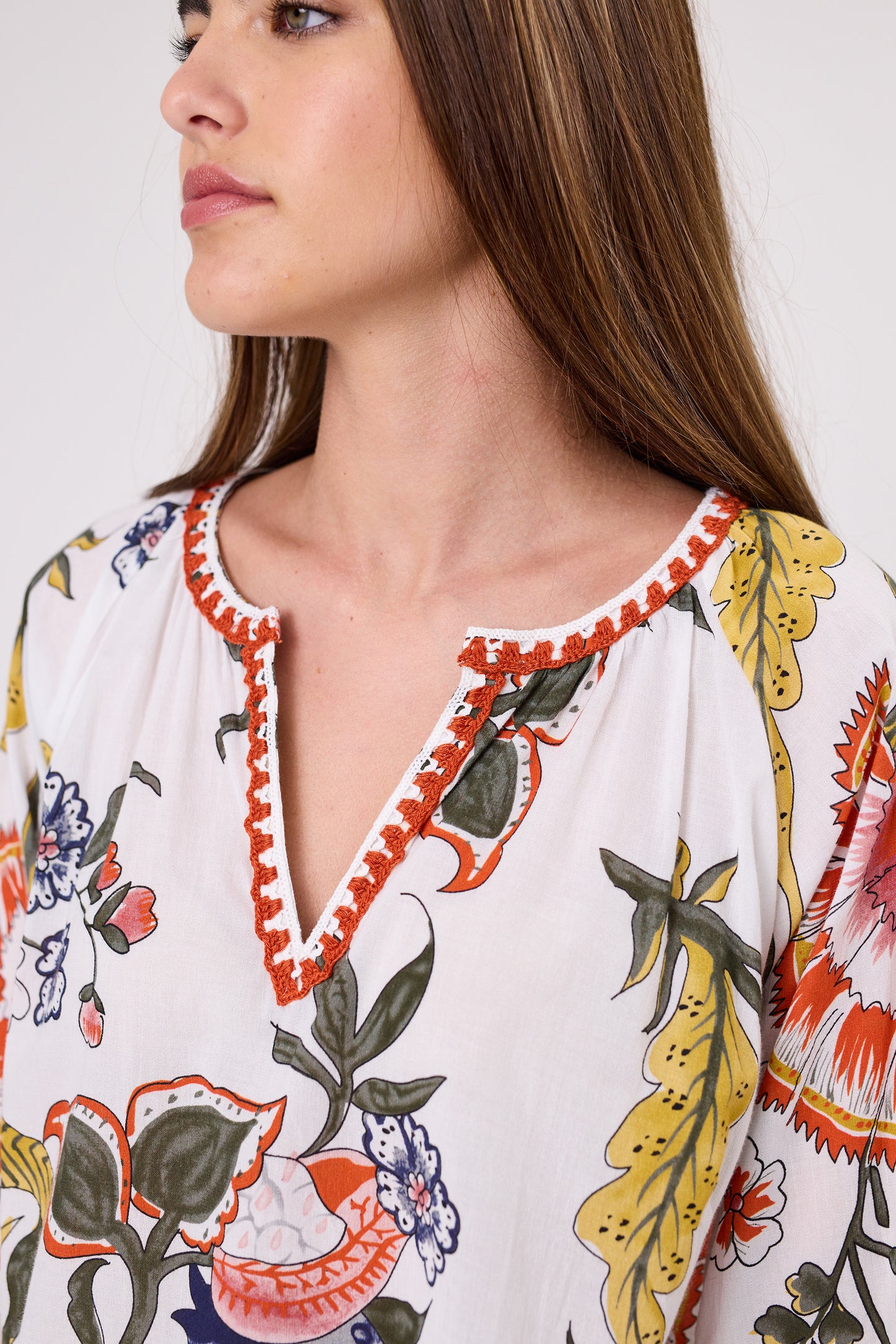 This Frankie print top is made of soft cotton fabric. Features a round neckline with V-shape opening, raglan armhole short sleeves with pleat detail, and lovely crochet trim at neckline and placket.