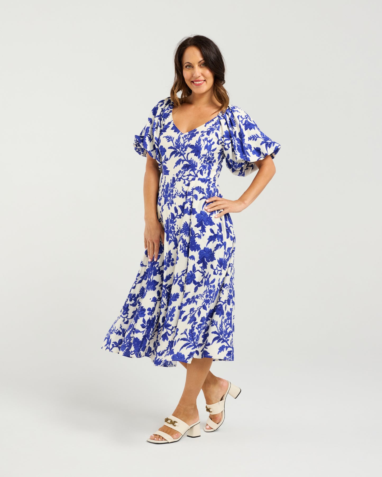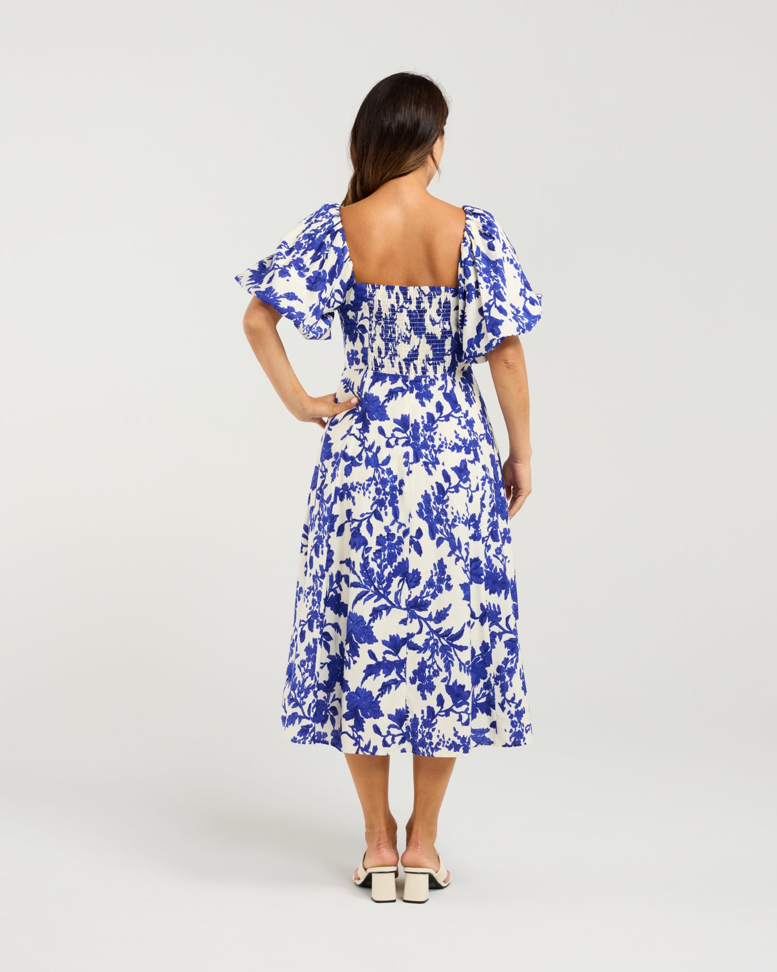 This dress makes a statement with its vivid blue floral print and flattering silhouette. Short puffed sleeves add volume and a playful touch, while the V-shaped neckline brings a touch of elegance. Designed to stand out, it’s a perfect balance of romantic charm and modern edge — ideal for garden parties, brunch dates, or any moment that calls for color and confidence. 80% Viscose, 20% Nylon (Main), 100% Rayon (Lining.)