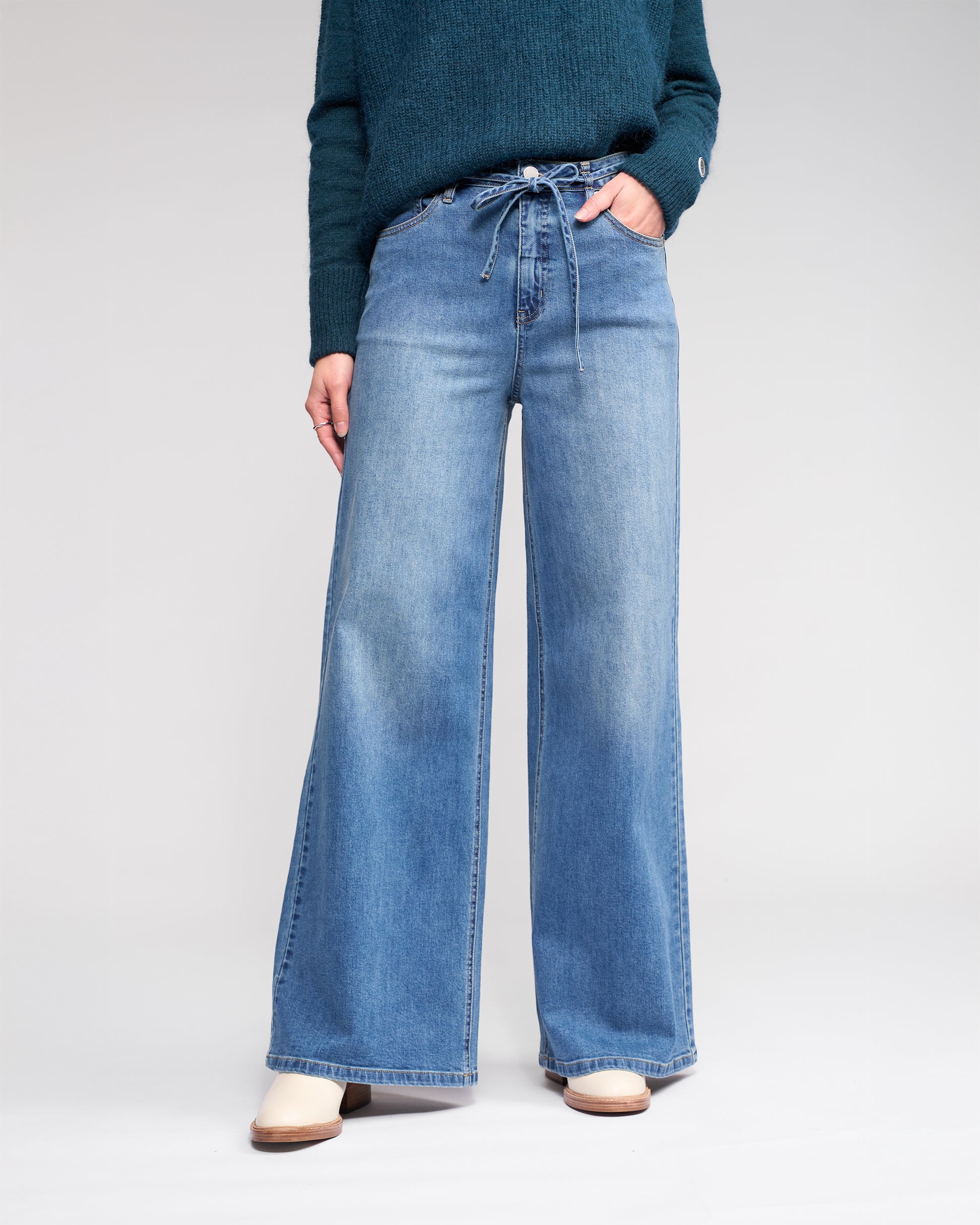 A full‑length wide‑leg jean in Washed Denim, a mid‑blue wash with a softly worn finish. Cut from stretch denim for a comfortable, flattering fit, this style is finished with a removable skinny denim tie belt that can be styled at the front for an added design detail. A relaxed yet polished silhouette designed for effortless everyday wear.