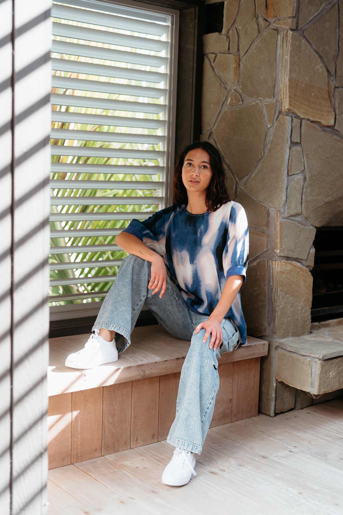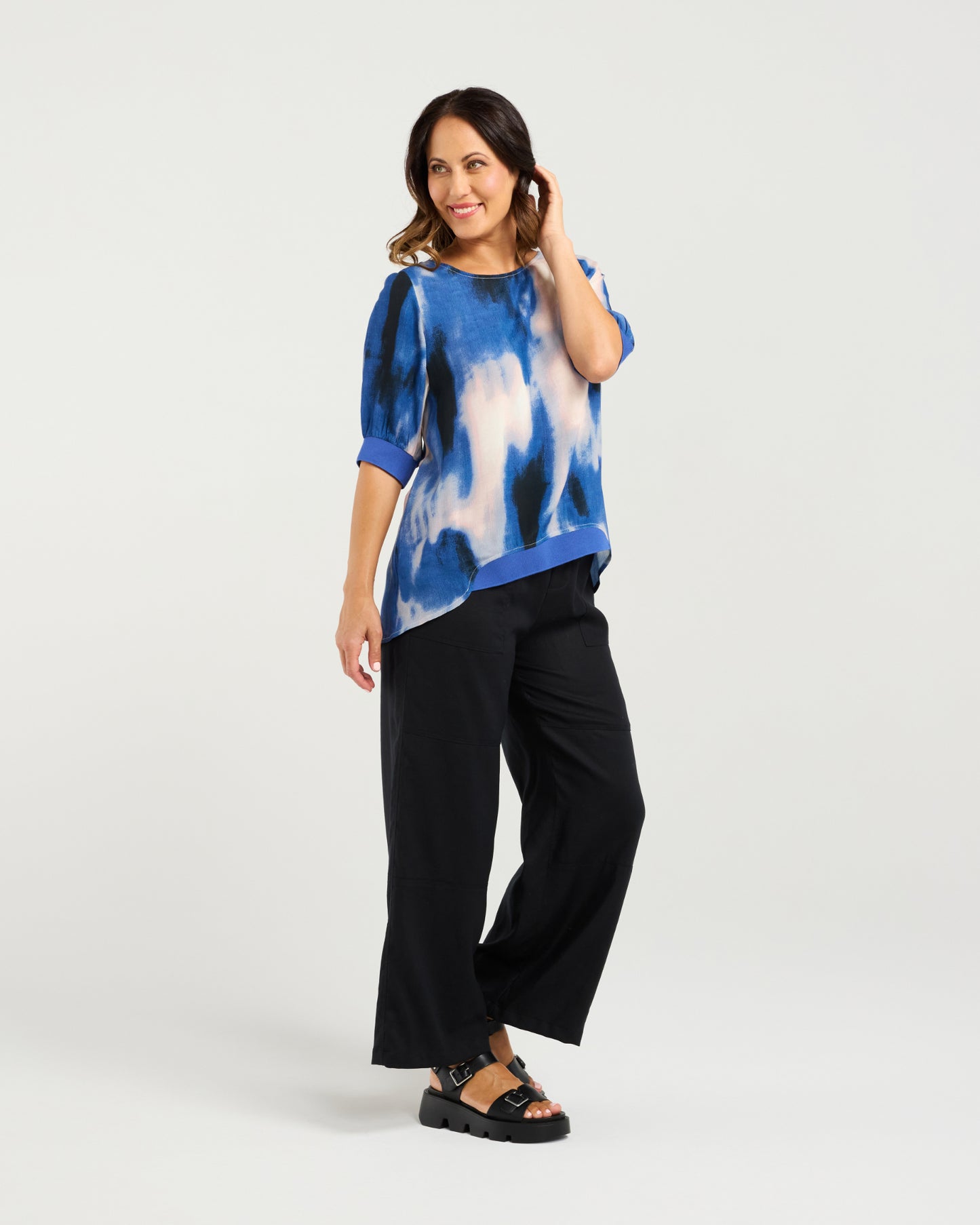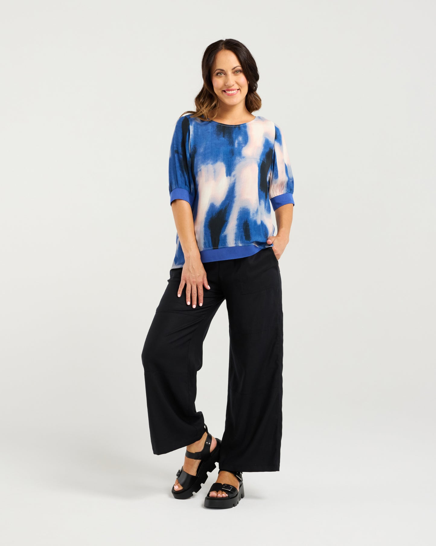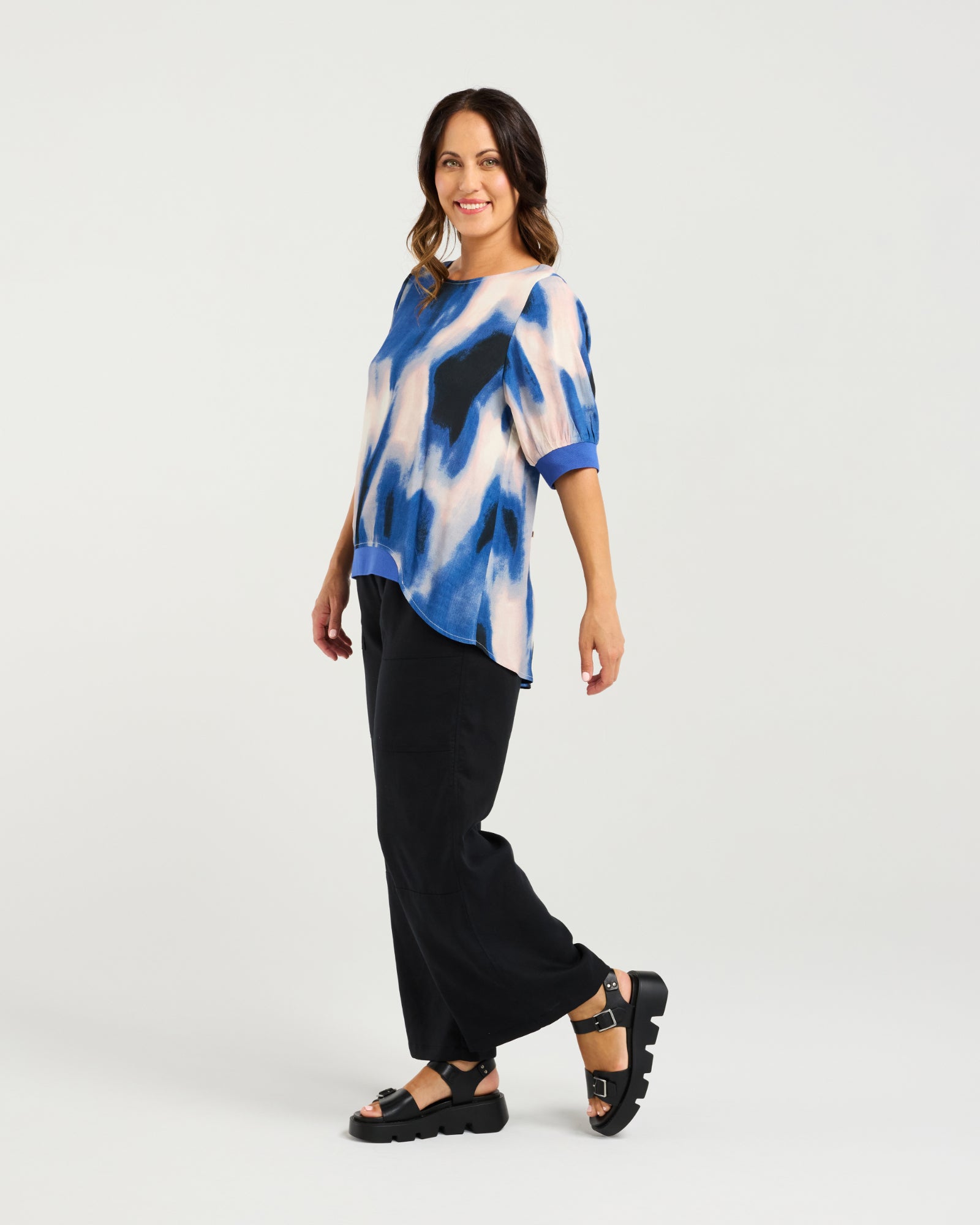Our stylish basic reimagined in the seasonal colours and prints. Features elbow-length sleeves, rib cuffs, and a ribbed hem. The front hem rests at waist length, while the back hem is rounded and falls below the hips, creating a chic and flattering look. 50% Viscose 50% Rayon.