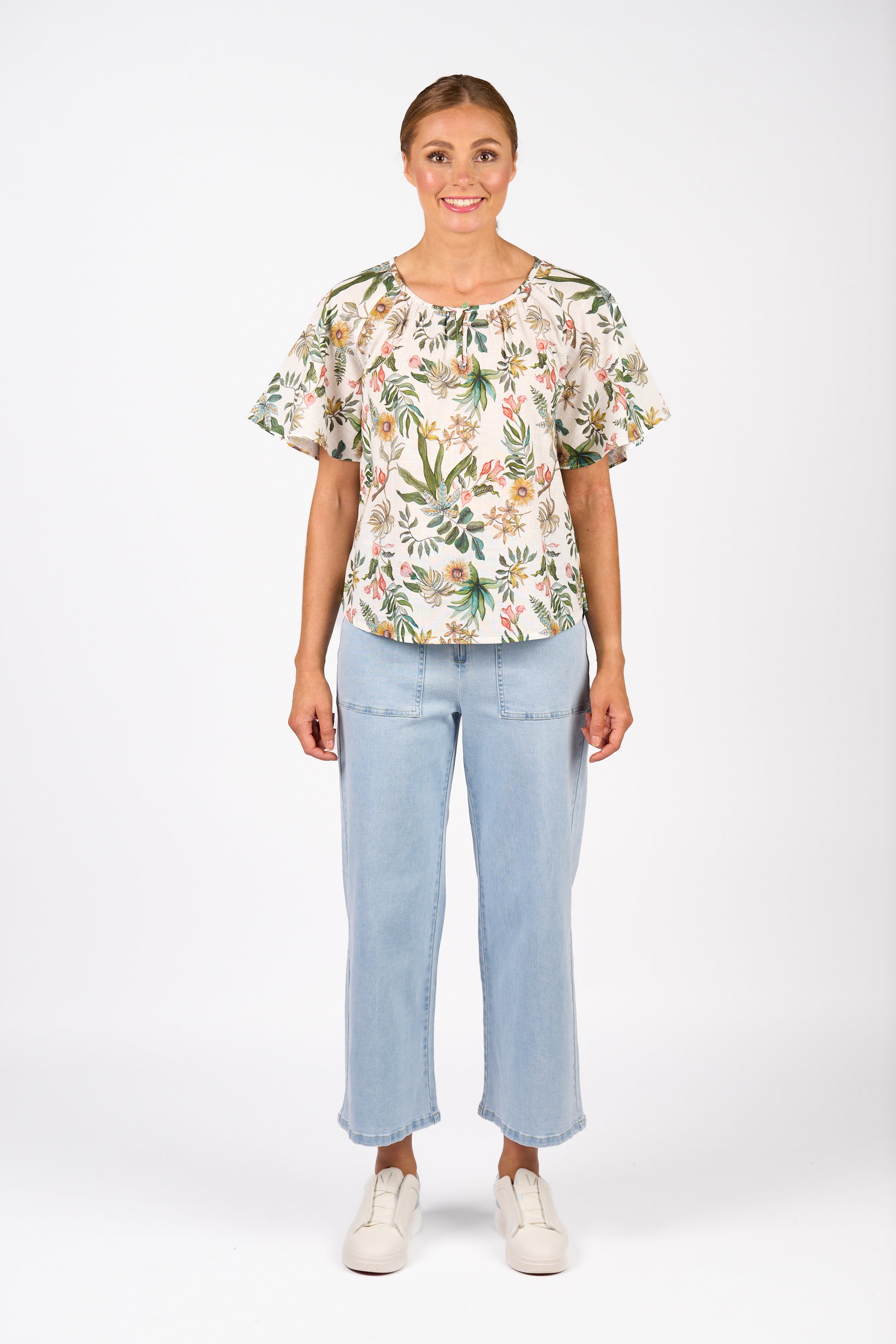 Made from lightweight 100% cotton with a linen look, the Hazel Top in Wild print combines effortless style with breezy comfort. It features a bound round neckline with a centre front placket, fastened with an enamel shank button, and gentle gathers at the front and back for a relaxed, feminine fit.