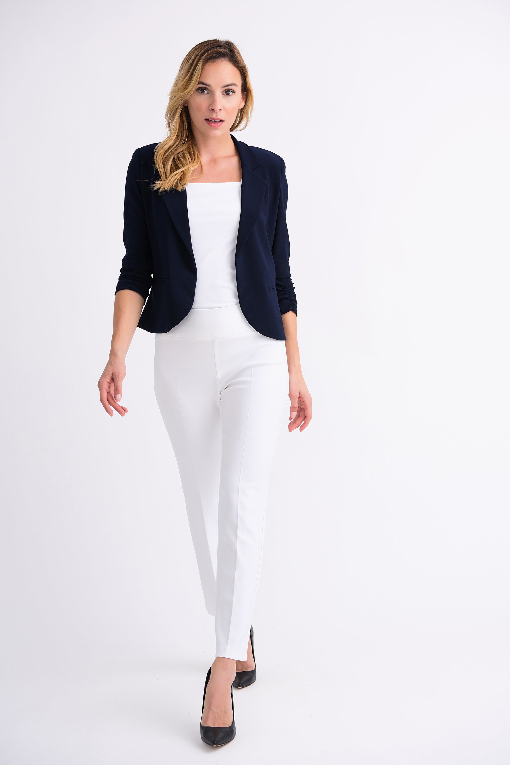 Sleek and stylish cover up. High neck back. Open front. Three quarter length sleeves with gathered cuffs. Beautiful jacket-like fit. Shoulder pads for a bold, modern look. No pockets. A sleek and beautiful cut. Designed in Canada by Joseph Ribkoff.