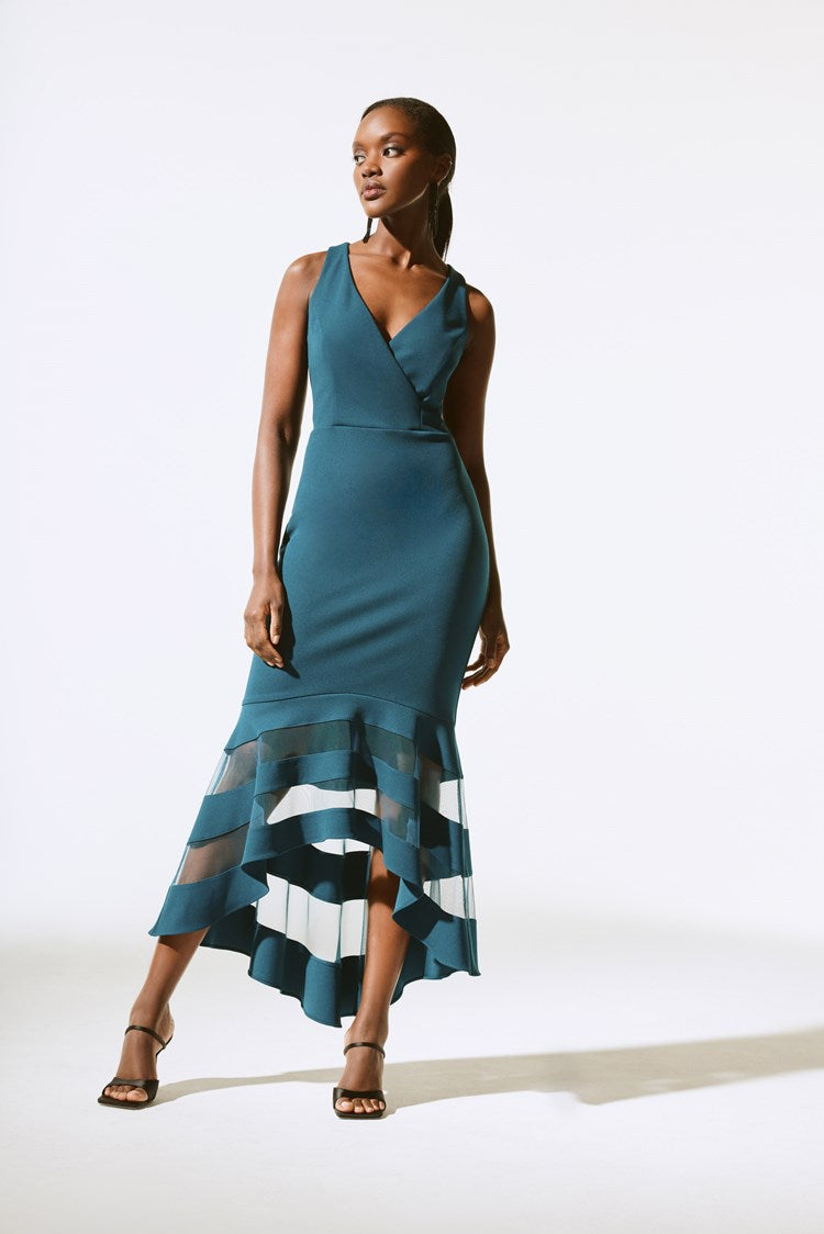 Bask in the sophistication of this sleeveless trumpet dress, where scuba crepe meets mesh in a stylish duet. The wrap neckline and inserted bands at the skirt's hem add unique flair to this modern design. The below-the-knee masterpiece also features a sleek back zipper closure, showcasing timeless elegance at its finest. Part of the Signature collection.
