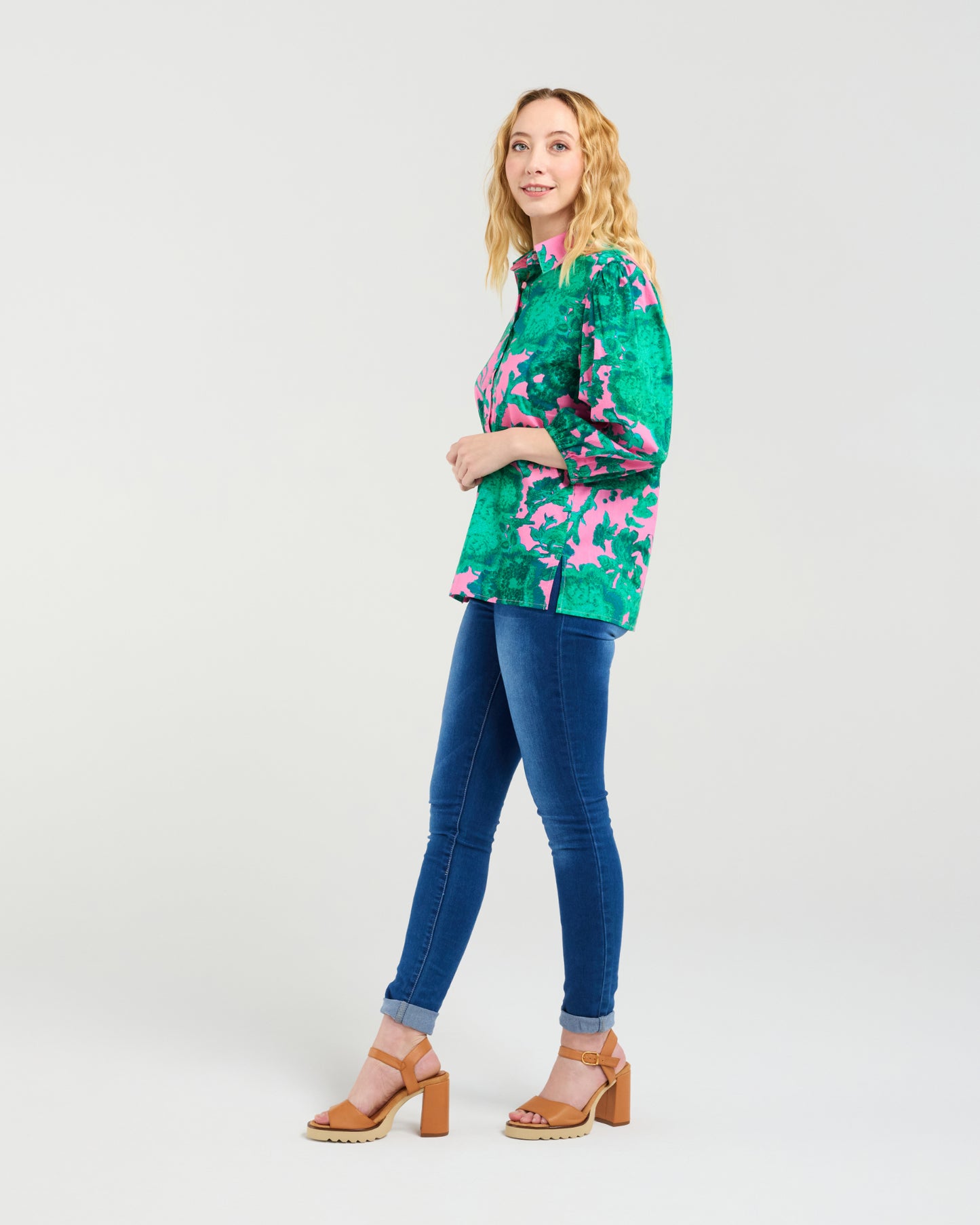 This stylish shirt blends tailored structure with soft, feminine details. It features a front button closure, elegant 3/4-length blouse sleeves, and a flattering, easy fit. The design is set against a pink background, adorned with green botanical artwork that adds a fresh, nature-inspired touch. A versatile piece that balances classic shirting with artistic charm.