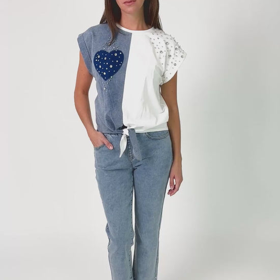Introducing a must-have tee from Frank Lyman that effortlessly blends casual charm with feminine elegance. Designed with a regular fit and hip-length cut, this top features jewel embellishments and a knotted front detail for a touch of sophistication. The crew neck and cap sleeves make it perfect for summer occasions, while the bold color-block and heart motif ensure you stand out.