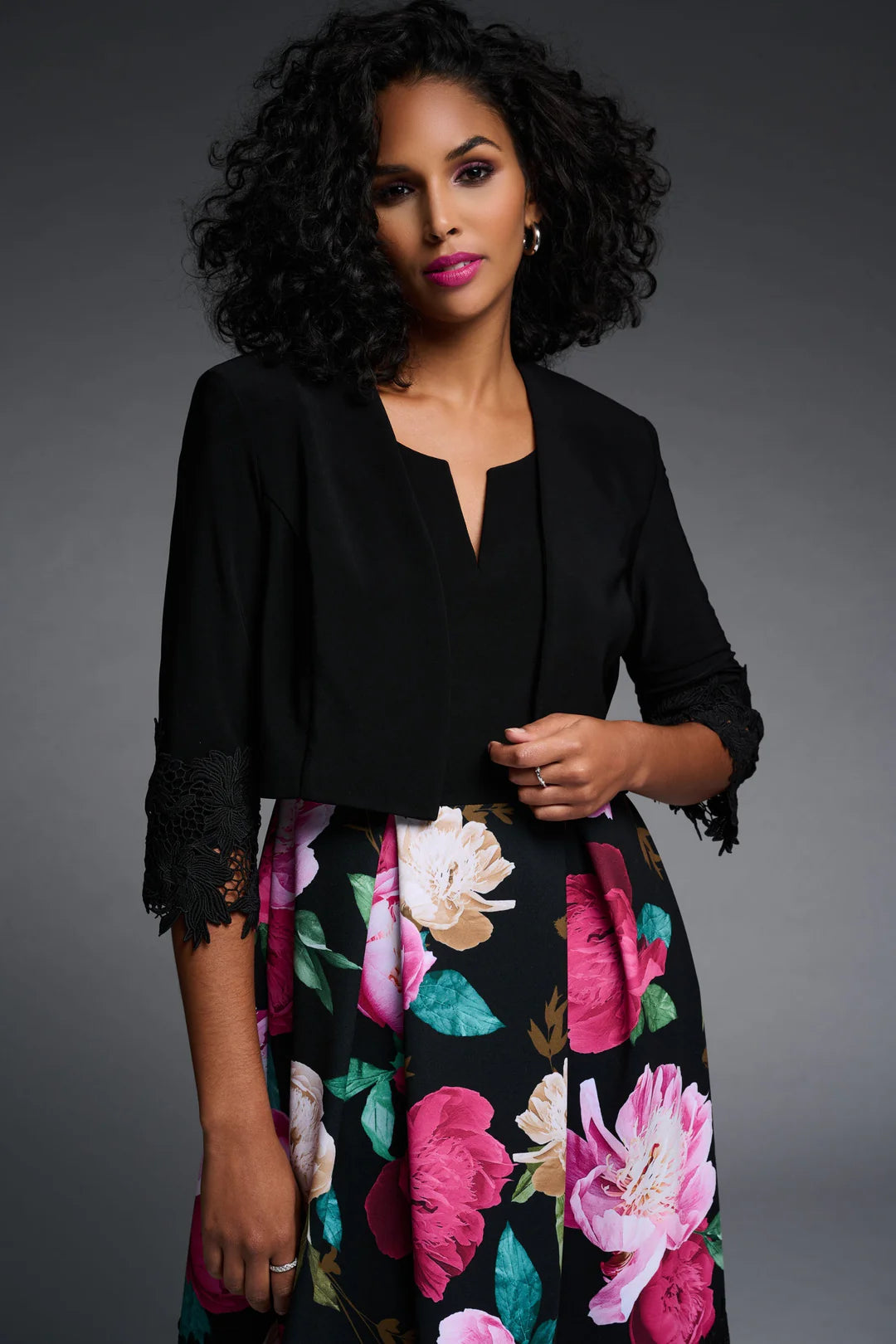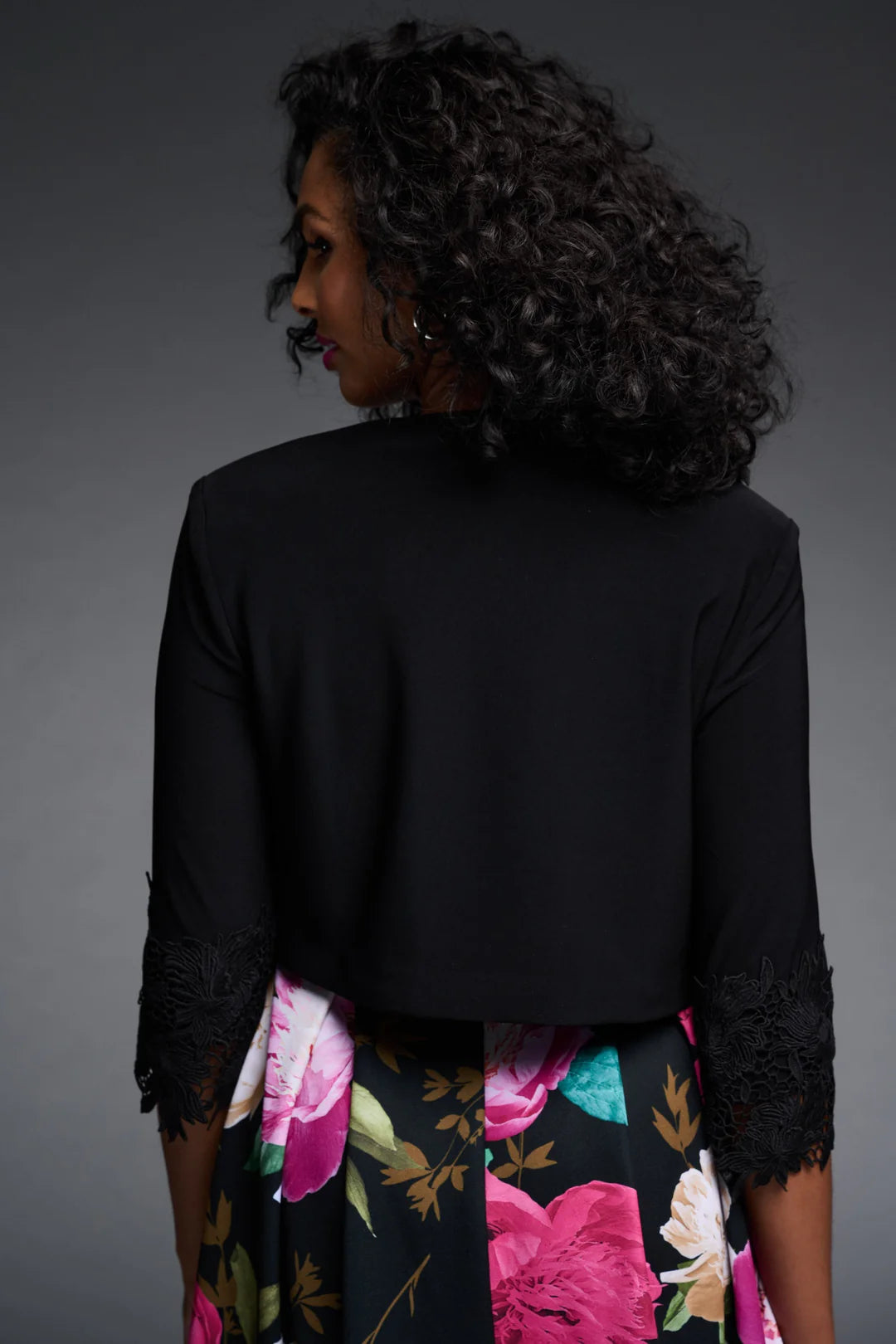 A sleek bolero from Joseph Ribkoff that tops off your evening ensemble magically, this style features lace detailing along the cuffs of its three-quarter sleeves for a touch of elegance.