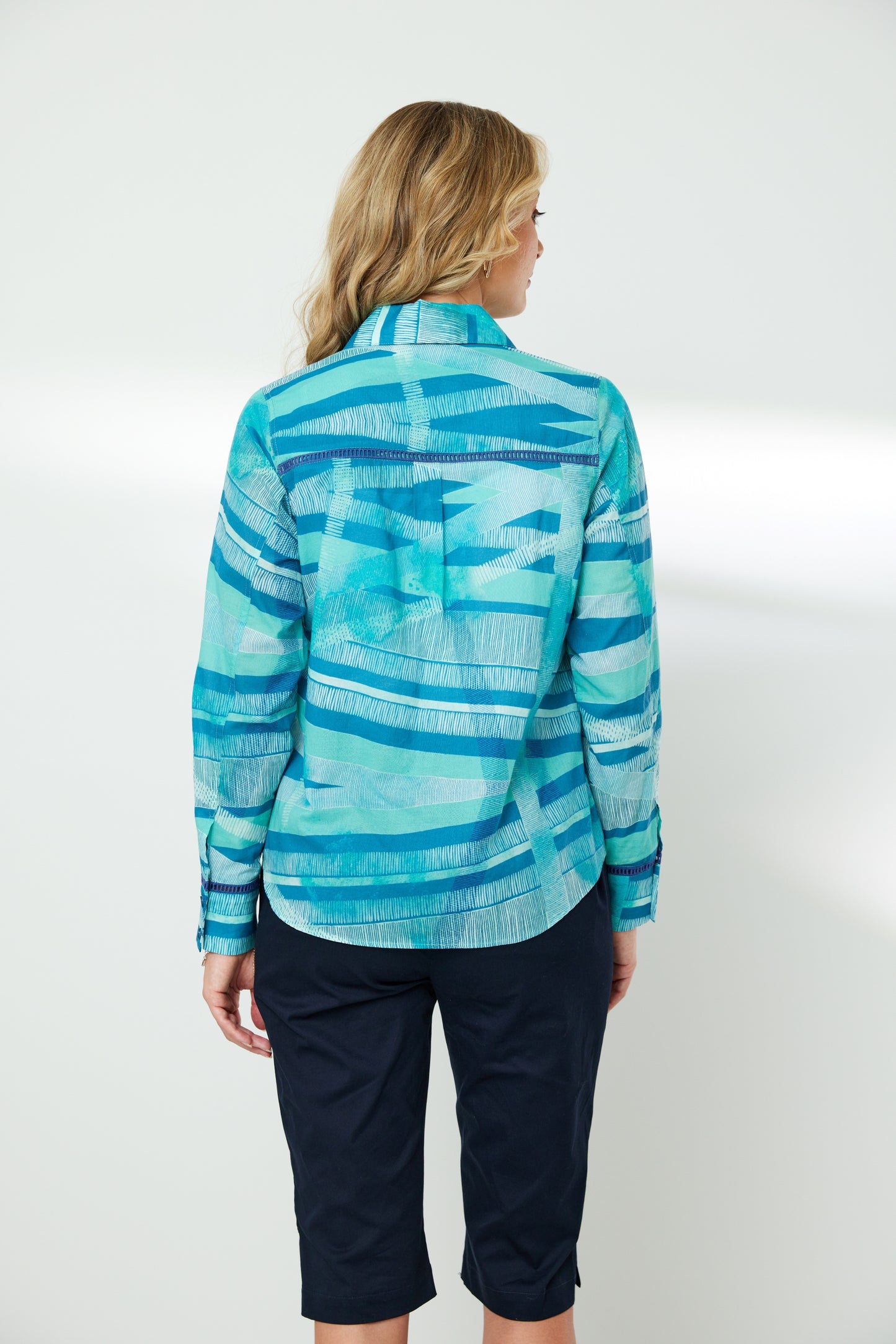 Geometric graphic printed button-up shirt with collar. Features long sleeves with double button cuffs and ladder lace trim. Front and back yoke panels are detailed with ladder lace trim at the seams, and a box pleat at the back yoke. The colours in this print pair beautifully with white, navy, denim, or black.