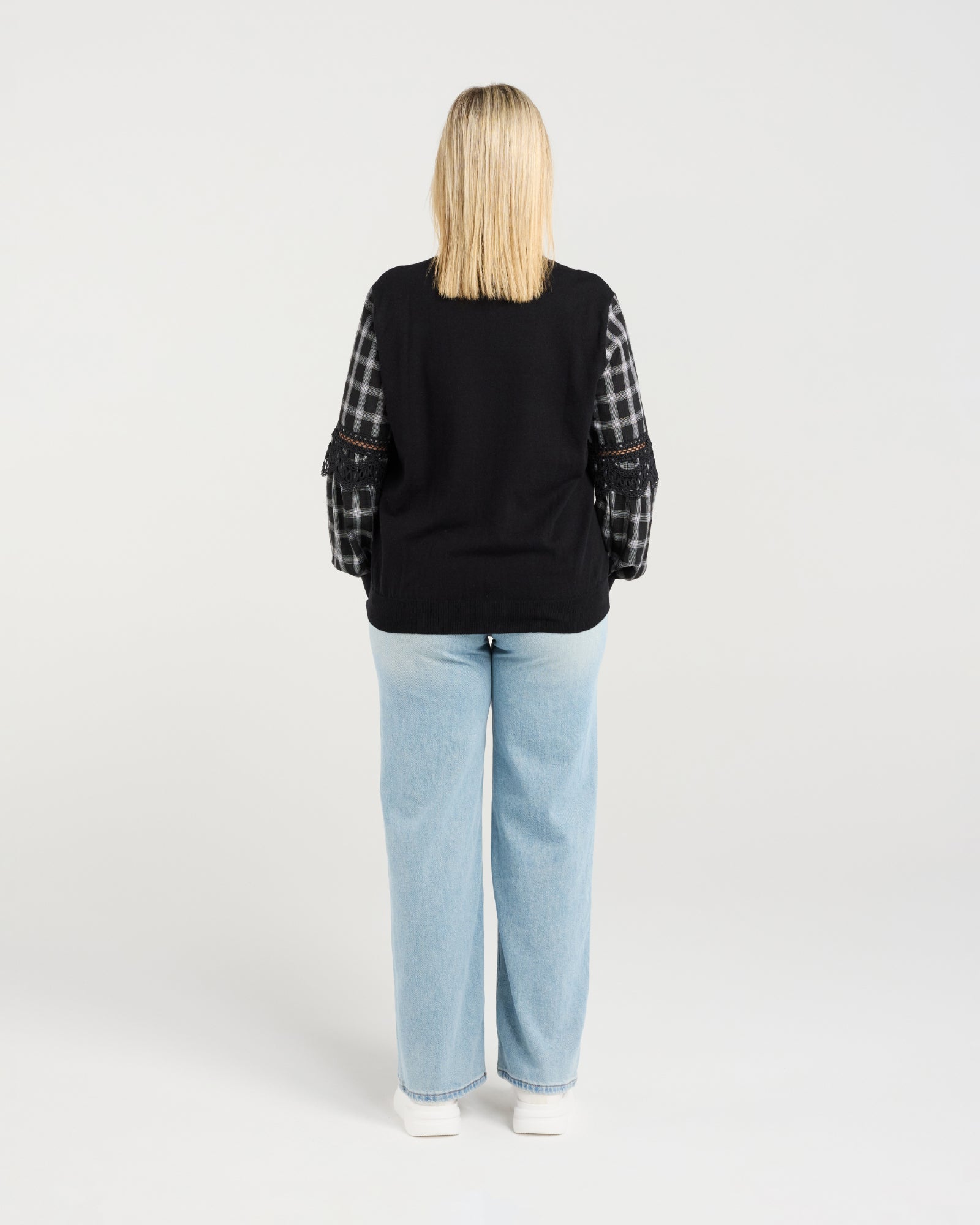 A long‑sleeve top designed to showcase beautifully crafted statement sleeves in a contrast fabric, detailed with delicate lace trim inserts. Finished with elasticated cuffs for comfort and warmth, this style brings effortless elegance to winter dressing while maintaining a clean, wearable silhouette.