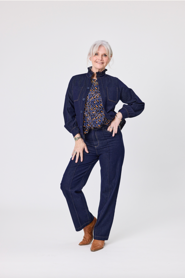 A cropped denim jacket designed with distinctive feminine detailing and relaxed structure. Featuring a high ruffled collar and a loose, easy fit, this style offers a modern twist on a classic silhouette. Gathered balloon‑style sleeves cinch neatly at the cuffs, while oversized chest pockets add both functionality and visual balance. Crafted from a comfortable cotton‑rich denim with stretch, it delivers flexibility and ease in a rich dark blue wash for effortless everyday layering.