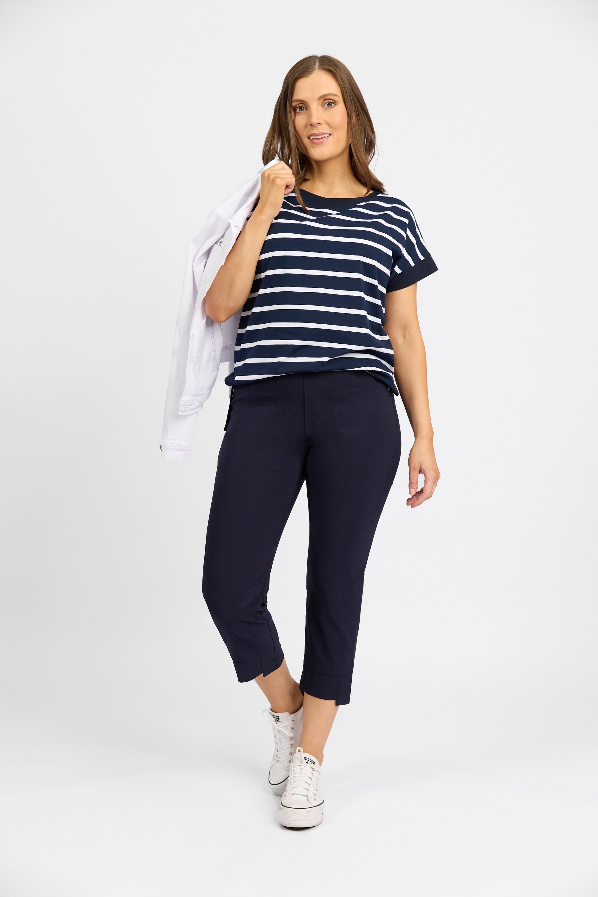The Macjays Roam Crop in Faille is a modern take on the classic 7/8 pant. Sharp lines define this silhouette, with a stepped hem complemented by angled front pockets. Perfect for showing a hint of leg or offering an ankle-grazer fit for shorter women. Faille fabric delivers lightweight flexibility, soft texture, and casual elegance—while maintaining exceptional quality.