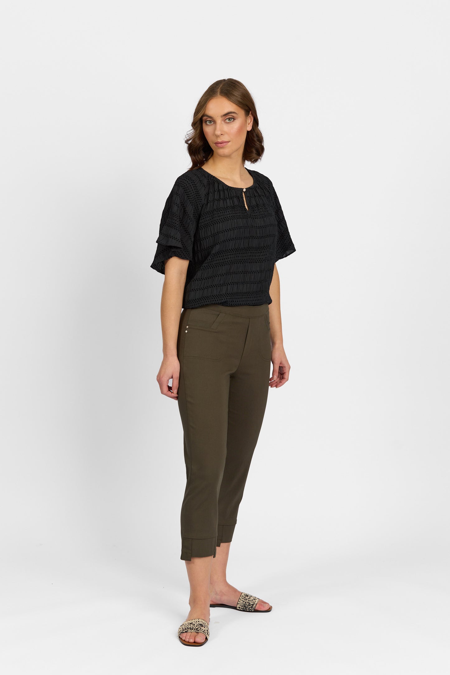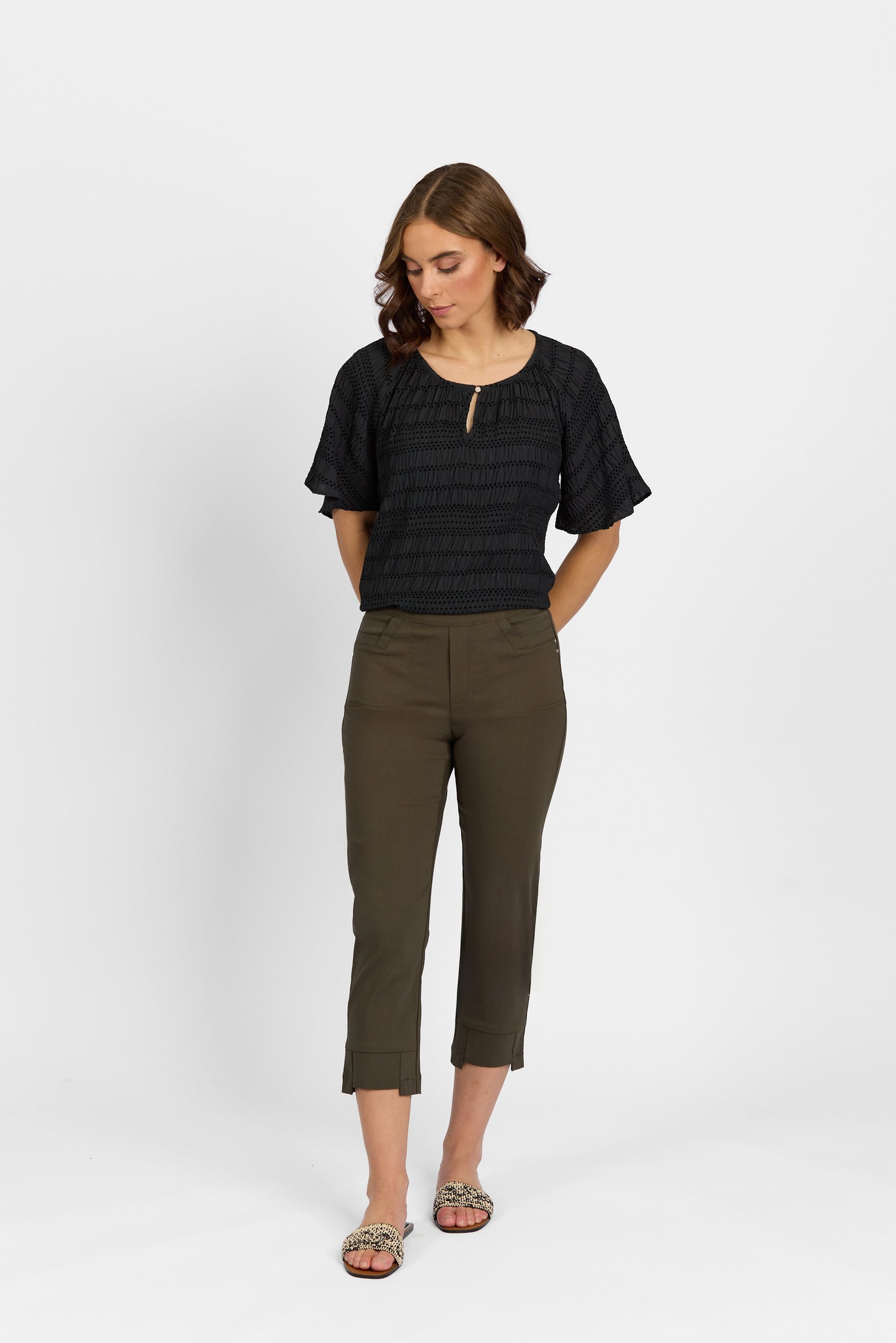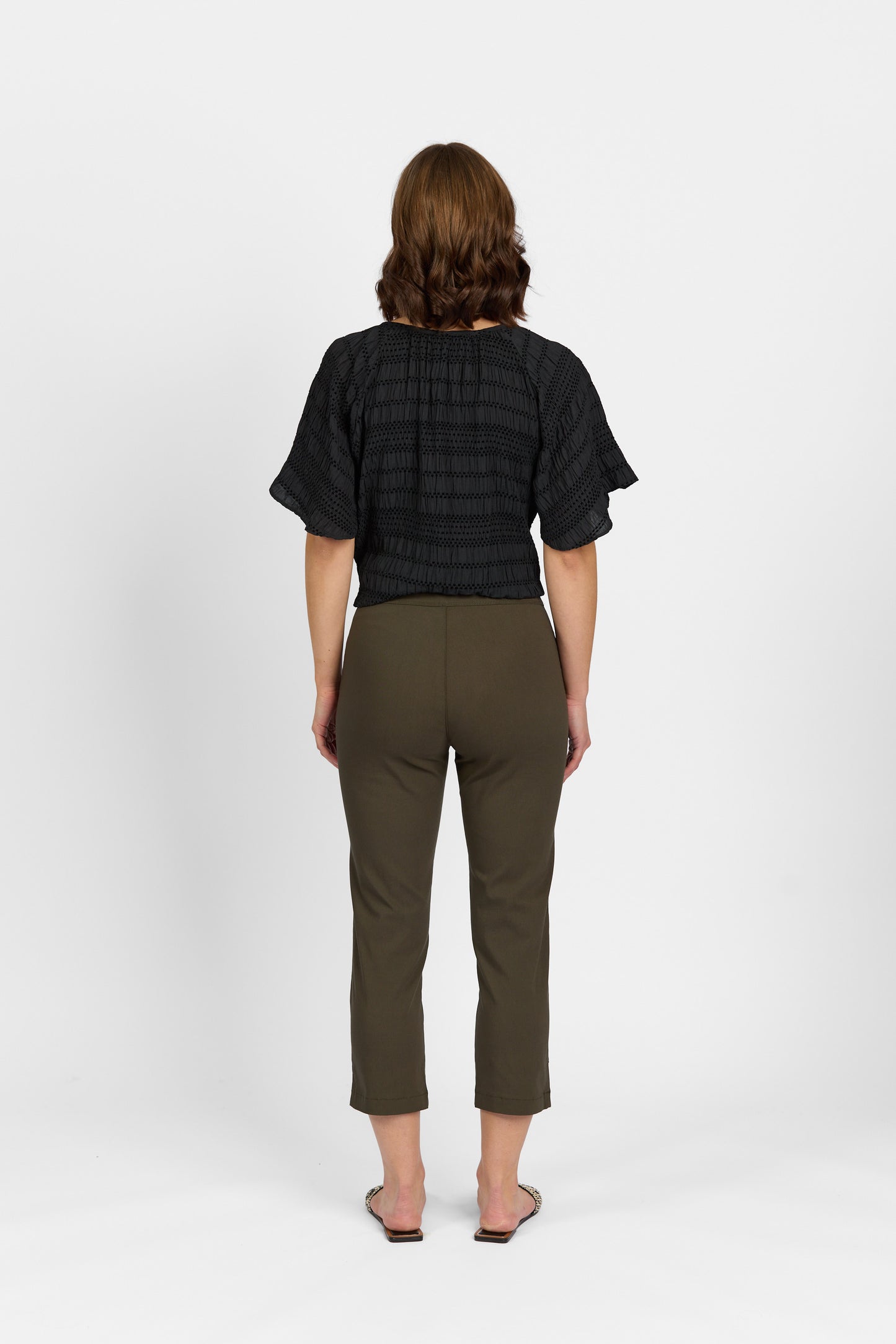 The Macjays Roam Crop in Faille is a modern take on the classic 7/8 pant. Sharp lines define this silhouette, with a stepped hem complemented by angled front pockets. Perfect for showing a hint of leg or offering an ankle-grazer fit for shorter women. Faille fabric delivers lightweight flexibility, soft texture, and casual elegance—while maintaining exceptional quality.
