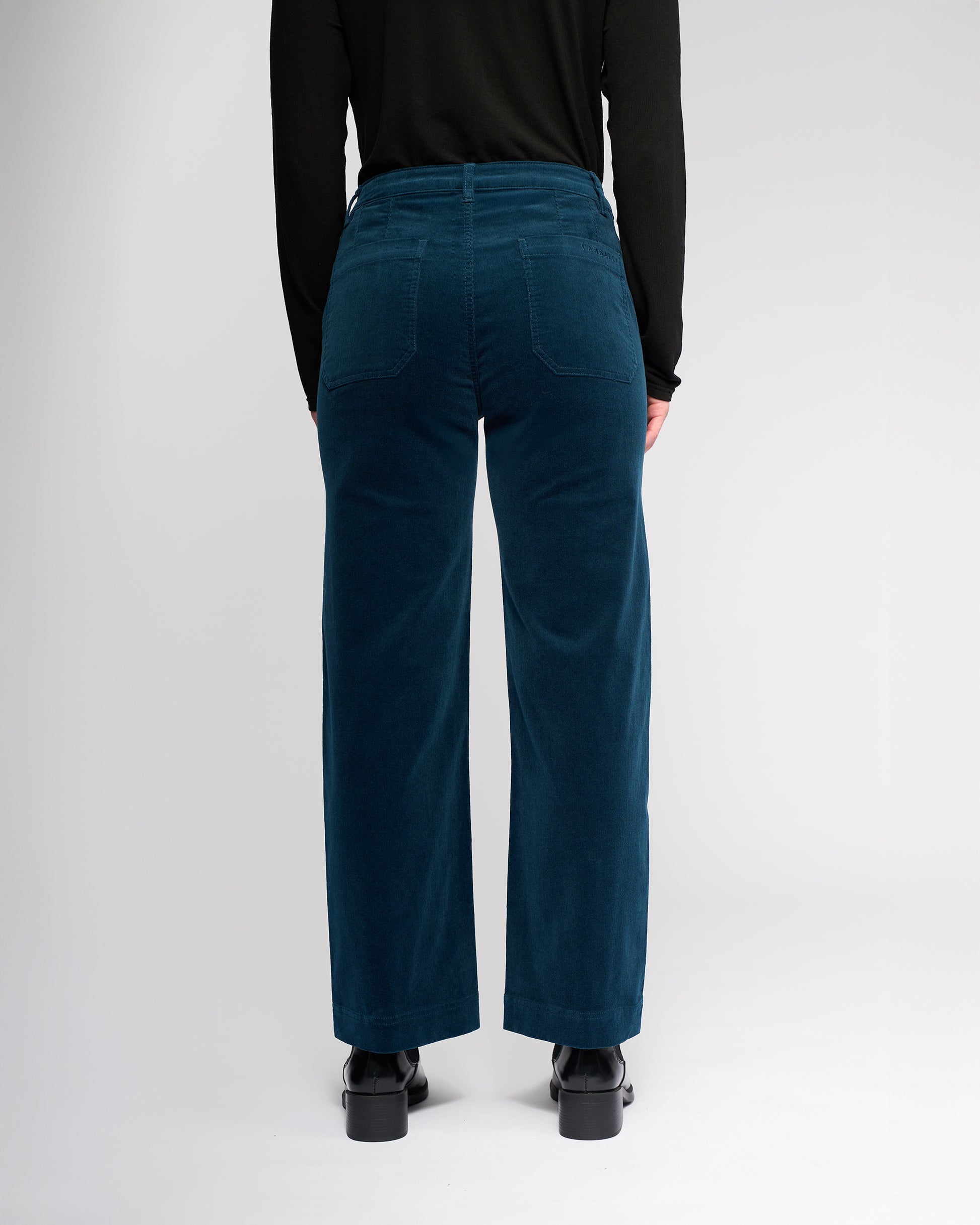 A straight‑leg, ankle‑grazer pant crafted from stretch pinwale cord in our Petrol colourway — a deep blue‑green teal designed for effortless everyday styling. Featuring a smooth, pocket‑free front aside from a single coin pocket, this style offers a clean, streamlined look. The waistband includes a metal ‘V’ logo jean button, belt loops, and a zip fly, while tailored back darts provide subtle shaping. Finished with two back patch pockets and ‘Vassalli’ embroidery above the right pocket.