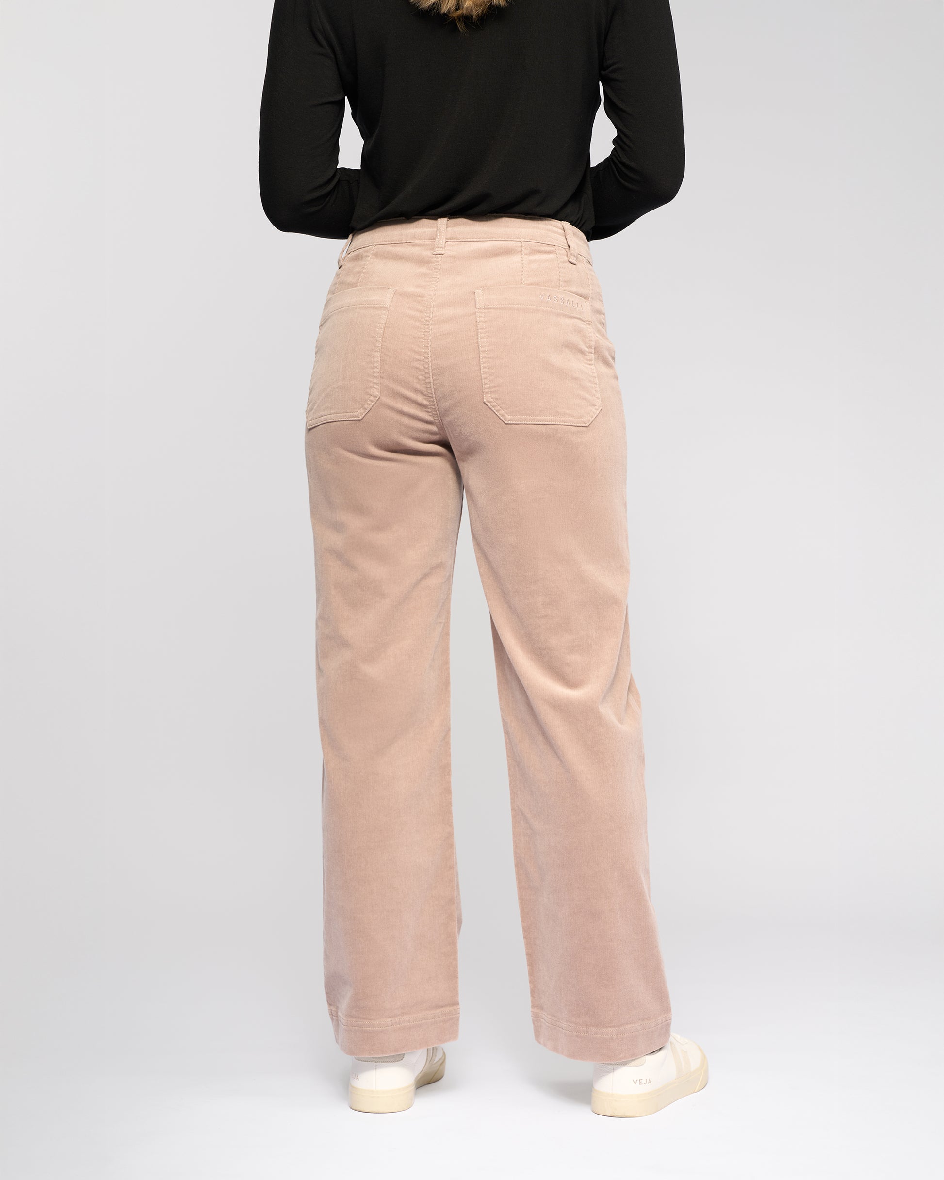 A straight‑leg, ankle‑grazer pant crafted from stretch pinwale cord in our Twig colourway — a soft beigey‑pink‑mushroom neutral designed for effortless everyday dressing. Featuring a clean front with a single coin pocket, this style offers a smooth, streamlined silhouette. The waistband is finished with a metal ‘V’ logo jean button, belt loops, and a zip fly, while tailored back darts provide subtle shaping. Two back patch pockets and ‘Vassalli’ embroidery above the right pocket complete the look.