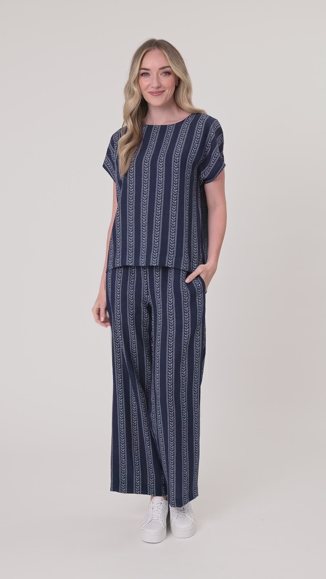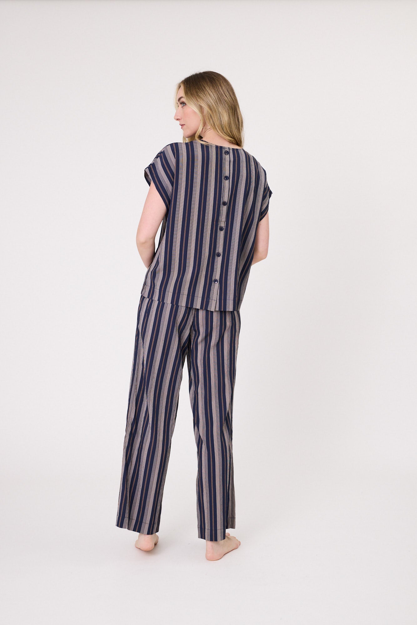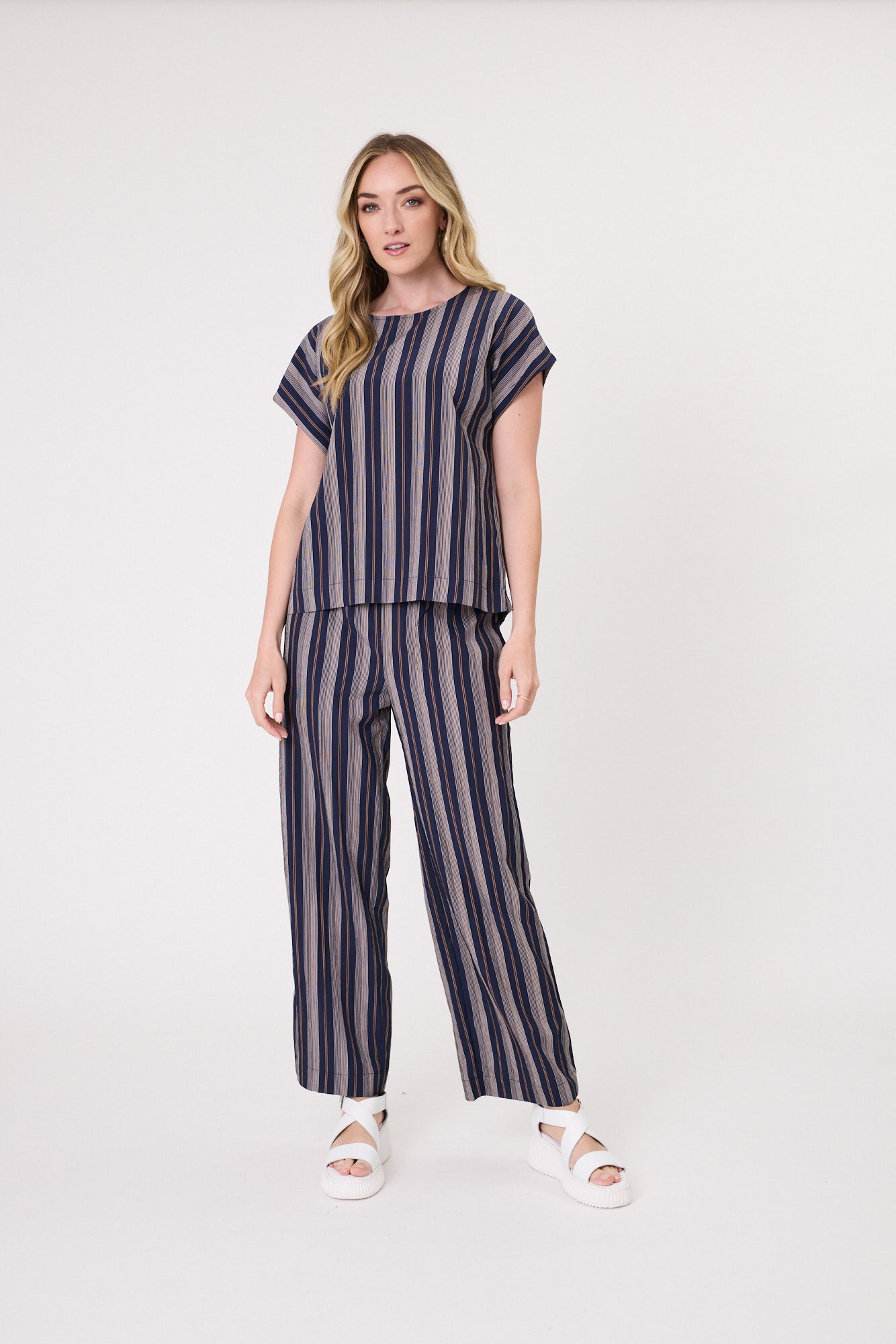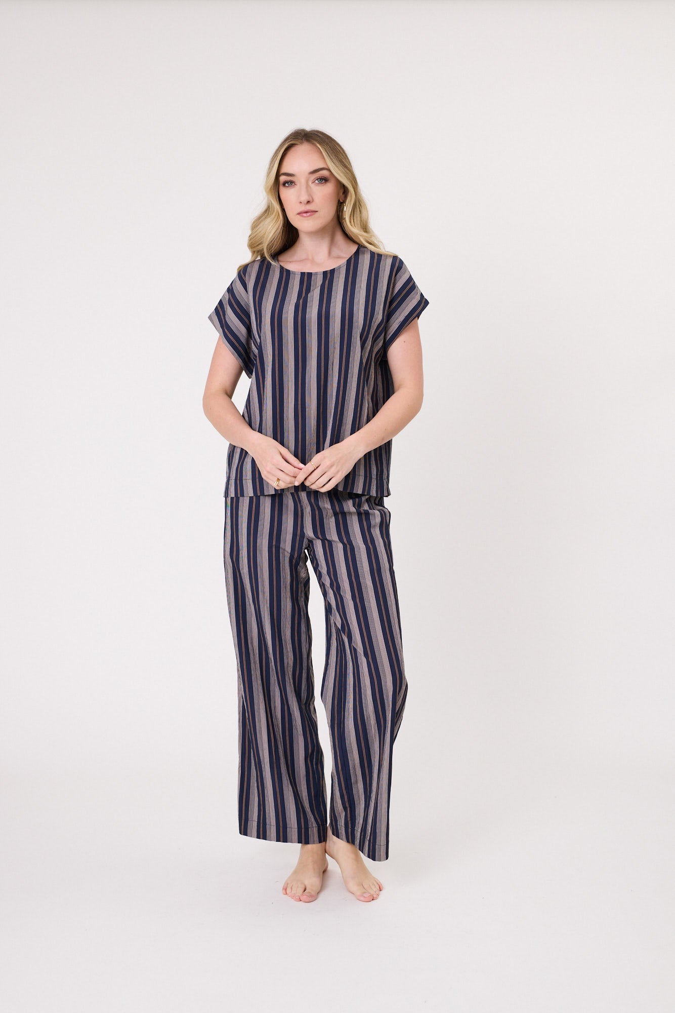 A relaxed summer staple featuring a nautical-inspired stripe in white and mocha on a navy background. Designed with a loose fit and side pockets, the silhouette is both breezy and effortless—perfect for warm weather styling. Crafted from a lightweight cotton-viscose blend for everyday comfort and ease.
