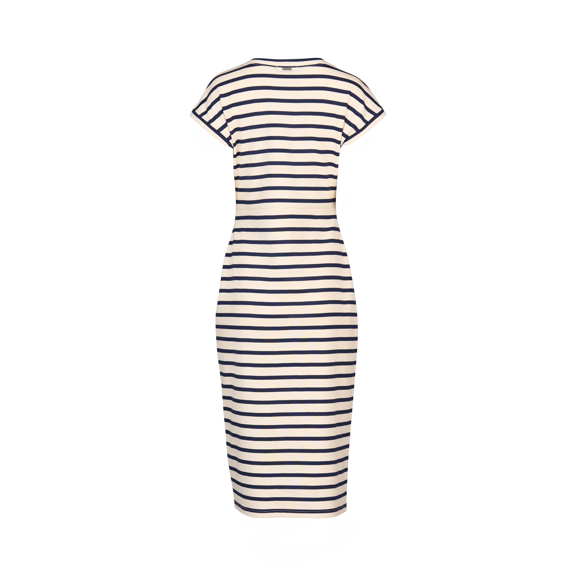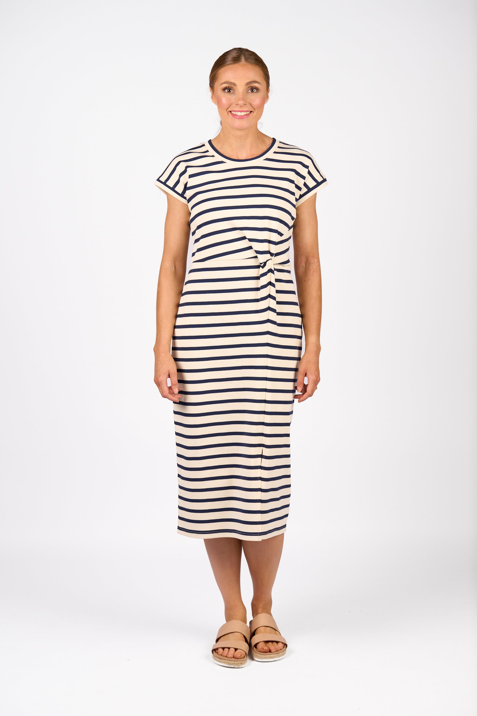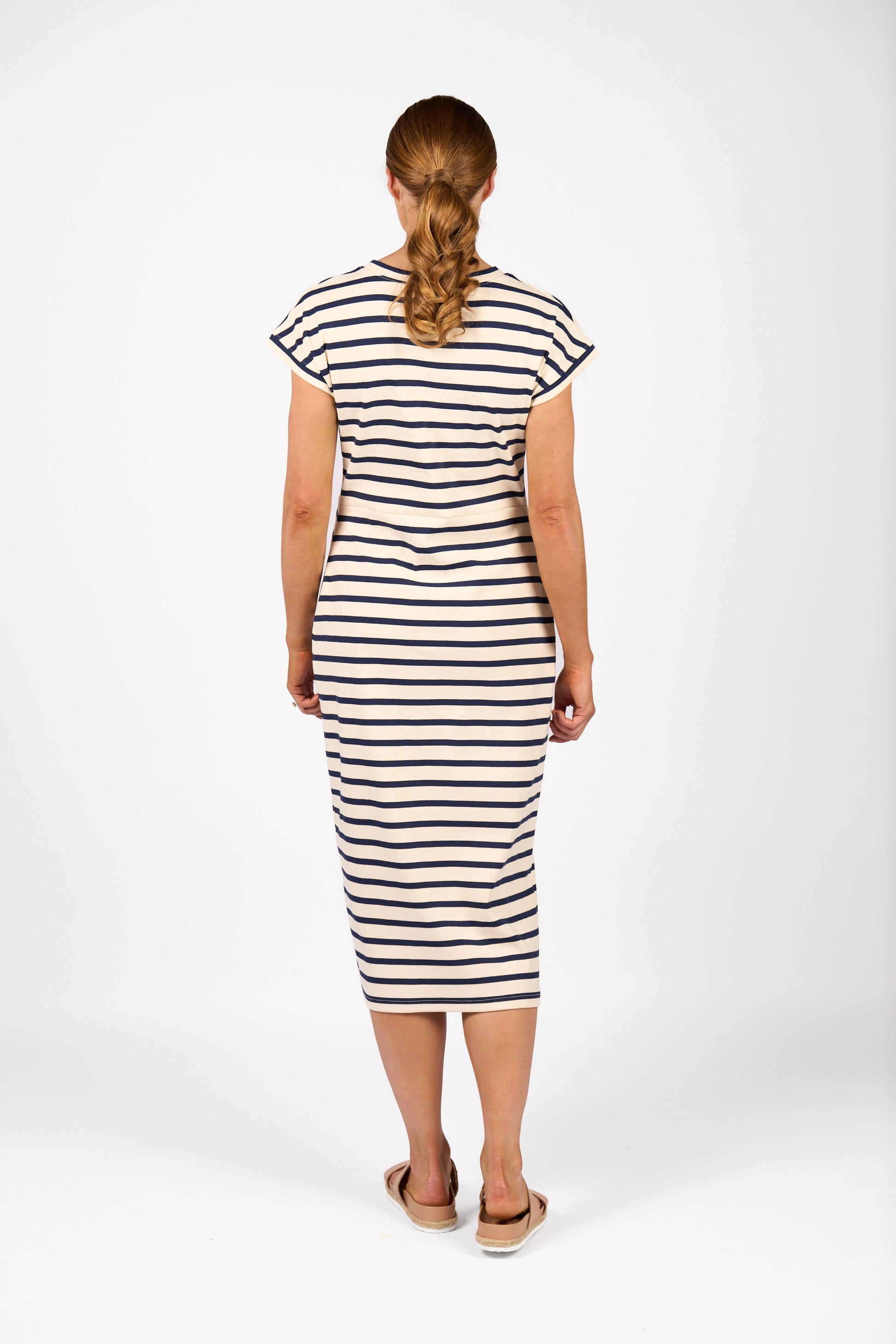 The Parker Dress blends comfort and polish with its soft stretch cotton knit and thoughtful detailing. Featuring a drop shoulder and short sleeves with a cuffed edge, it’s designed for effortless wear and a flattering silhouette.