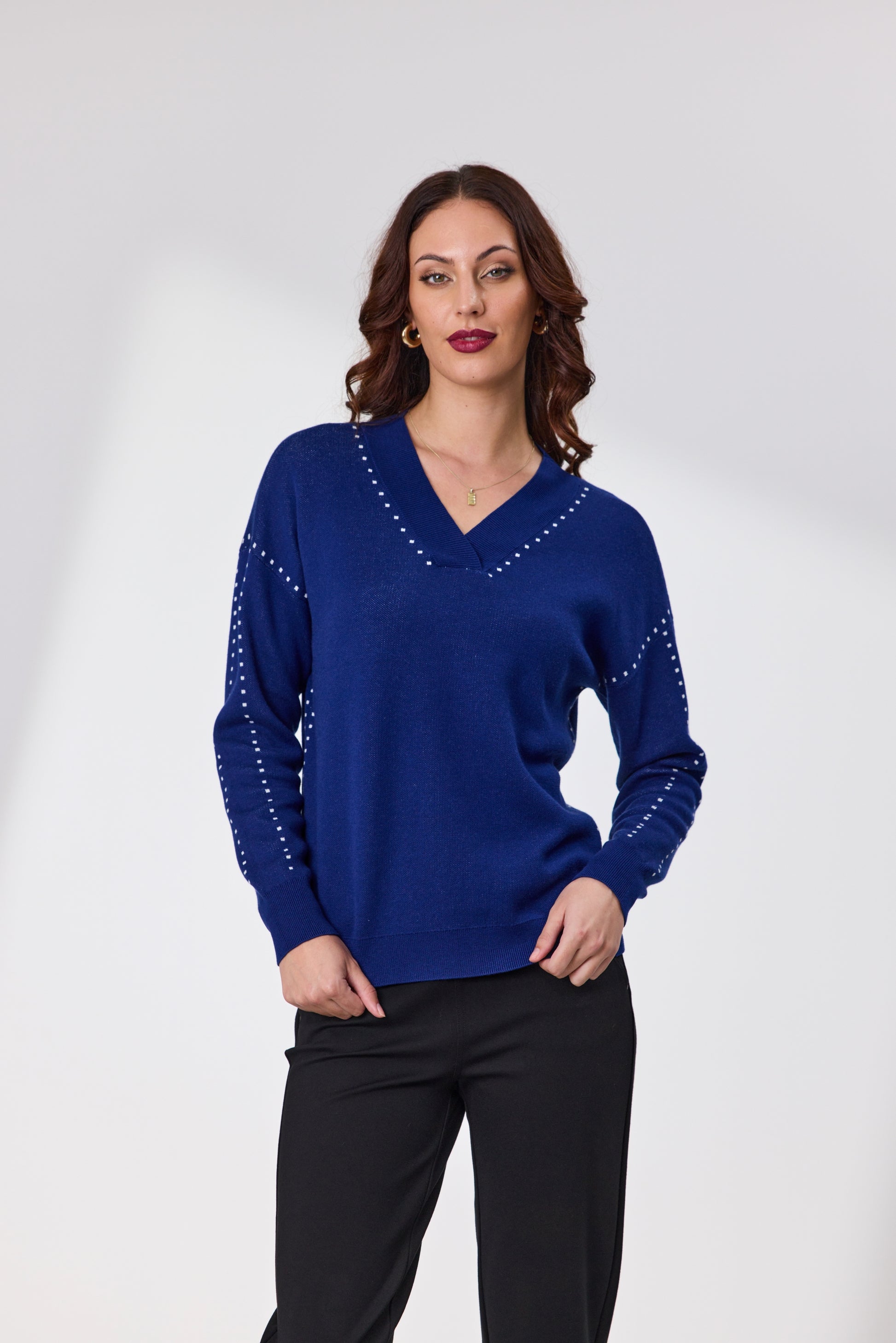 Crafted from a luxurious cotton cashmere blend, this sweater features a stylish cross-over V-neck and relaxed dropped shoulders for a modern silhouette. The full jacquard knit is accented with delicate spot detailing around the neckline and sleeves, adding subtle texture and charm.