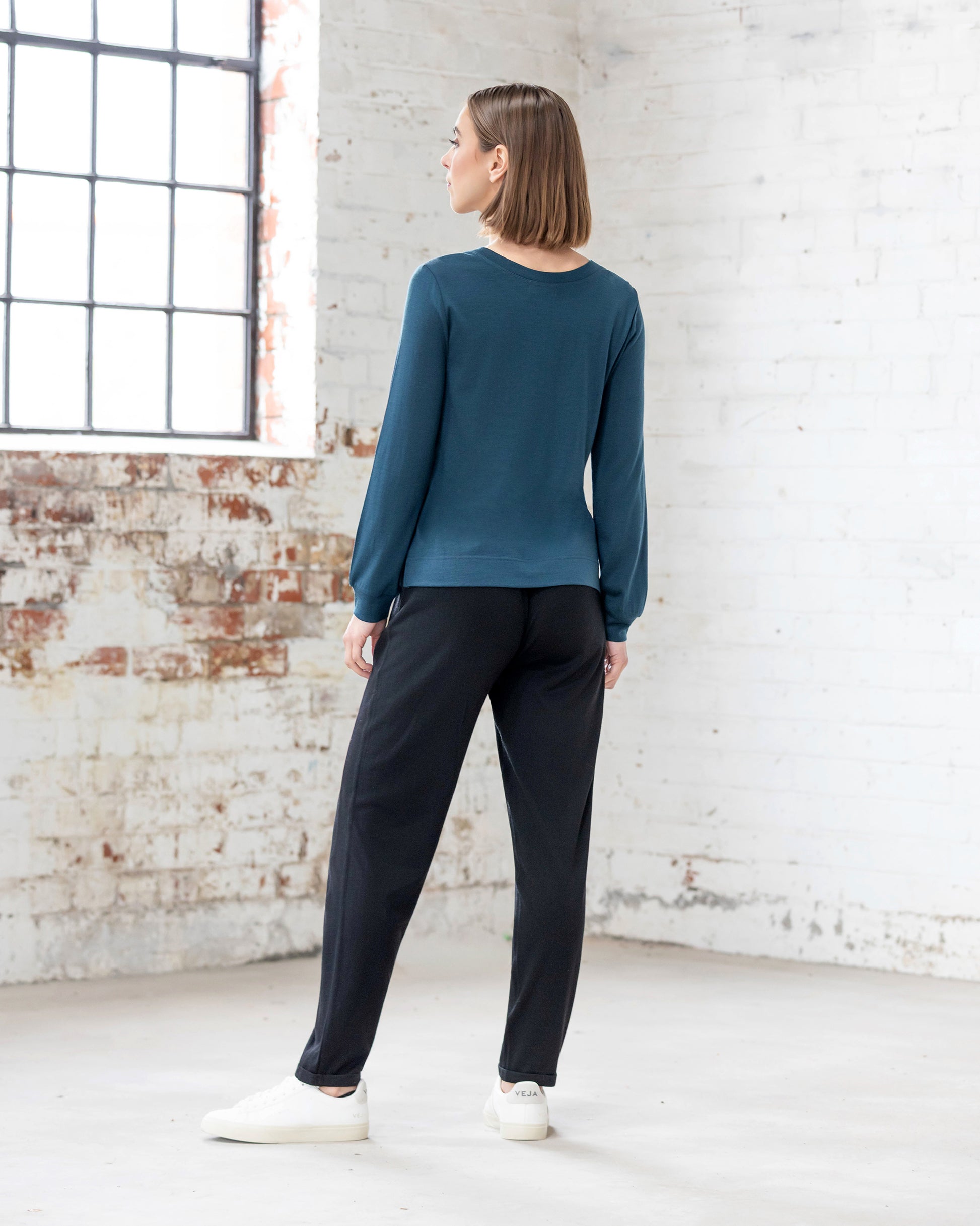 A relaxed merino long‑sleeve top crafted in Dragonfly, a rich dark teal tone. Made from soft single‑jersey merino, this effortless style features a double‑layered front with a crossover hem for subtle shape and refined winter layering. Designed to offer warmth, comfort, and easy movement with an elevated finish.