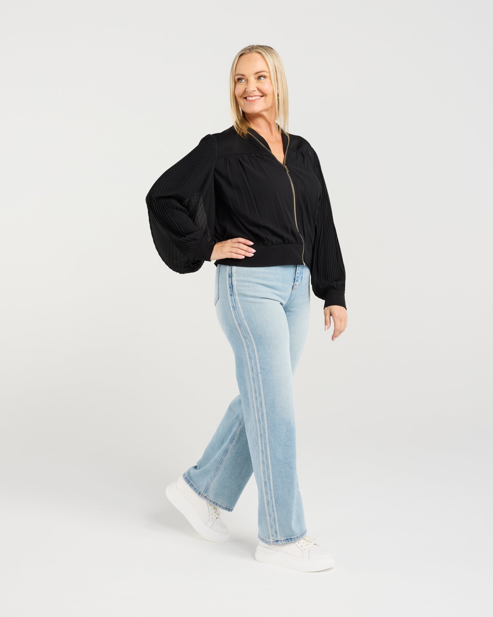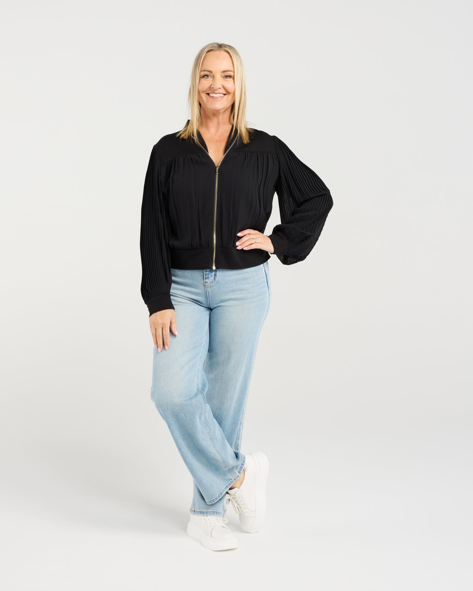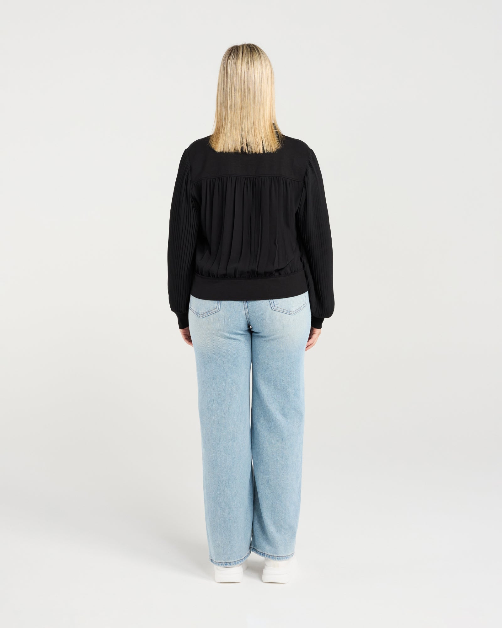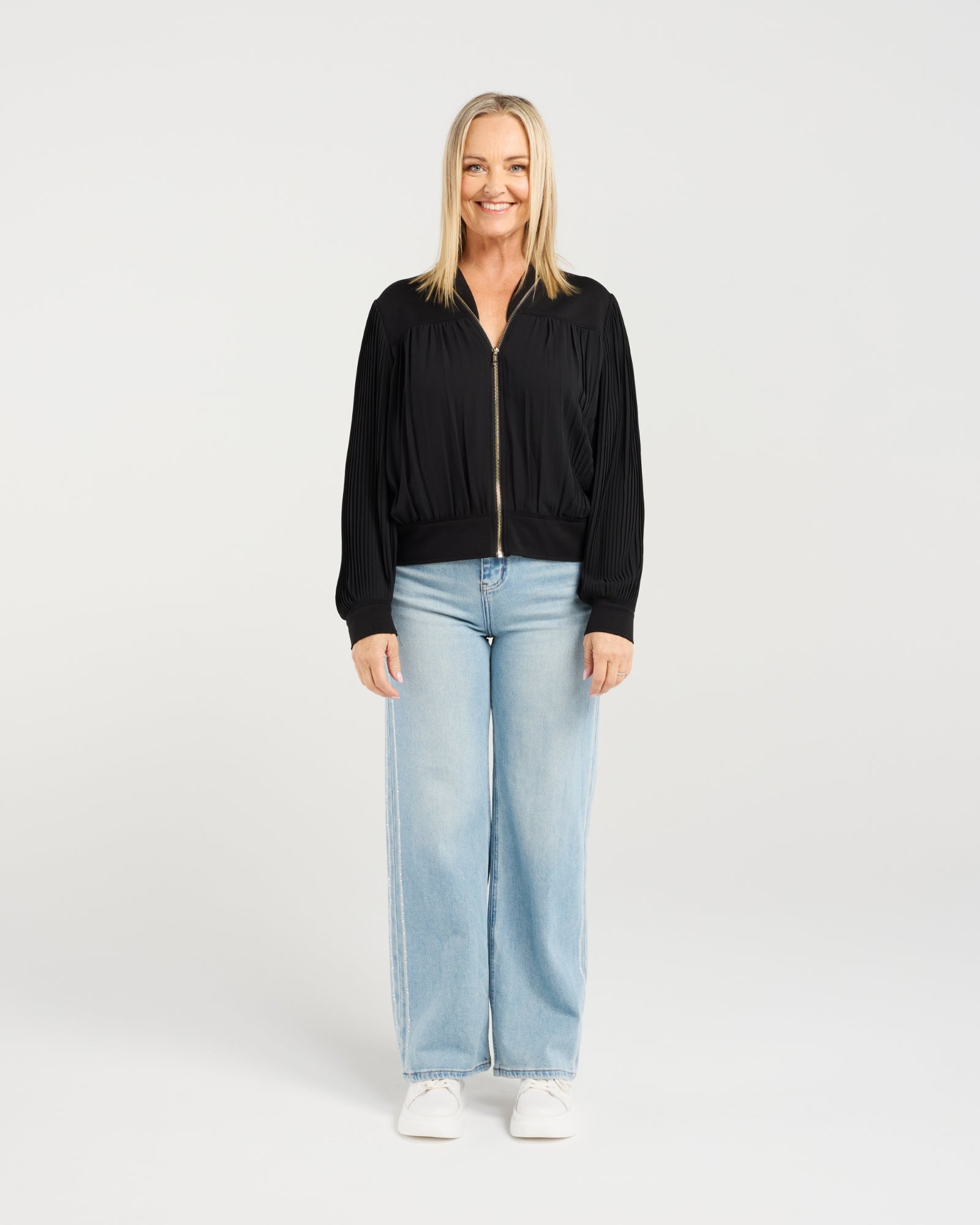 A luxurious bomber jacket designed with an elegant, flowy feel, crafted from beautifully draped chiffon fabric. Voluminous, airy sleeves create soft movement, giving the classic bomber silhouette an elevated and contemporary twist. Finished in timeless black, this standout layering piece pairs effortlessly with any winter look while adding refined visual impact.