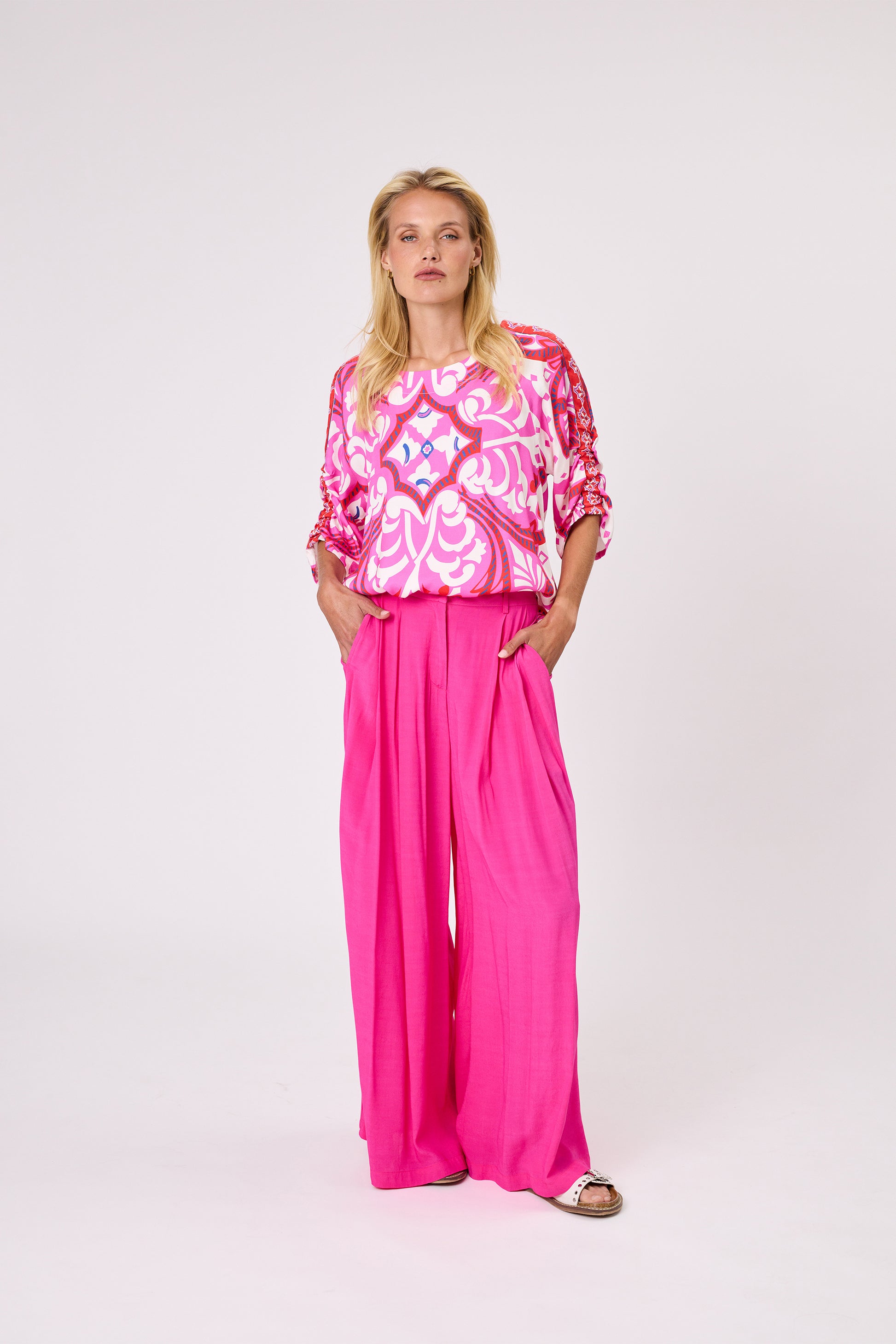 Al lover Saint print top made of soft drapey viscose fabric. Features a round neck, raglan armhole, mid-length sleeves, and elasticated gathering detail.
