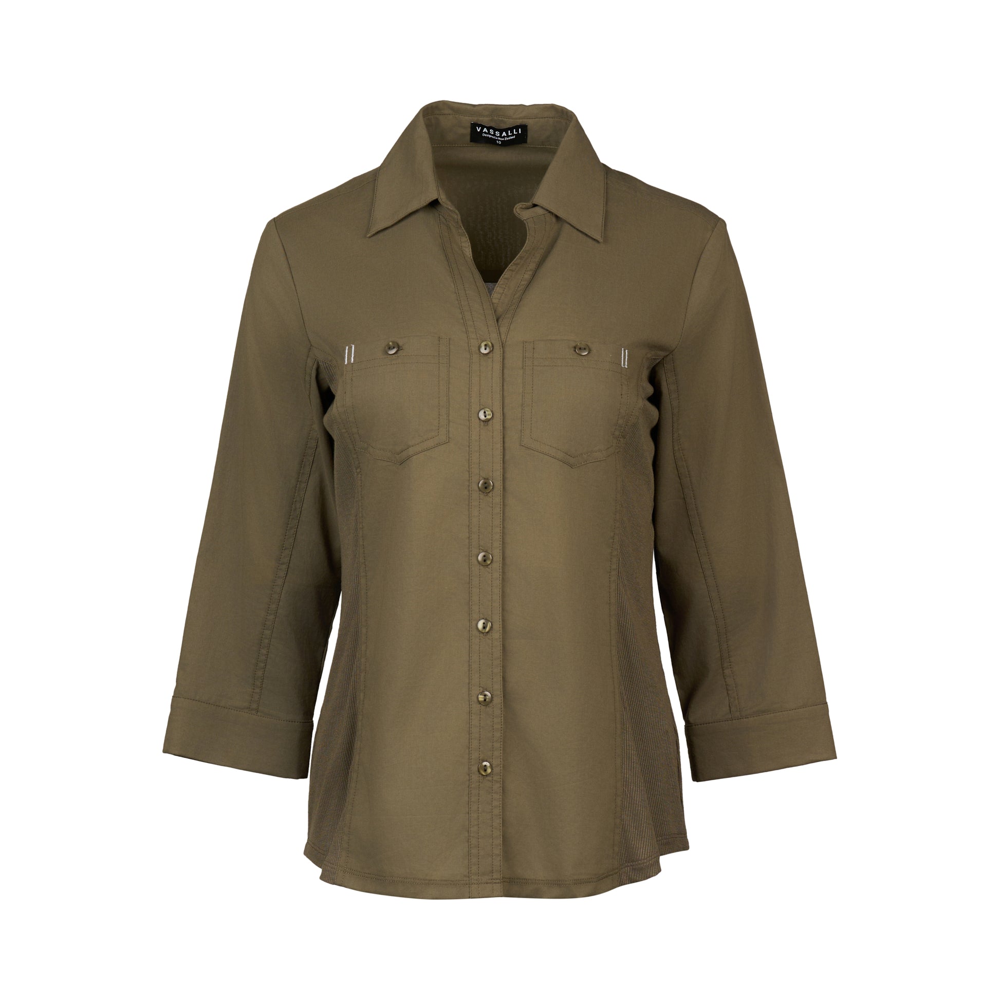 Vassalli Plain Button-Up Shirt with Rib Panels in Olive