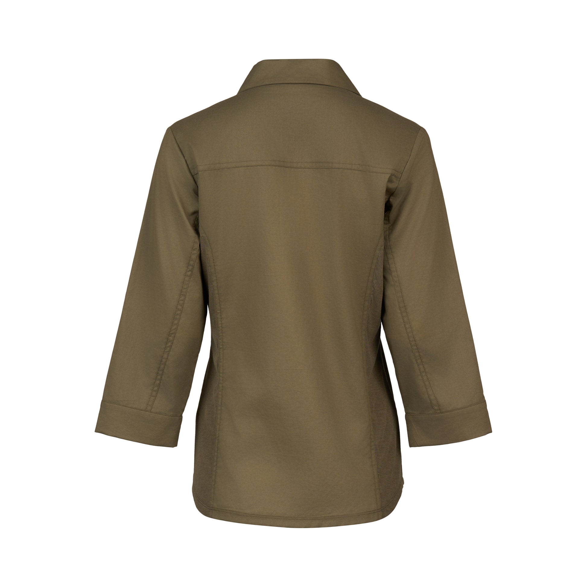 Designed with a shirt collar and classic button-up front, it features matching translucent buttons and front chest pockets with flap and contrast bartack detailing. Finished with 3/4 sleeves, a curved hem, and a back yoke, it’s a polished staple for all-season styling.