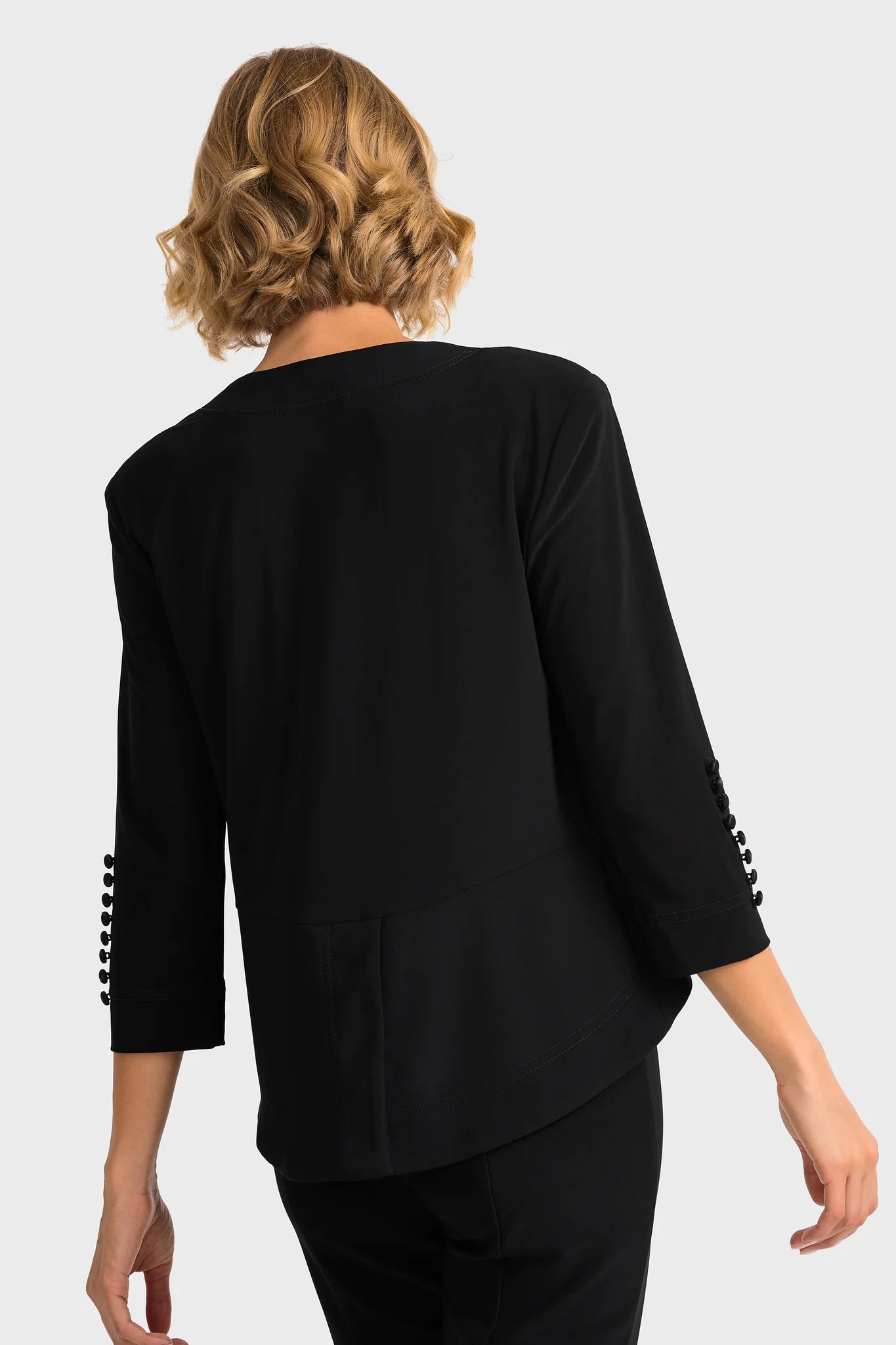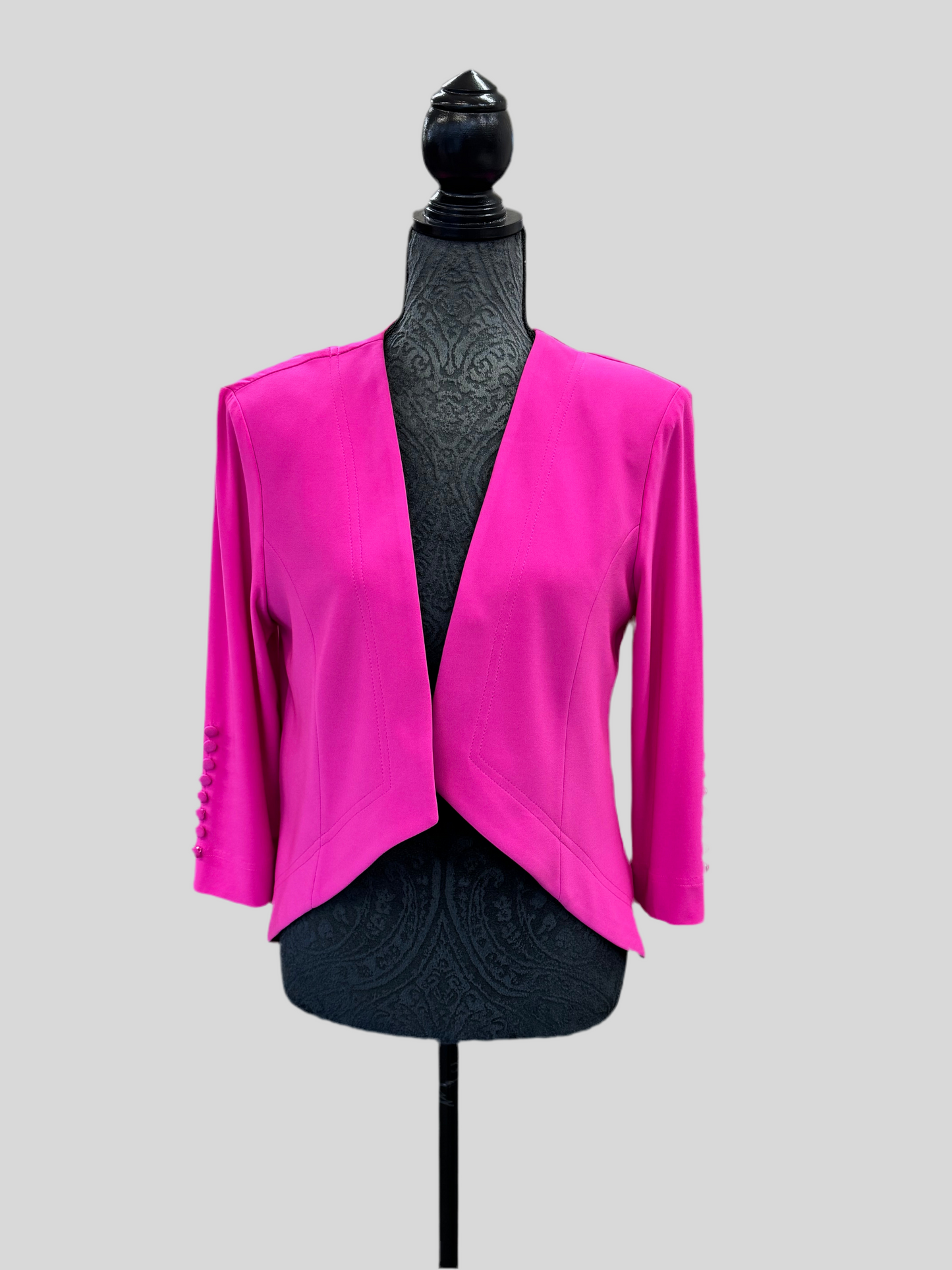 Joseph Ribkoff’s open-front cover up features three-quarter length sleeves with button accents up the cuffs. This garment also includes collarless look and cropped hem hitting at the natural waist in a high-low cut.