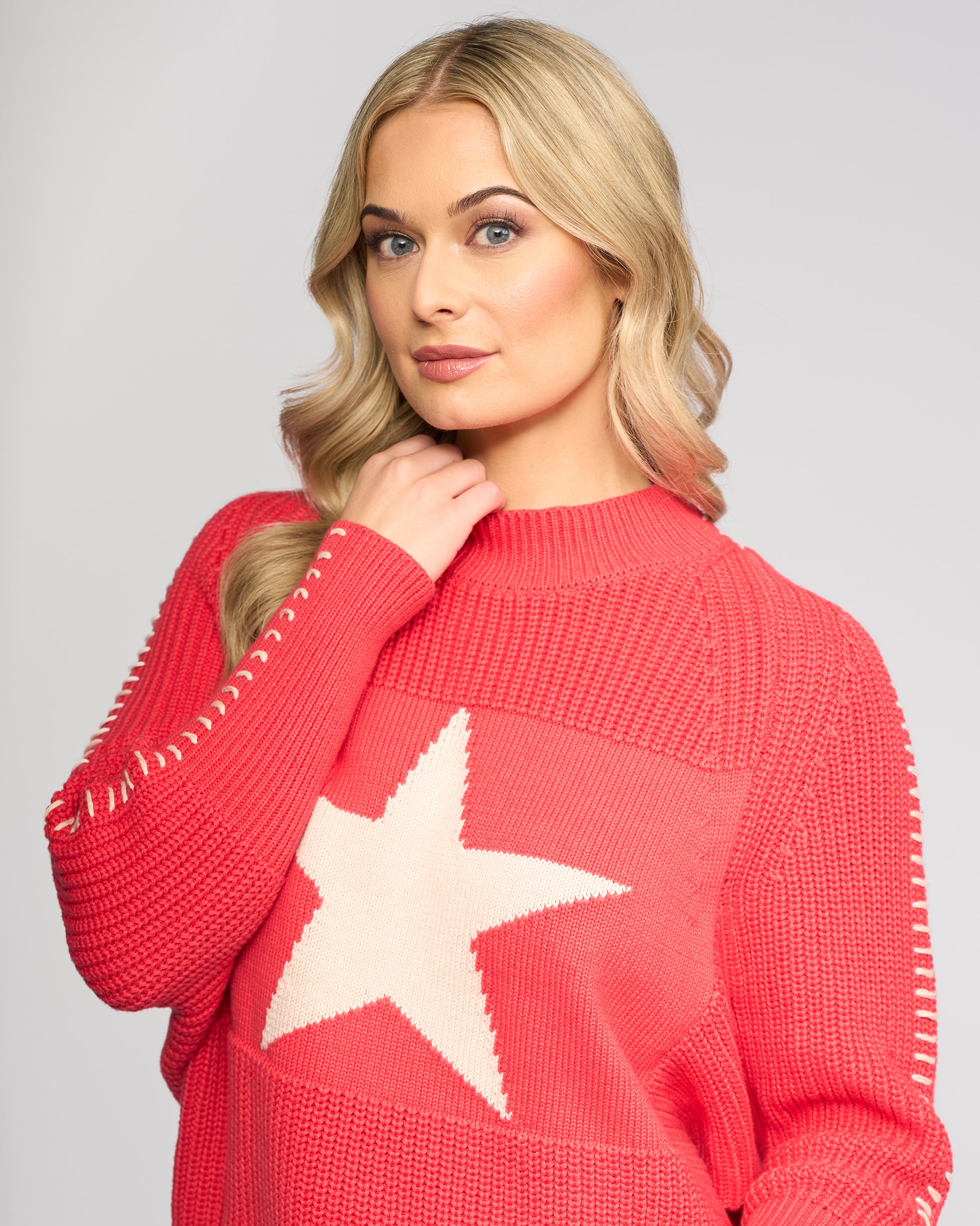An oversized cotton‑cashmere knit sweater in our vibrant Coral colourway — bright, warm, and uplifting. Designed with a relaxed drop‑shoulder sleeve for an easy, slouchy silhouette, this style features rib‑knit construction throughout and is finished with a bold white star on the centre front. Contrast white stitching runs along the sleeve seams from shoulder to cuff, adding subtle definition. Slim ribbed cuffs and a ribbed neckline complete the look with a clean, refined finish. Knitted from cotton with a touch of cashmere, it offers a soft, comfortable feel perfect for everyday wear.