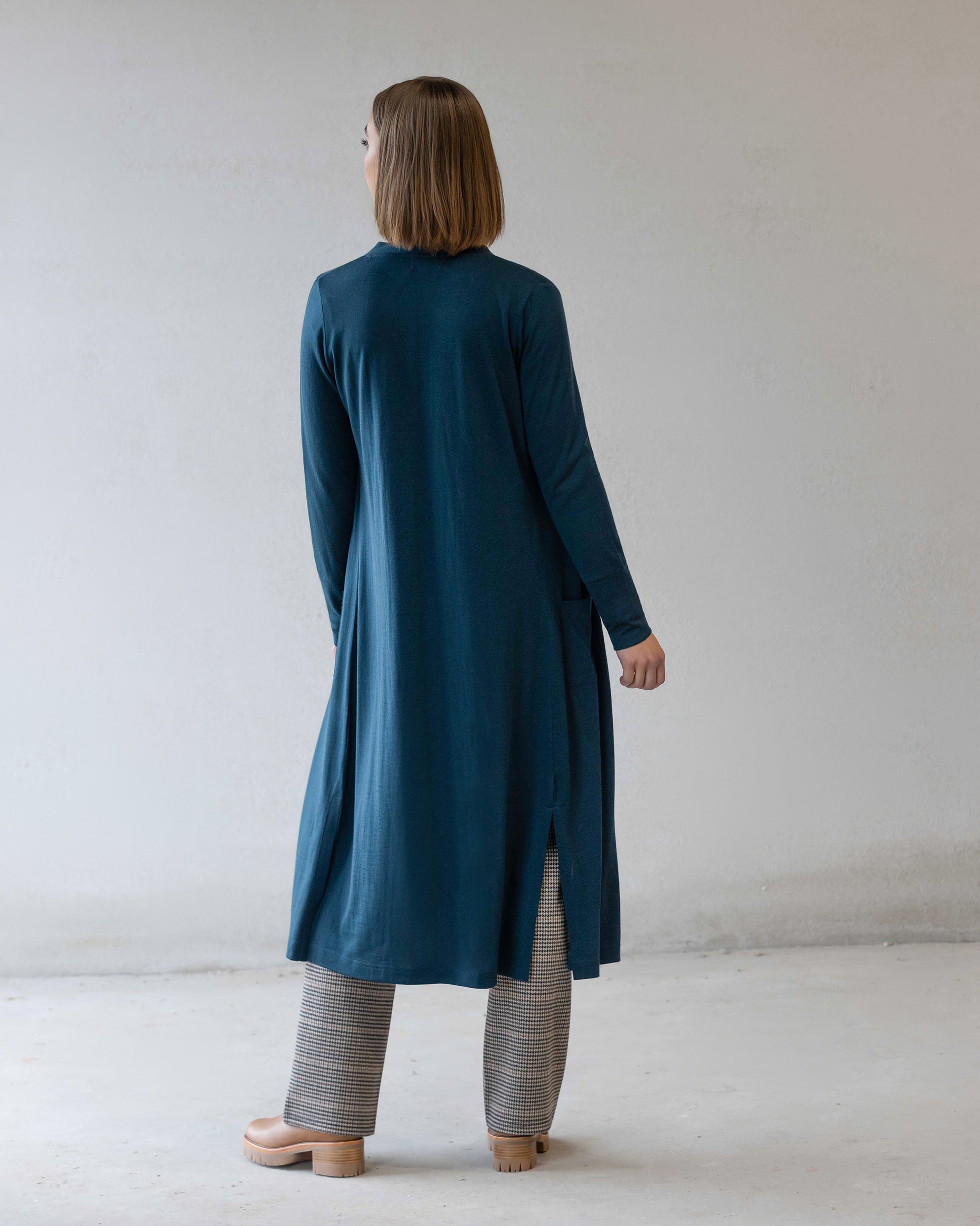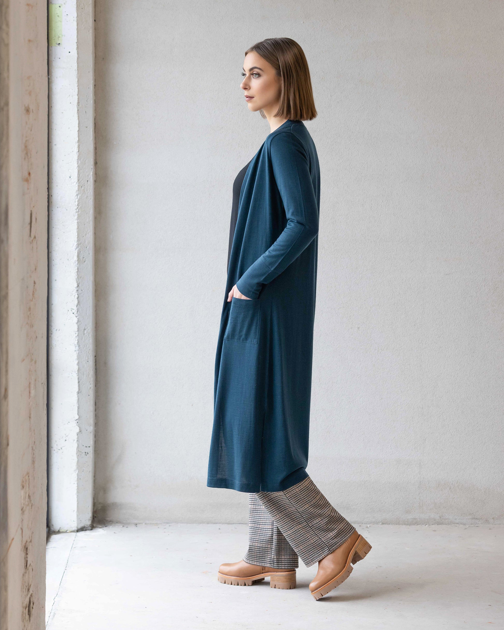 A long merino coatigan crafted in Dragonfly, a deep dark teal tone. Designed with a sleek, slim fit, this style is made from soft single‑jersey merino to create a polished yet comfortable layering piece. Offering the ease of a cardigan with the refinement of a lightweight coat, it’s an effortless option for elevated everyday dressing.