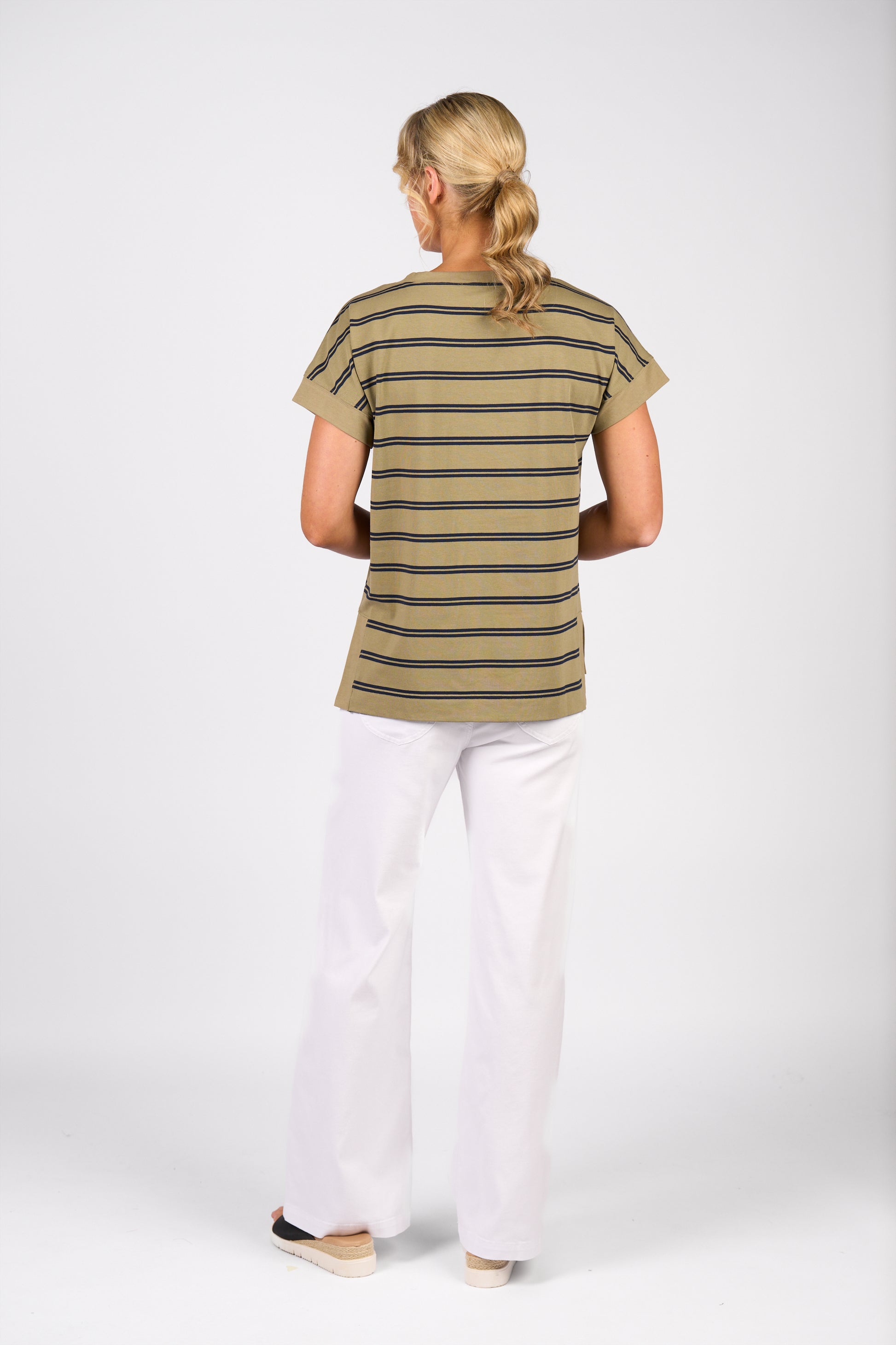Vassalli Drop Sleeve Top with Stepped Hem – Sage Stripe