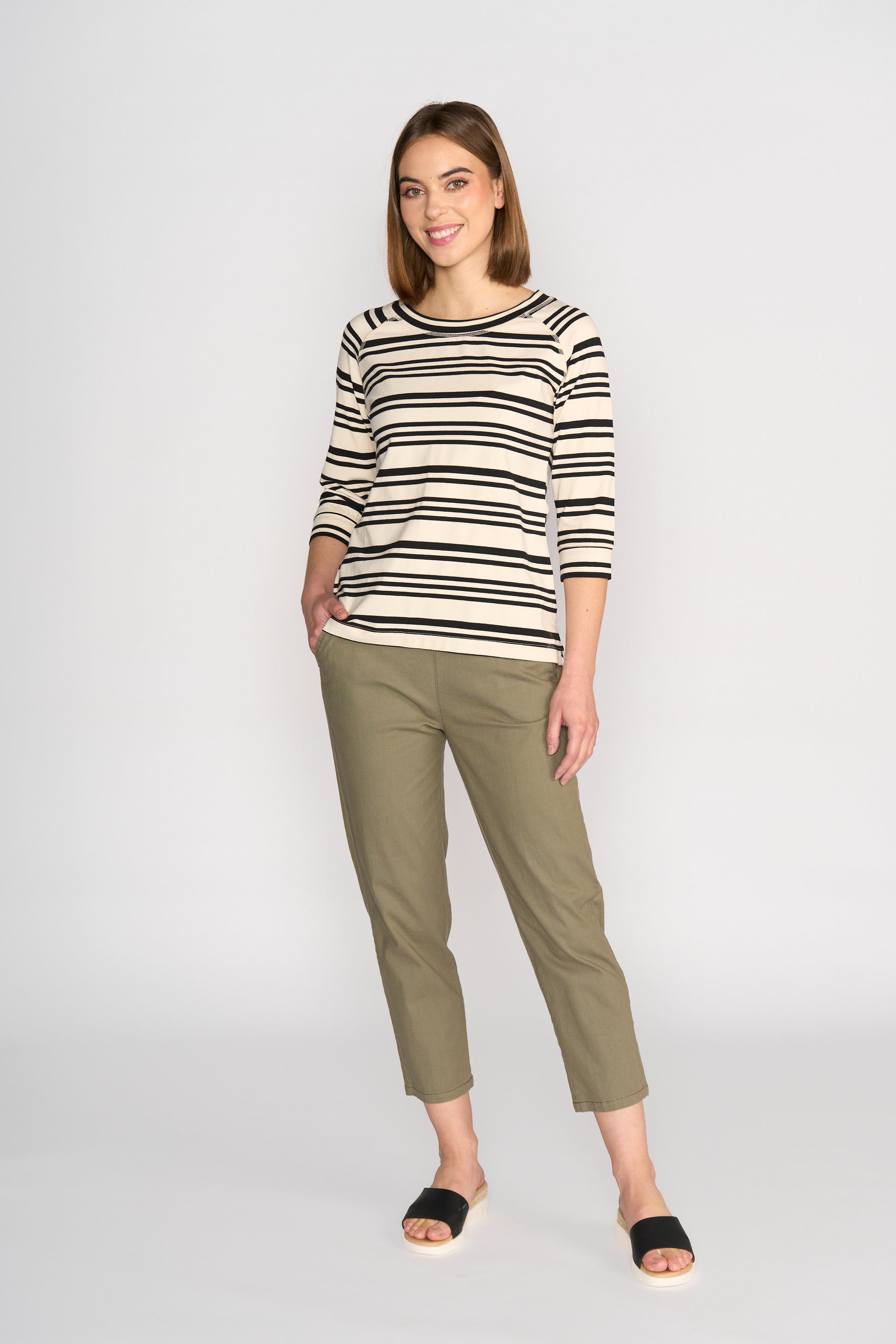 Bright and breezy, the Ecru/black/stripe Top by Vassalli is made from soft stretch cotton jersey for breathable comfort and a relaxed drape. Featuring a wide round boat neckline and 3/4 length raglan sleeves, this everyday essential offers easy shape and timeless appeal.