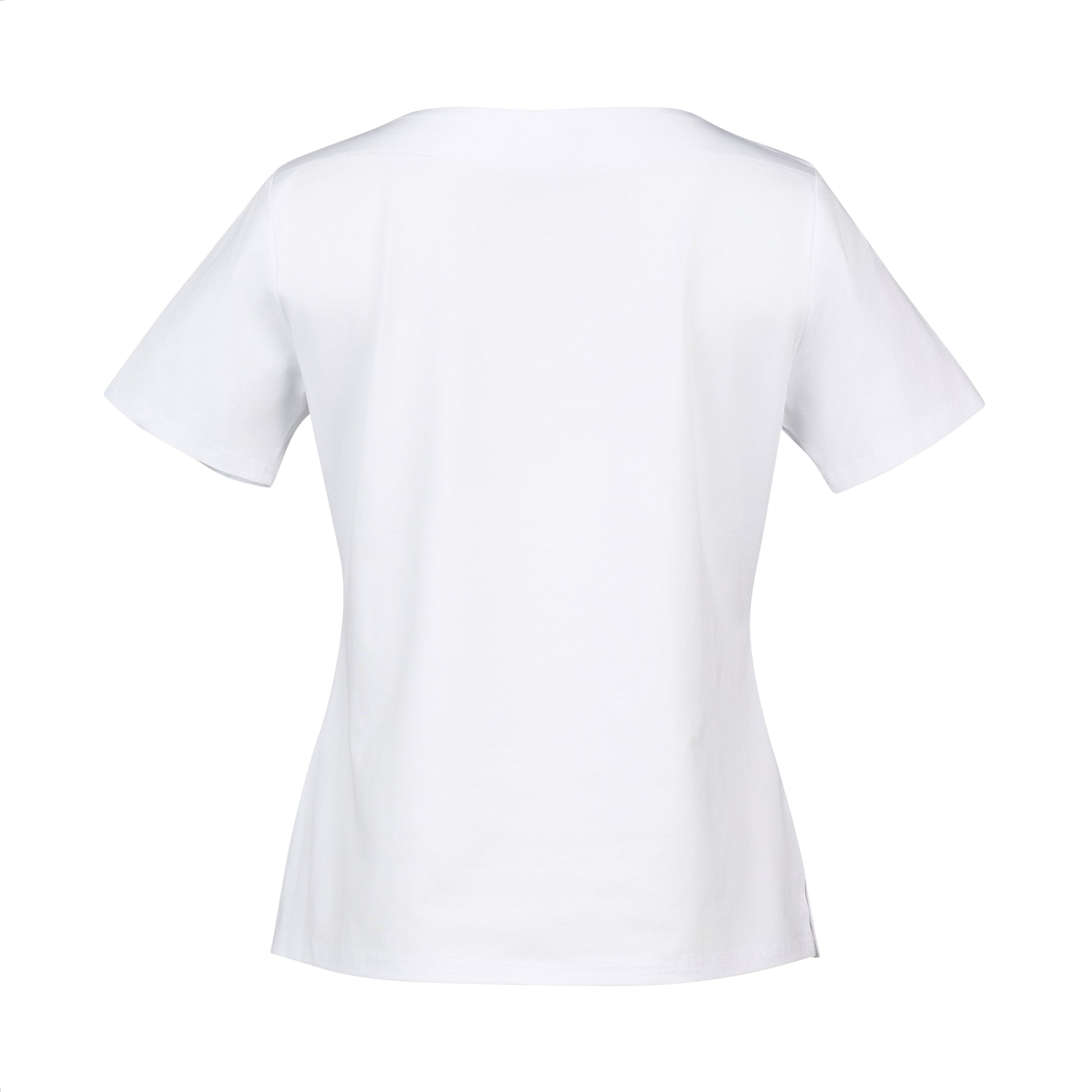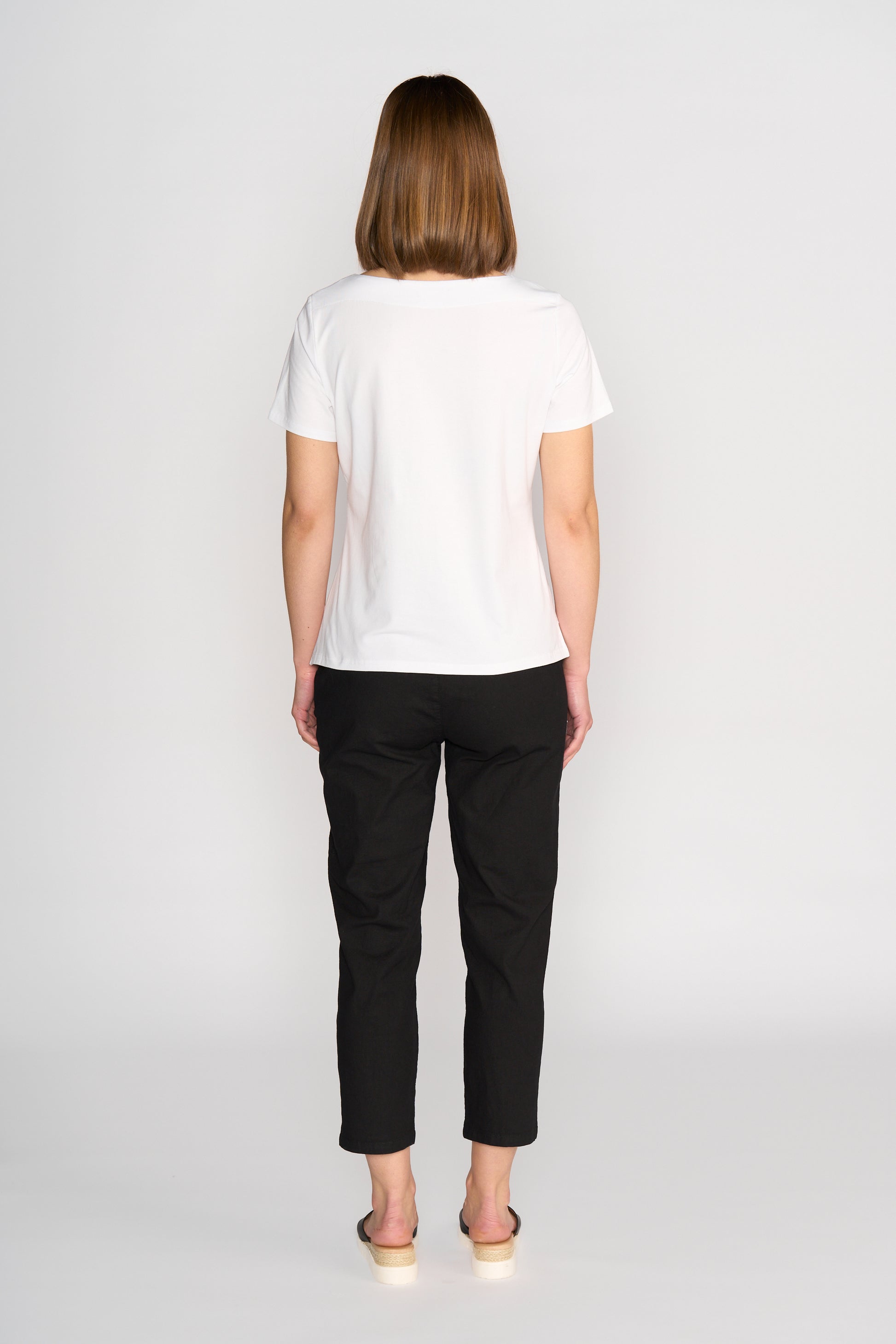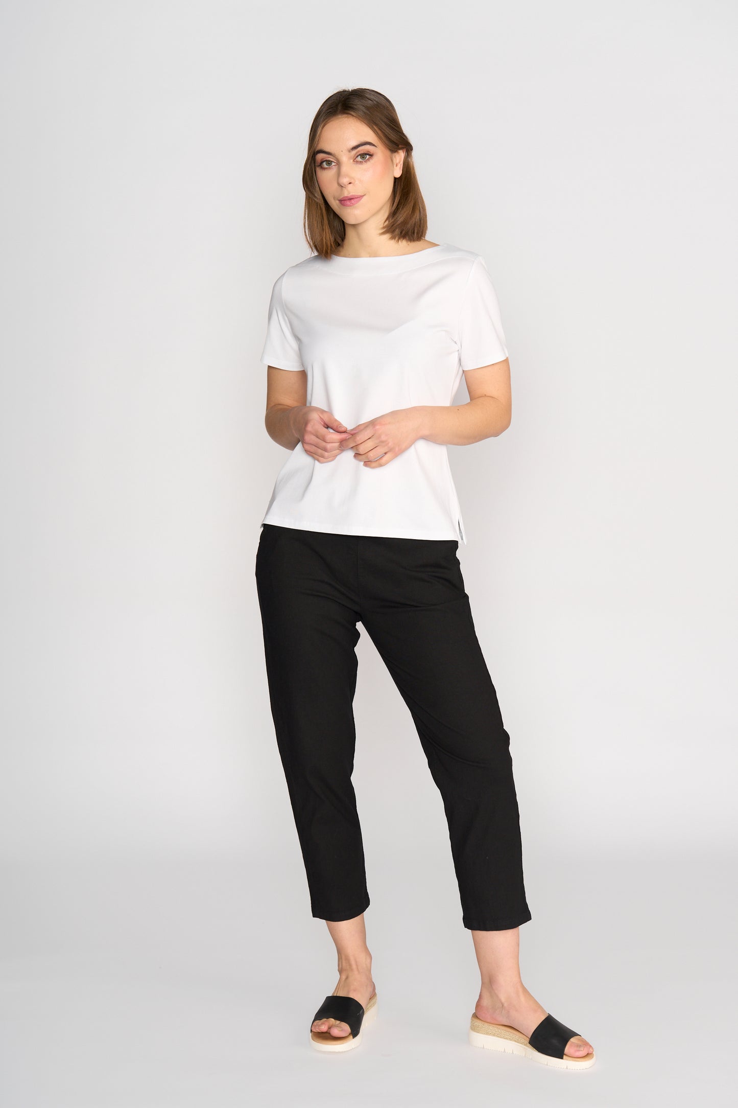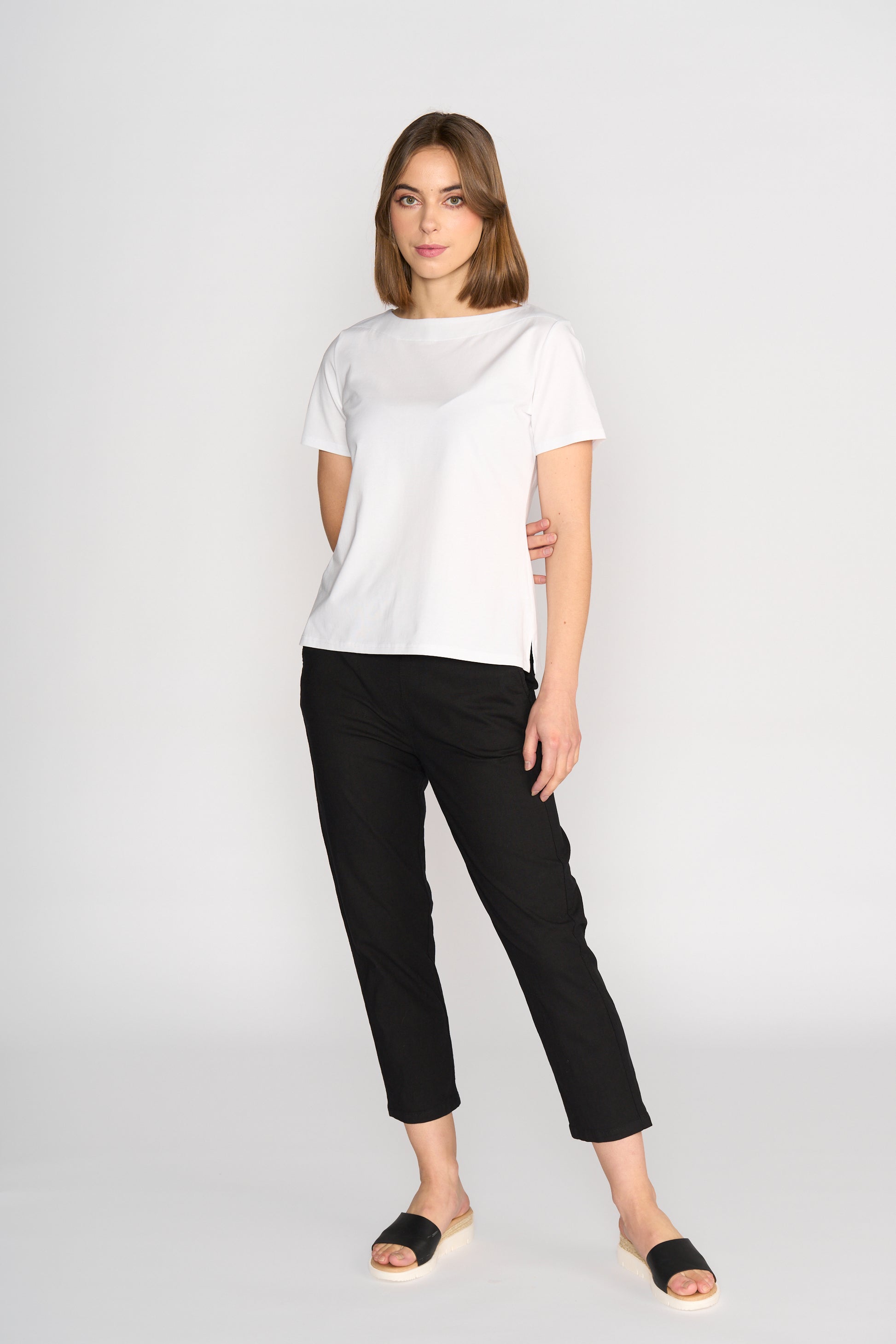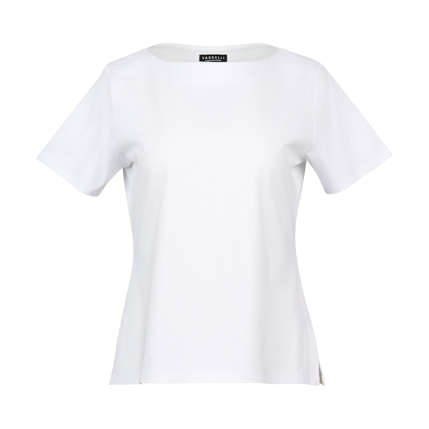 Simple yet refined, the White Top by Vassalli is crafted from soft stretch cotton jersey for everyday comfort. Featuring a classic boat neckline with subtle curved stitching detail, this relaxed silhouette delivers timeless polish with ease.