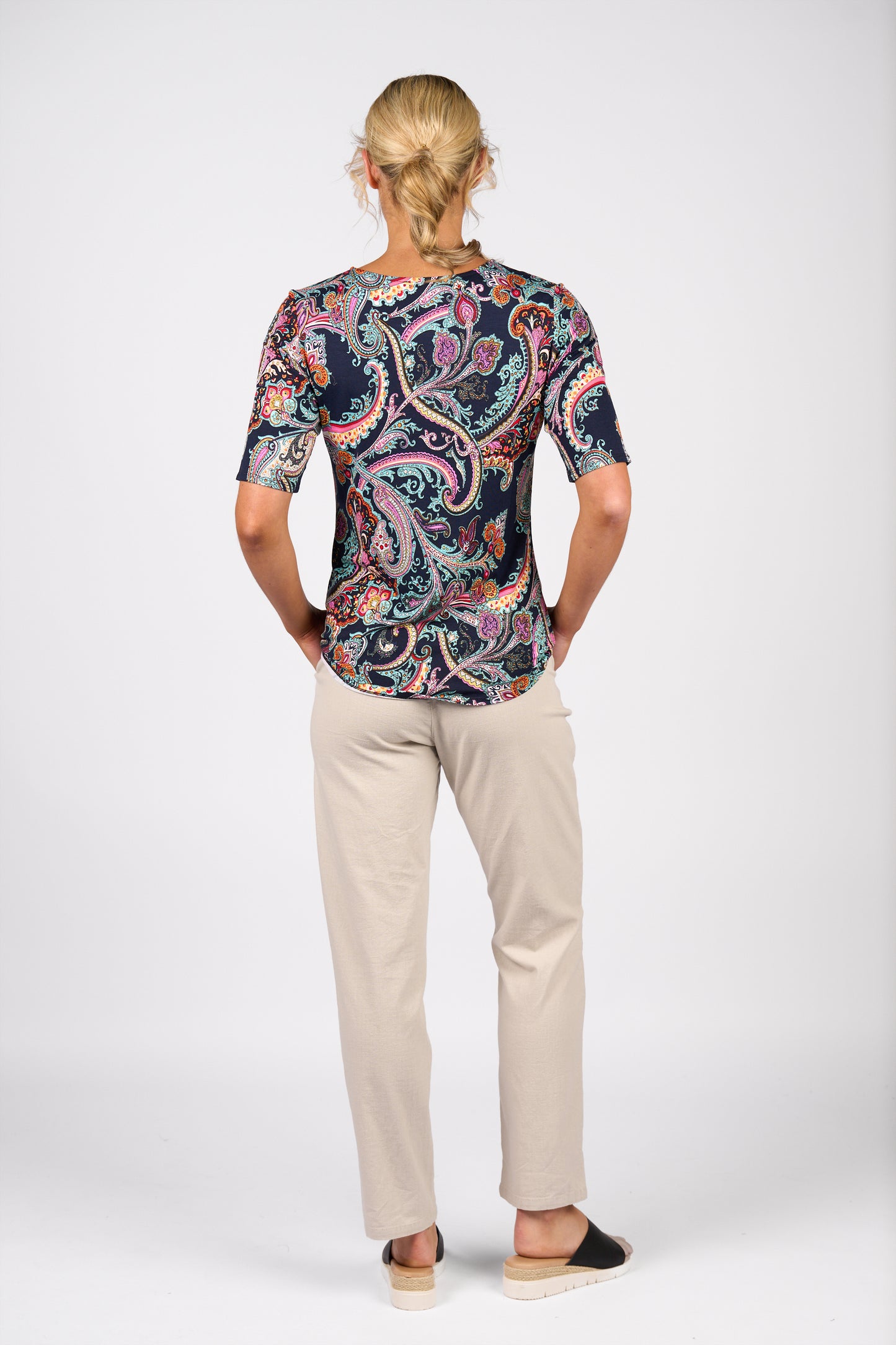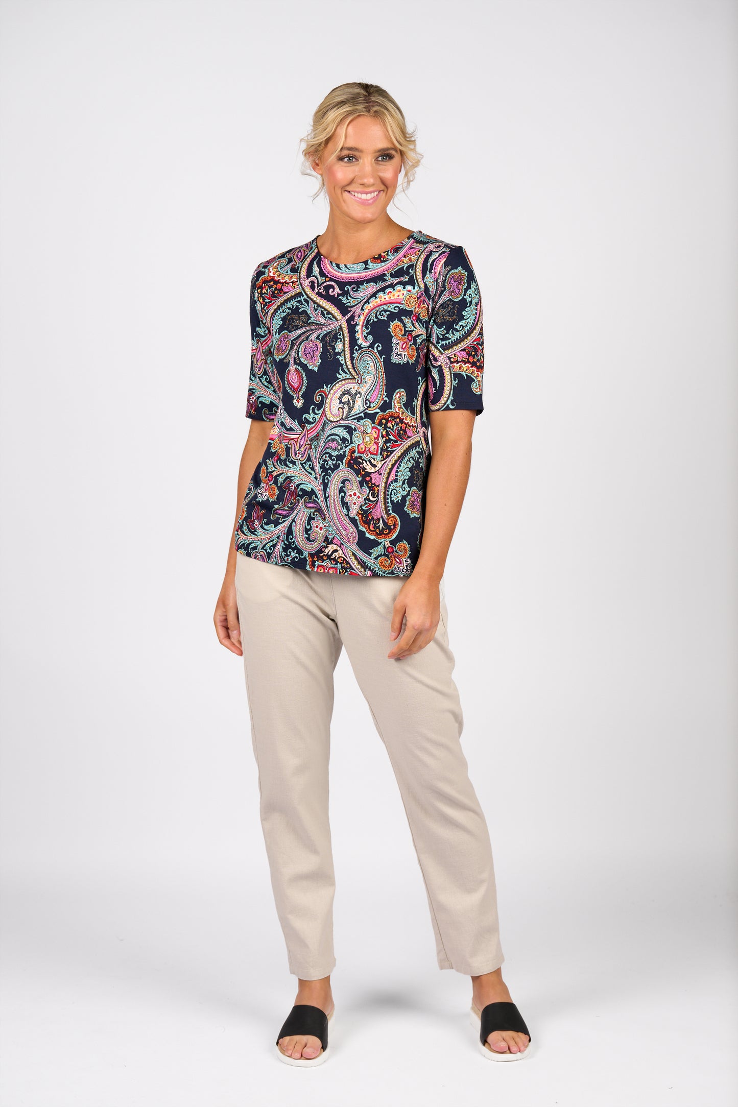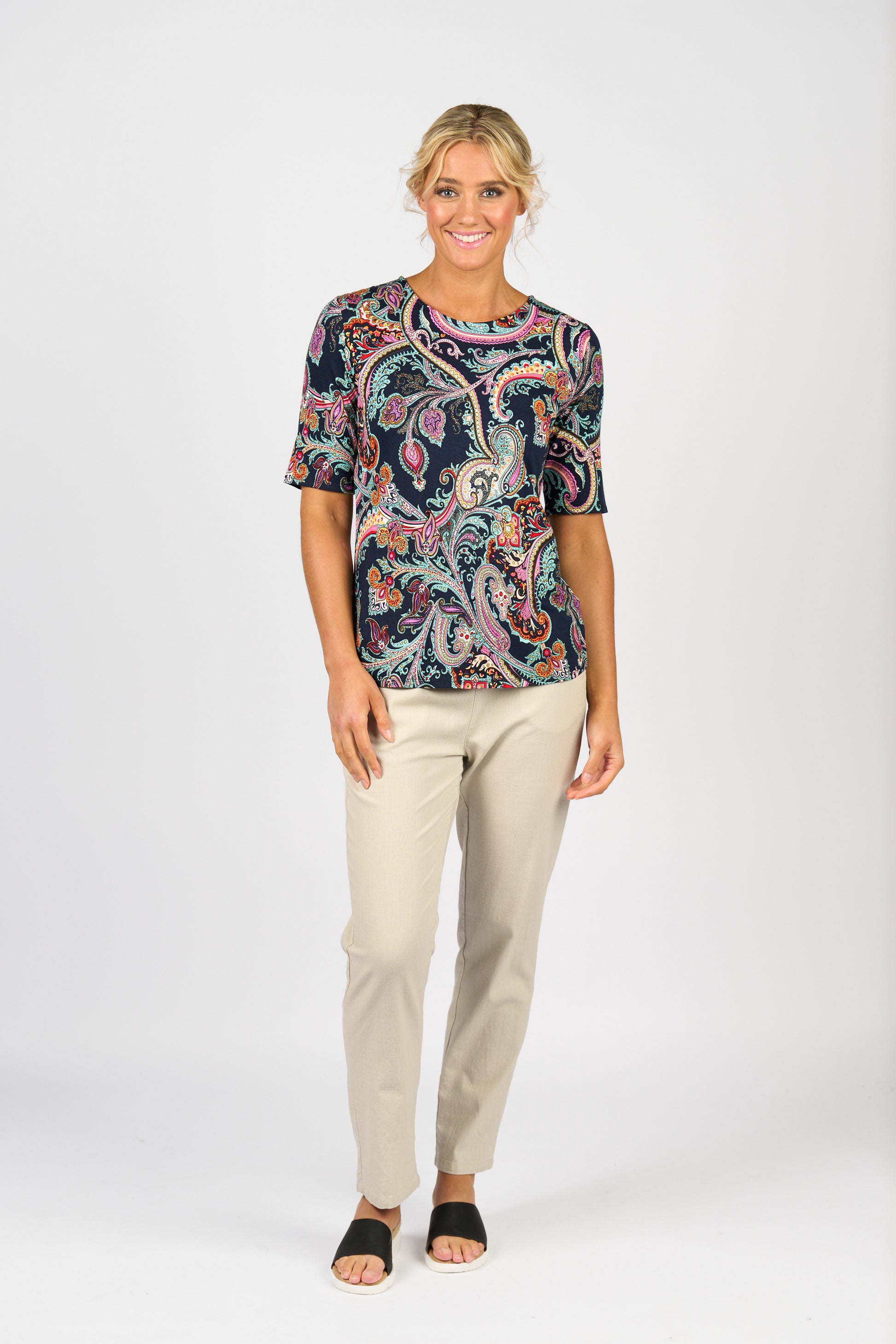 Add subtle print and soft comfort to your wardrobe with the Persia Top by Vassalli, crafted from stretch rayon jersey for a smooth, breathable feel. This relaxed 3/4 sleeve silhouette features a classic round neckline and gently curved hem to enhance shape and movement.