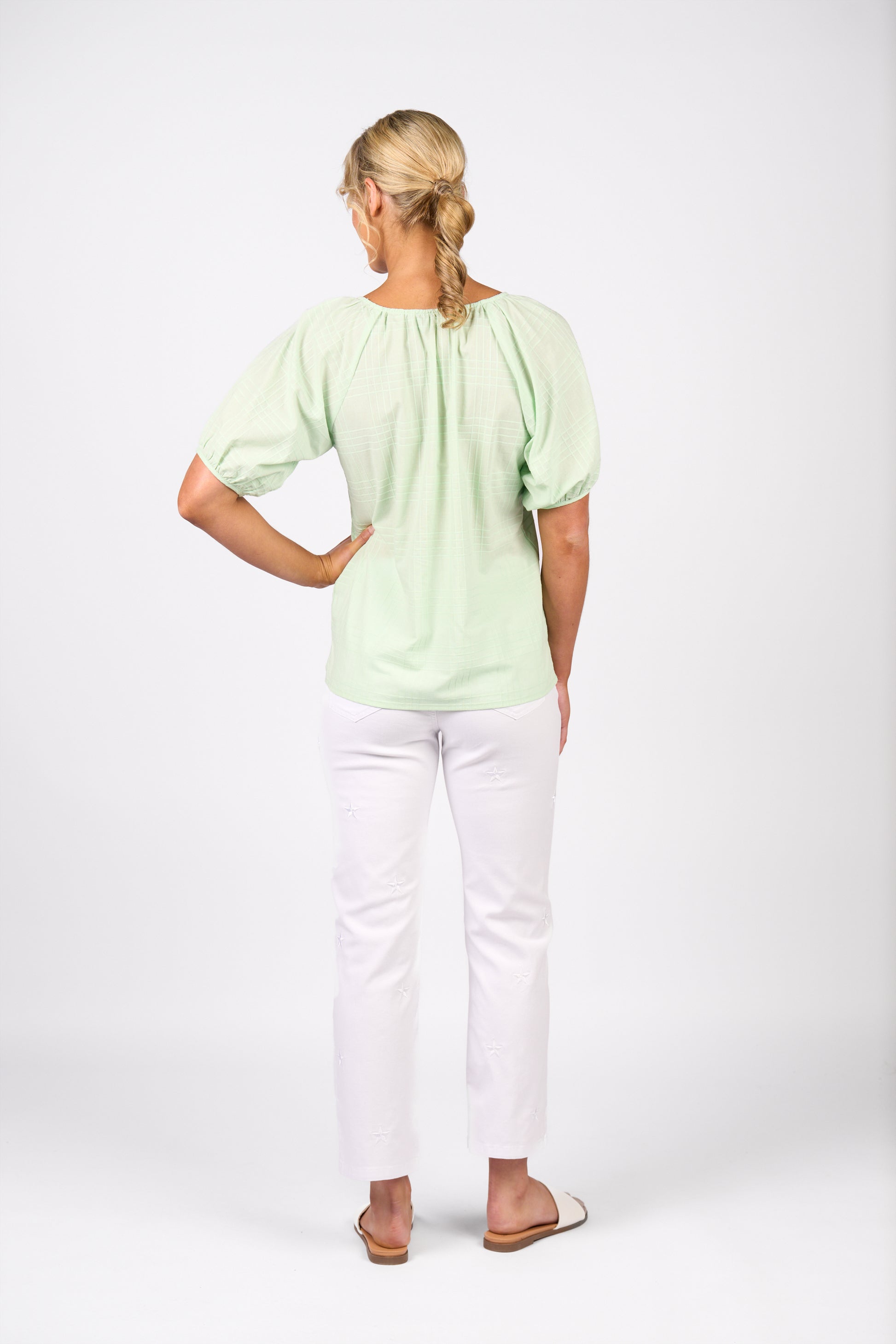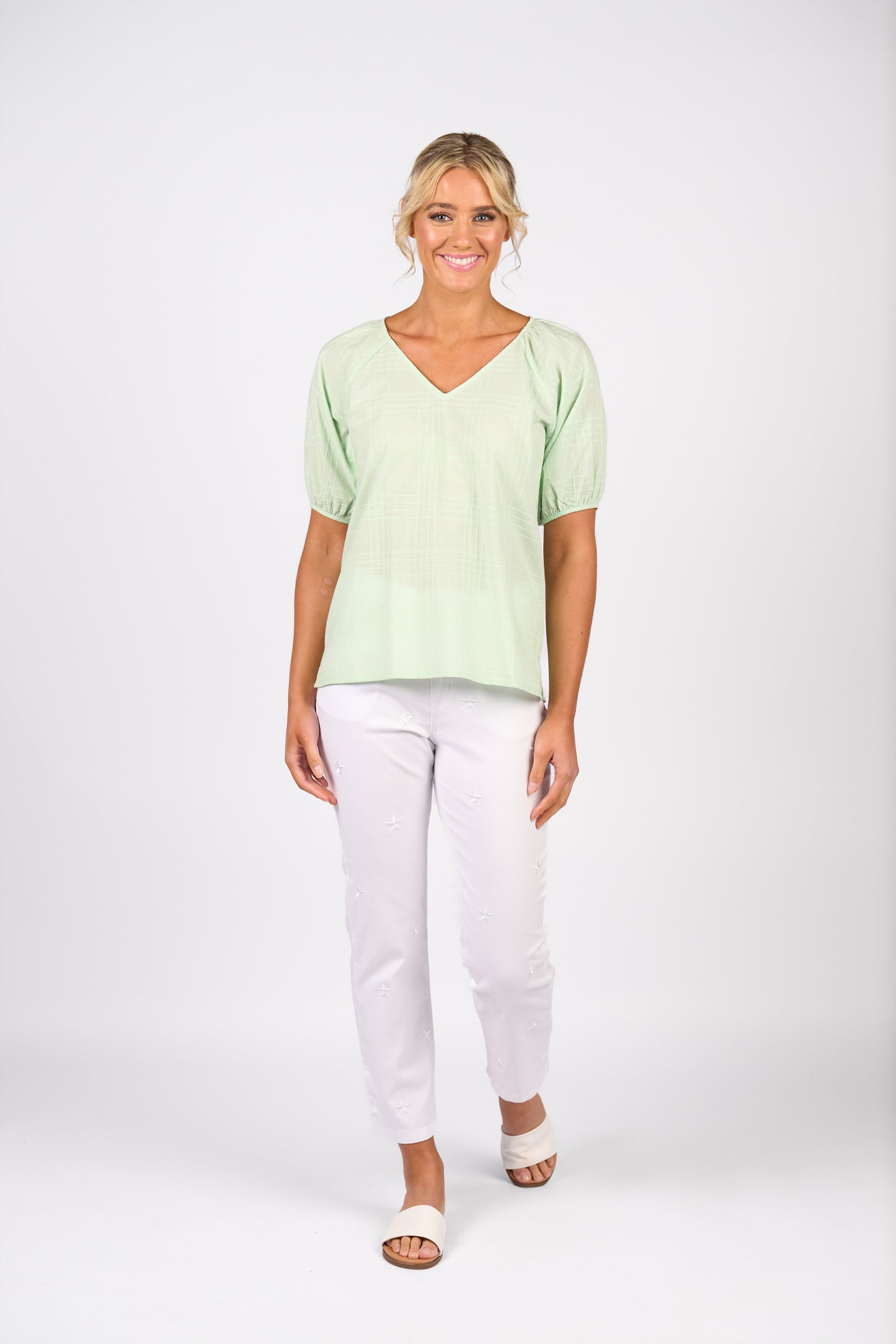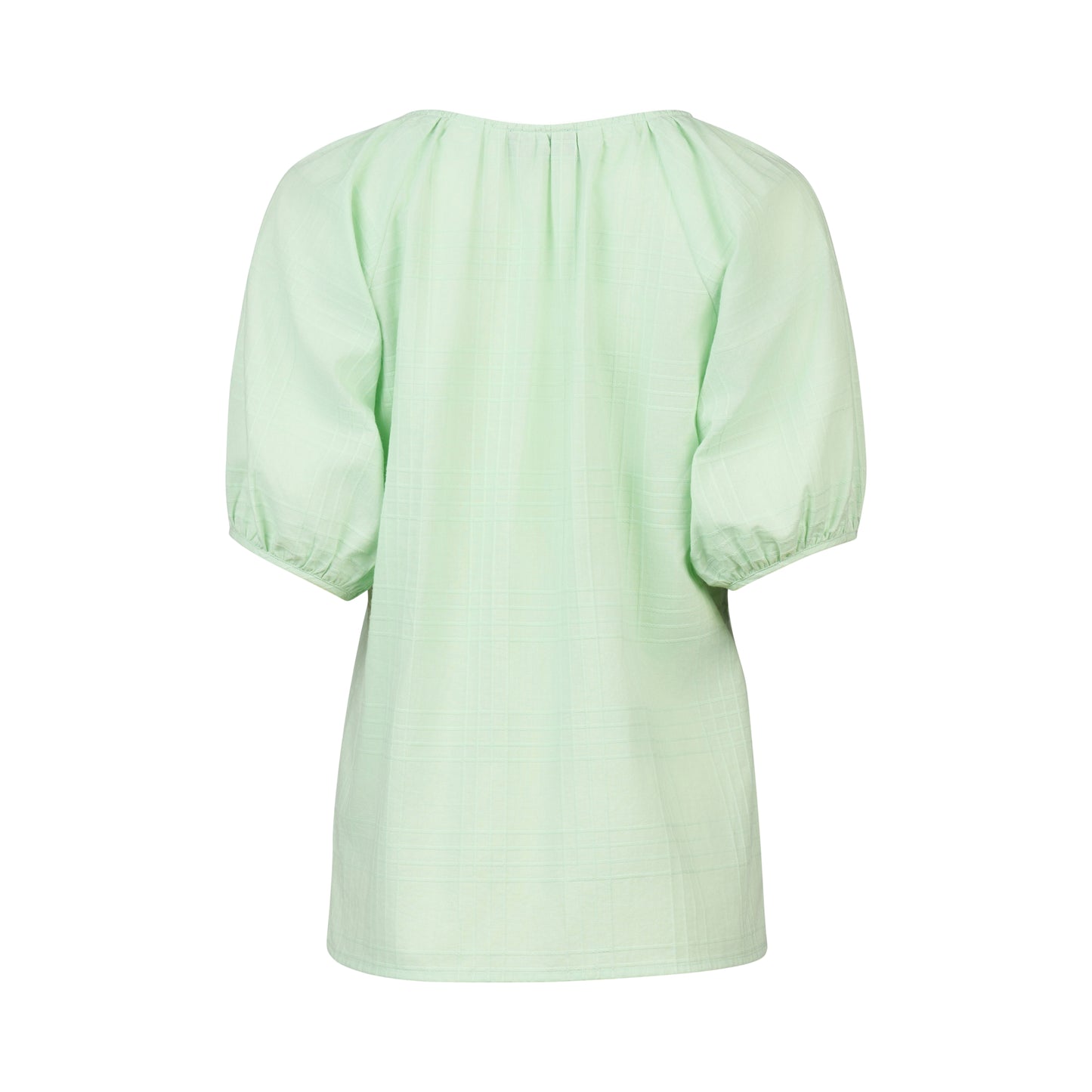 Refresh your wardrobe with the Mint Top by Vassalli, crafted from lightweight 100% cotton with a textured checkered pattern for subtle interest. The relaxed silhouette features a flattering V-neckline and floaty raglan puff sleeves with bound cuffs for a soft, feminine touch.