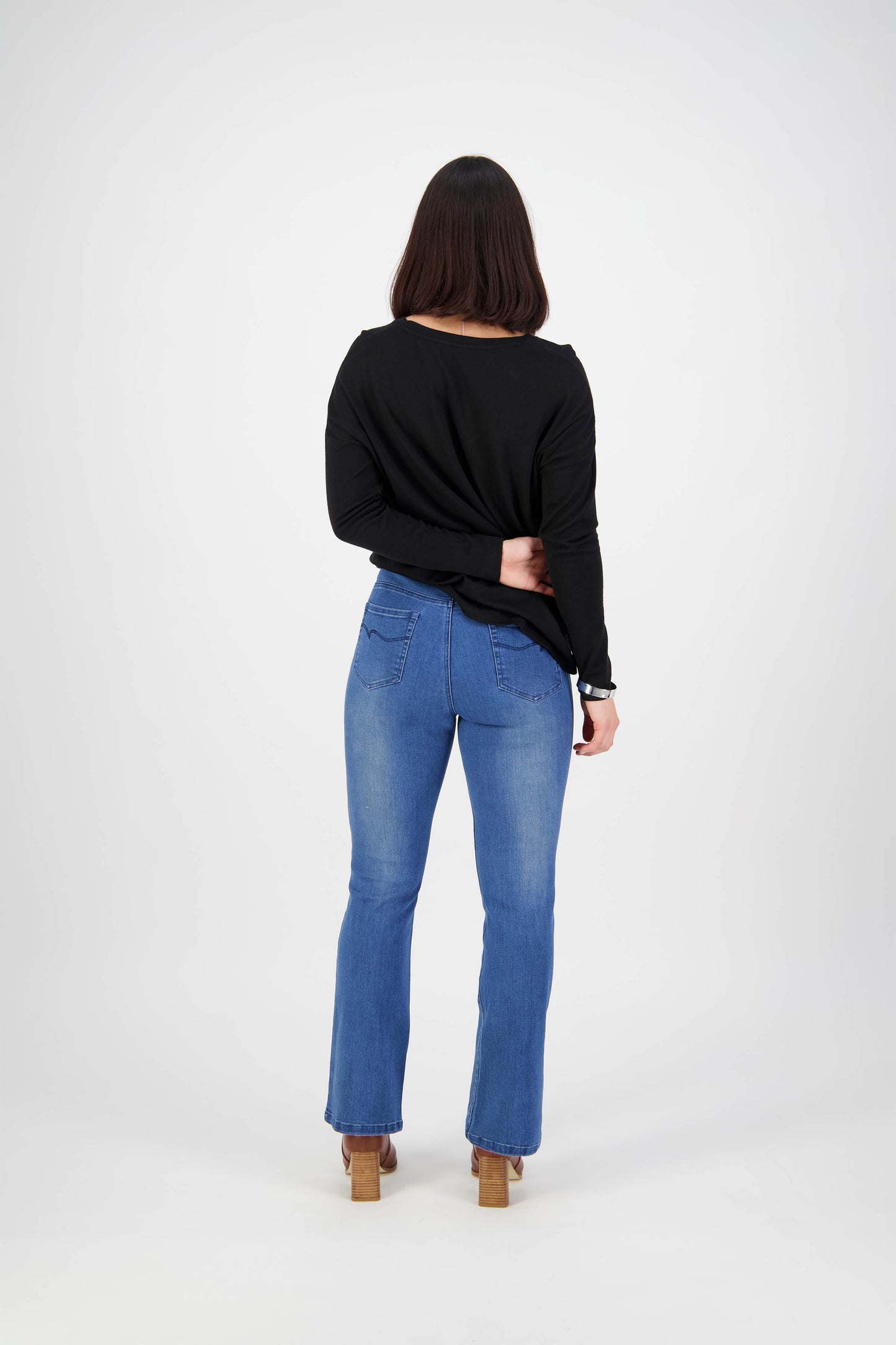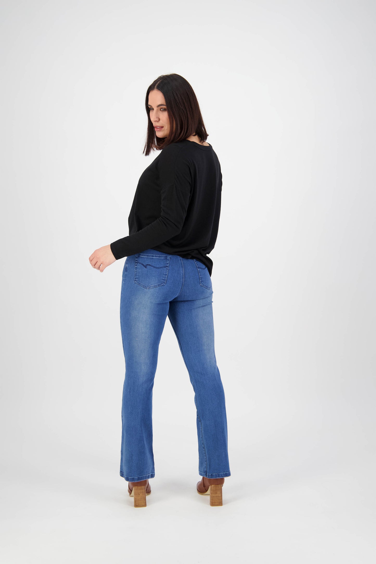 Details: High rise bootleg jean with a waistband featuring metal 'V' logo silver shank button closure, 2 front belt loops and 3 back belt loops. Zip fly. Two front cutaway pockets with silver 'V' logo rivets. Front angled coin pocket on wearer's right-hand side with silver 'V' logo rivets. Back patch pockets with 'V' stitching detail. 'Vassalli' embroidery above wearer's right-hand back pocket. Front and back wash detail.